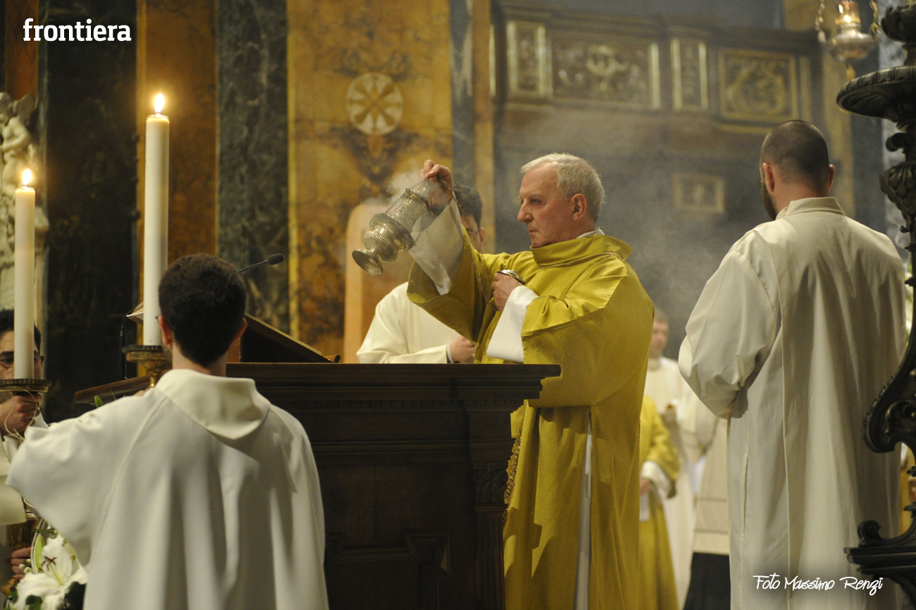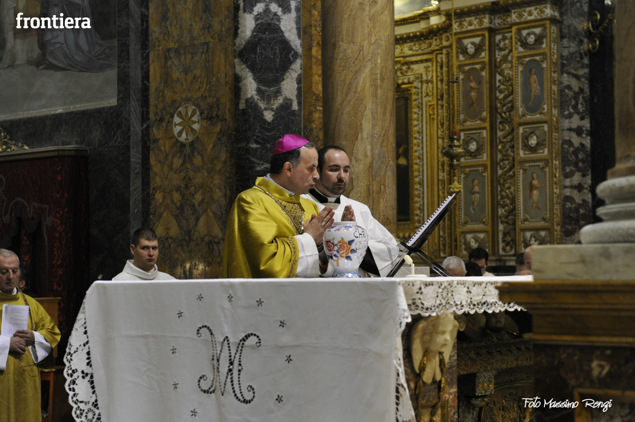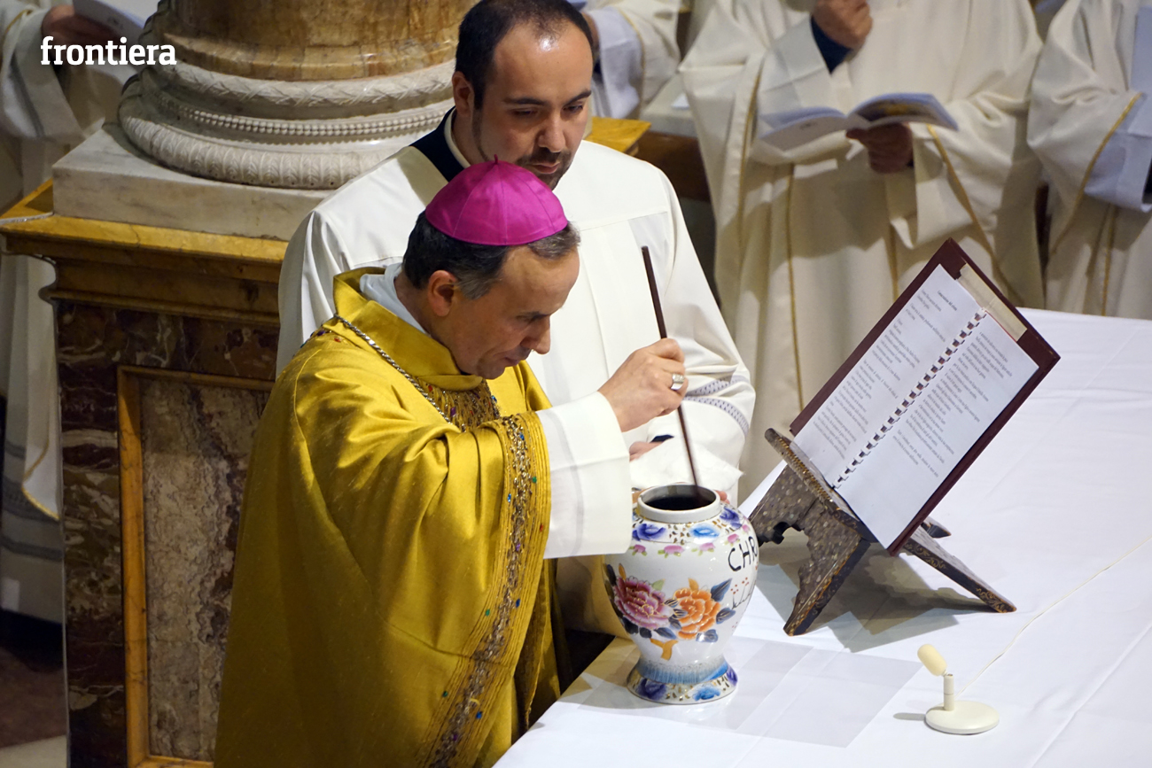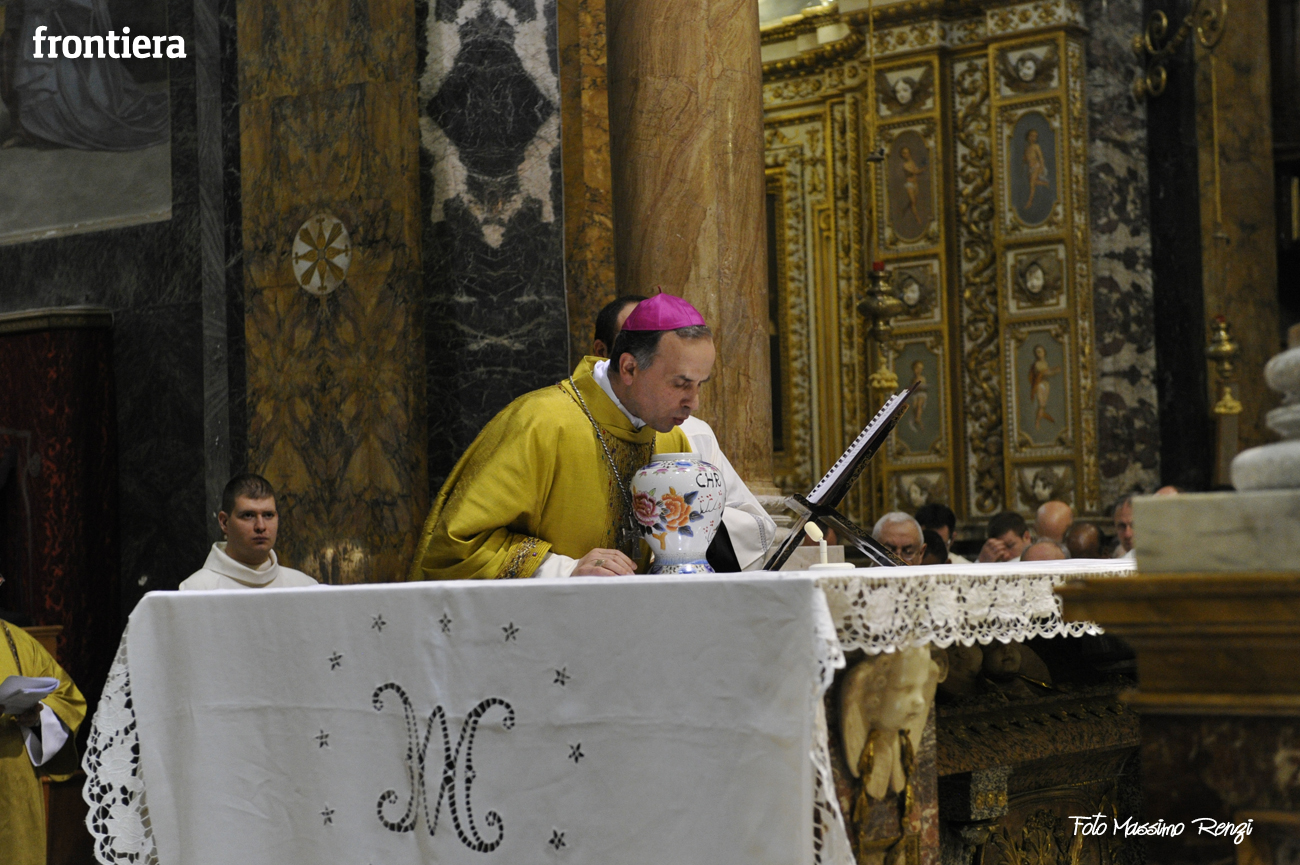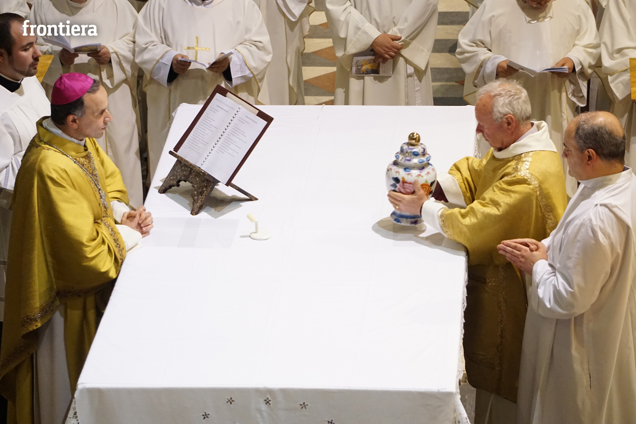 È stata celebrata in Santa Maria nel pomeriggio del 23 marzo, Mercoledì Santo, la Messa del Crisma. Non soltanto i presbiteri della diocesi, ma anche tantissimi fedeli laici hanno preso parte alla liturgia solenne: i primi in forza del sacerdozio ministeriale, tutti quanti in virtù della consacrazione battesimale.