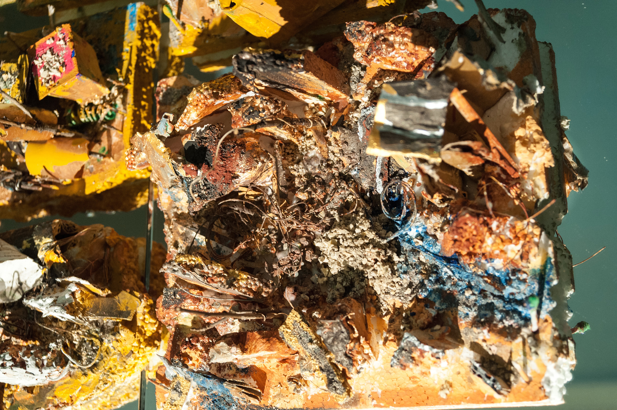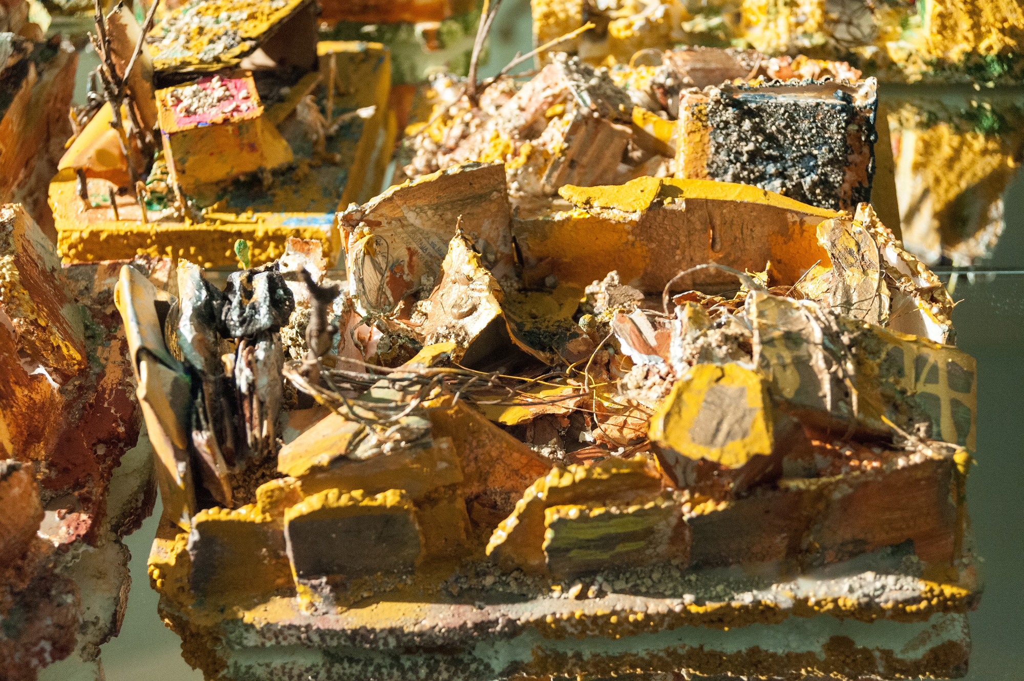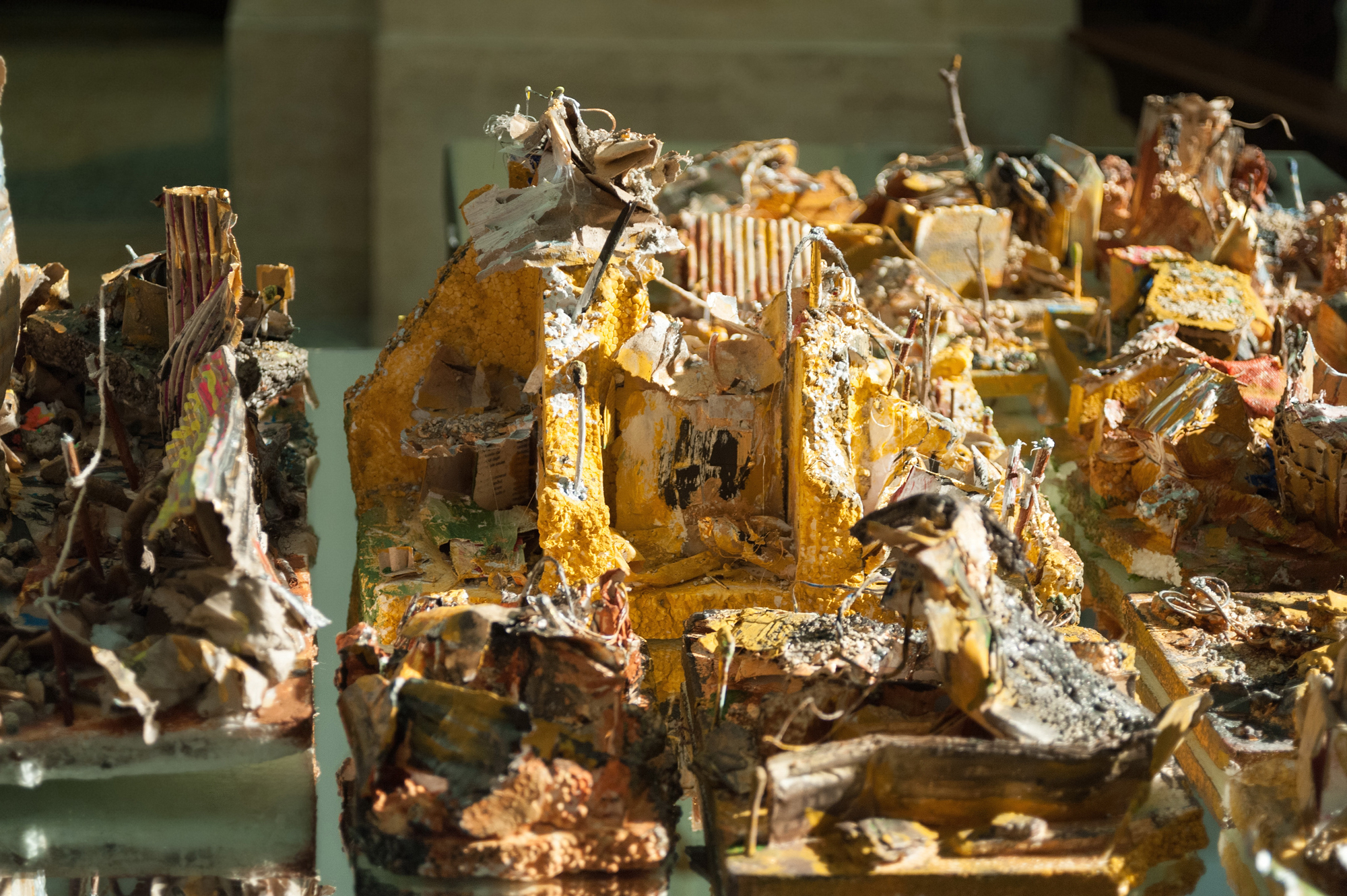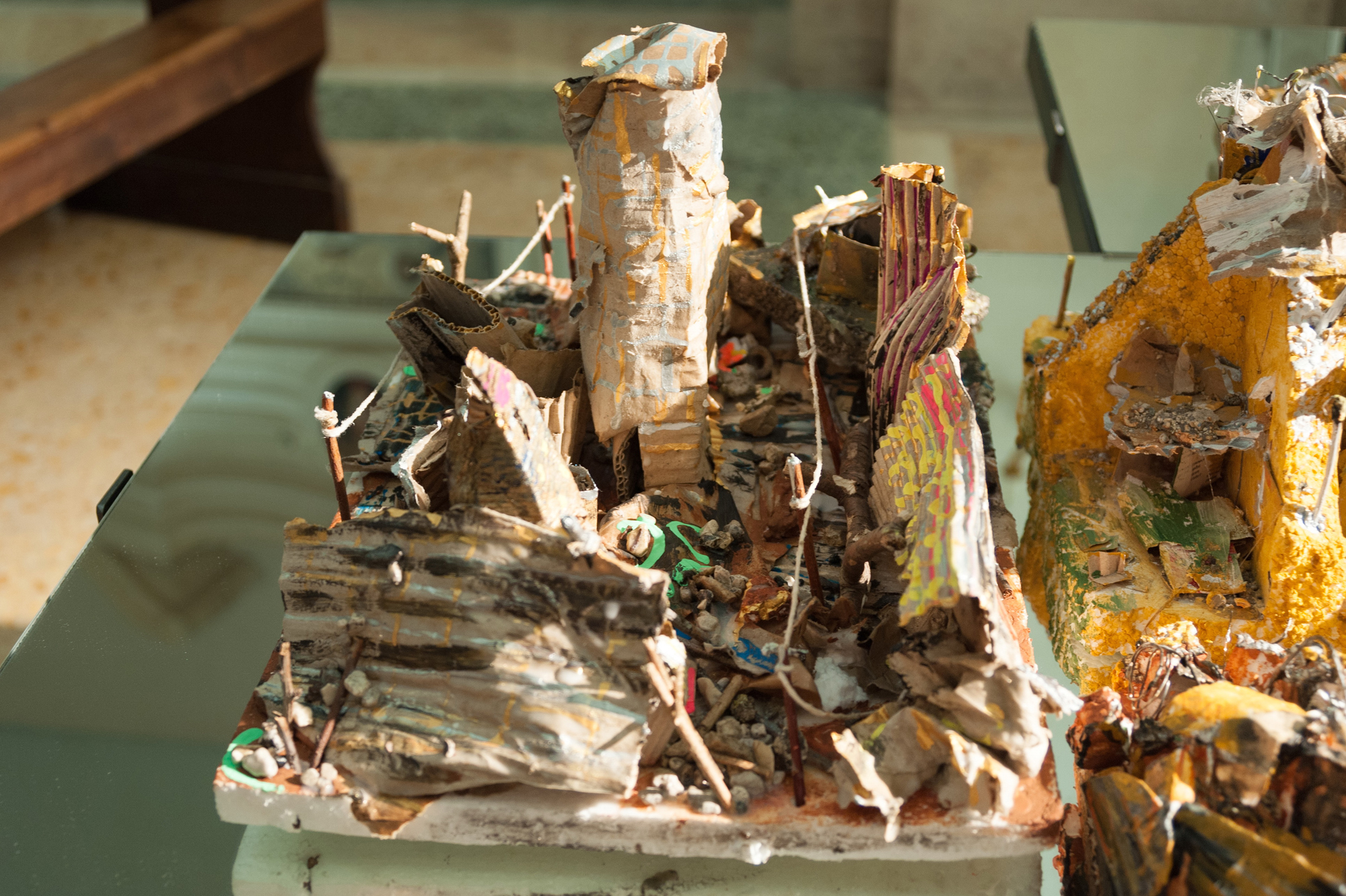 Una grande croce specchiante, sospesa a mezz’aria, sostiene le macerie realizzate con materiali di riciclo dai ragazzi con autismo del Centro Sant’Eusanio. Una scelta fatta per suggerire la spiritualità dell’umano e i vari stati della vita: nascita e morte; ma anche presente e futuro attraverso la centralità del simbolo della croce che, come uno specchio d’acqua, raddoppia lo spazio ed emana un’intensa pulsione al trascendente e al mistero della rinascita.