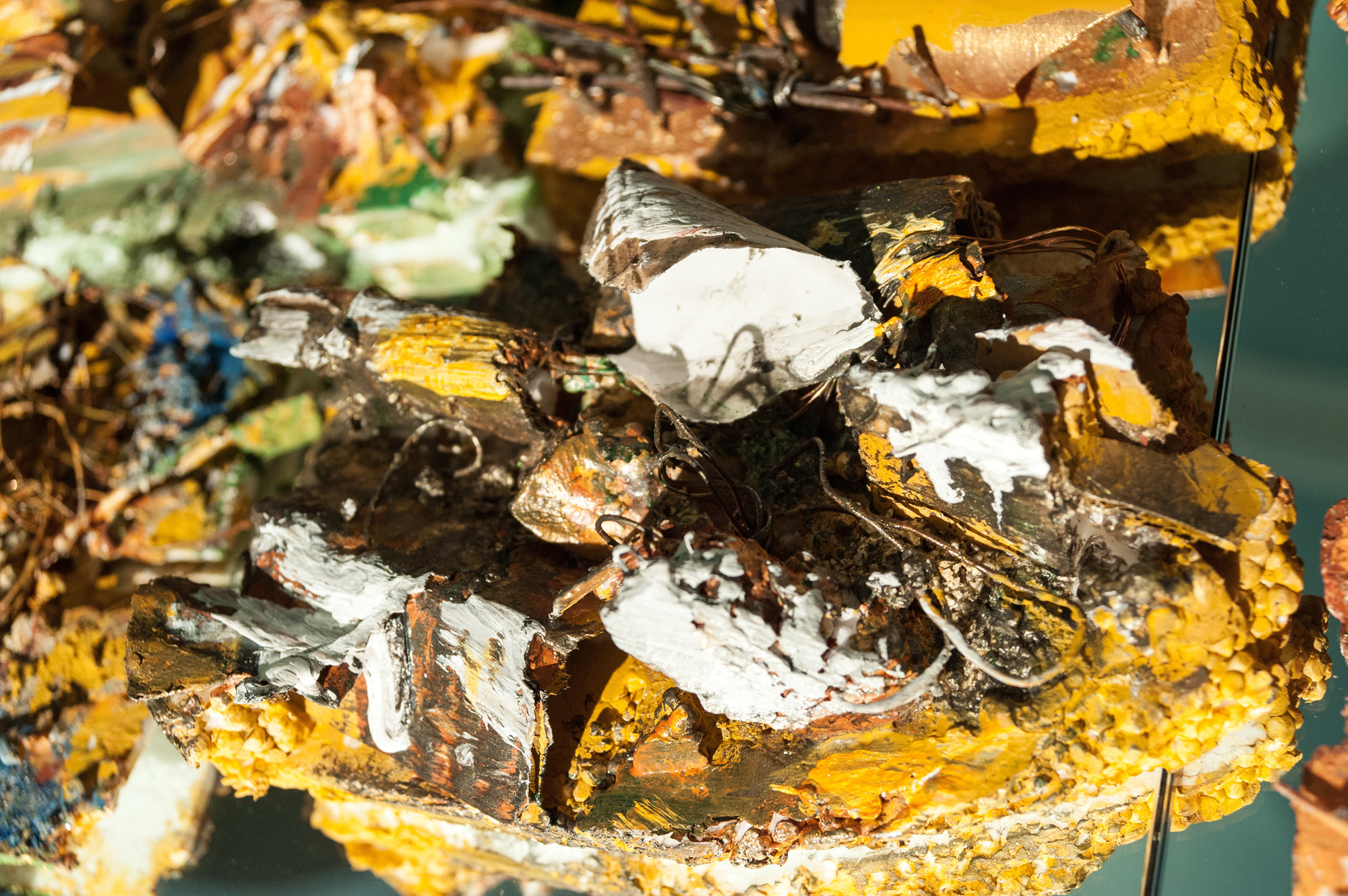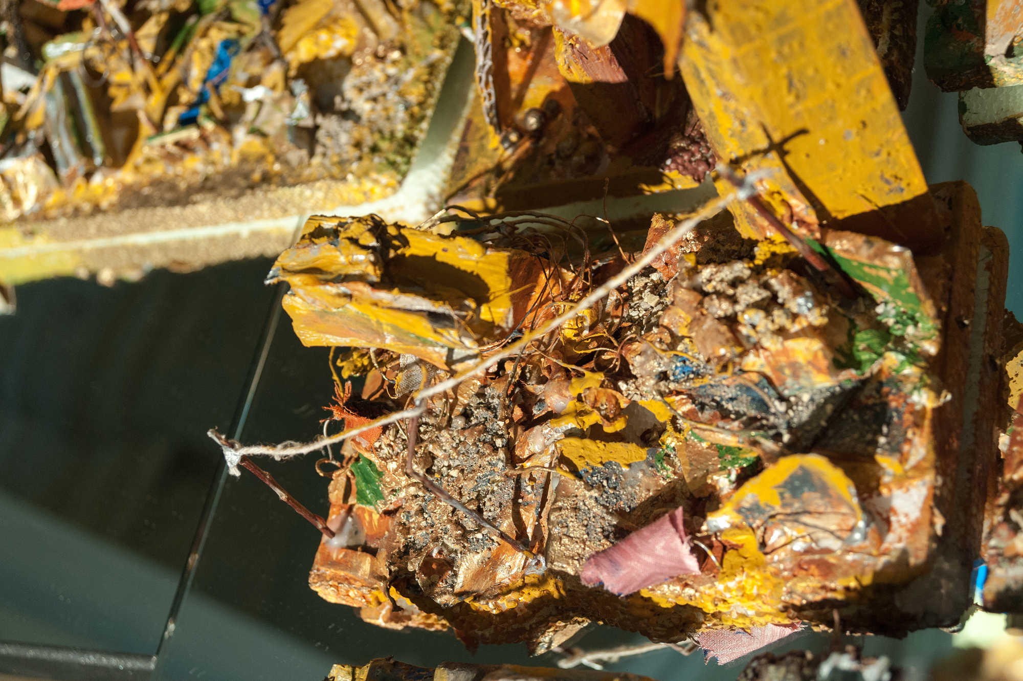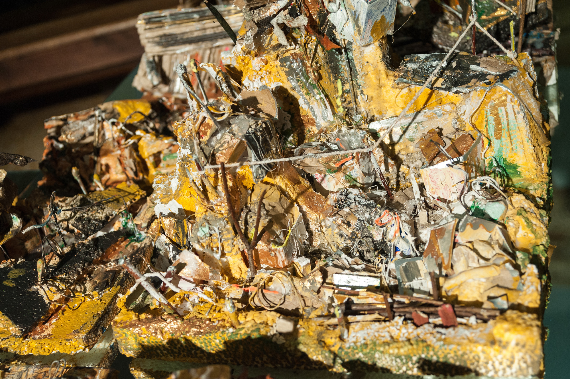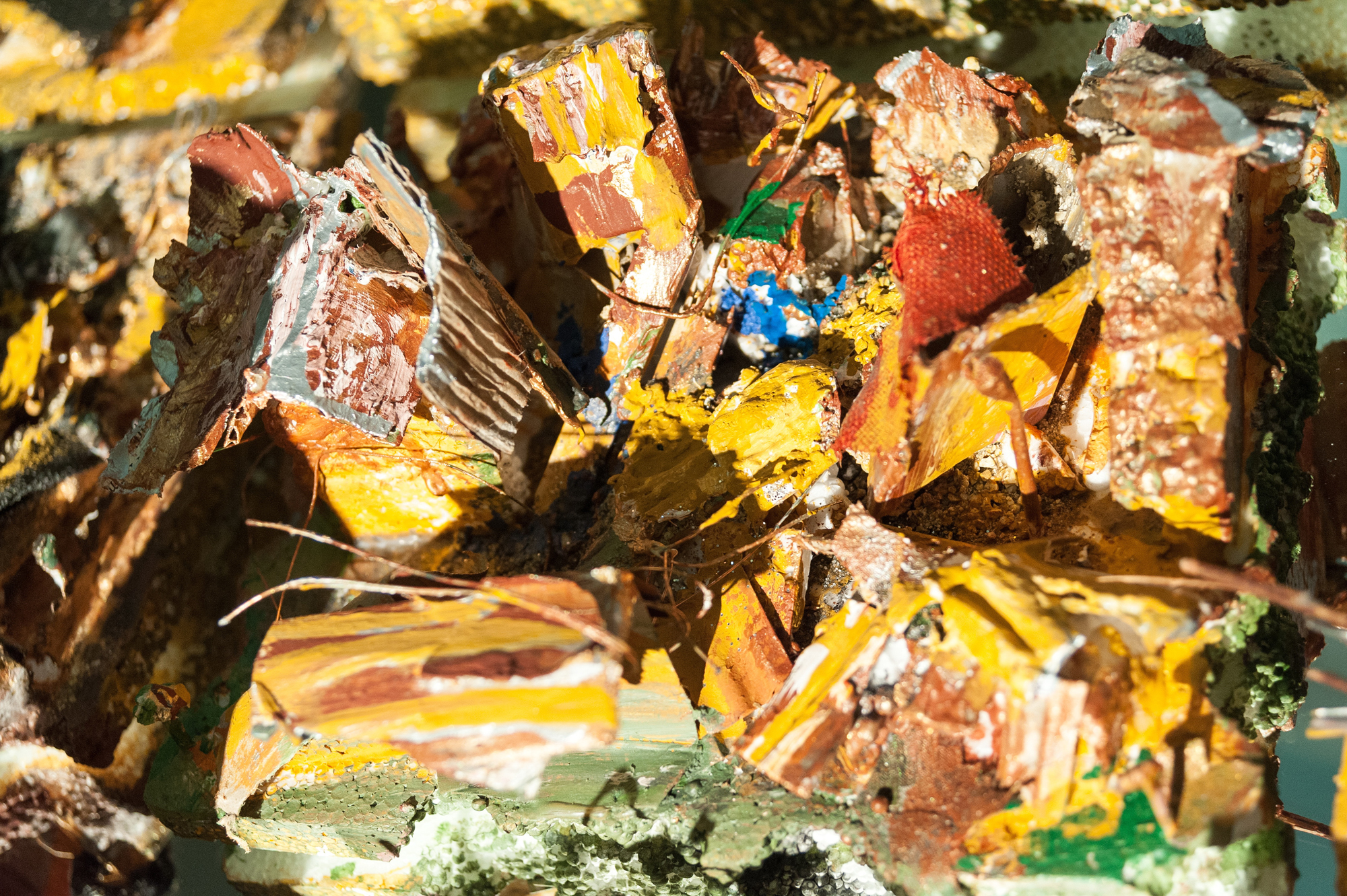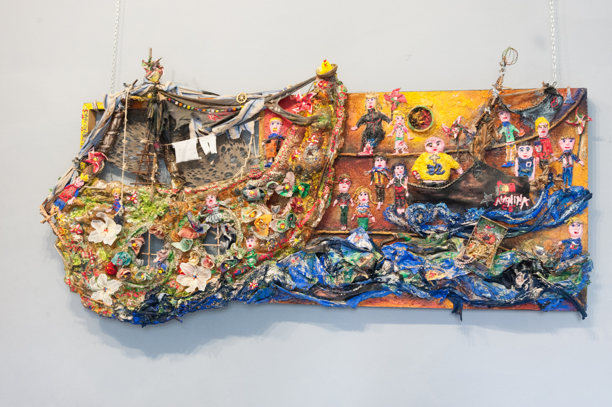 Una grande croce specchiante, sospesa a mezz’aria, sostiene le macerie realizzate con materiali di riciclo dai ragazzi con autismo del Centro Sant’Eusanio. Una scelta fatta per suggerire la spiritualità dell’umano e i vari stati della vita: nascita e morte; ma anche presente e futuro attraverso la centralità del simbolo della croce che, come uno specchio d’acqua, raddoppia lo spazio ed emana un’intensa pulsione al trascendente e al mistero della rinascita.