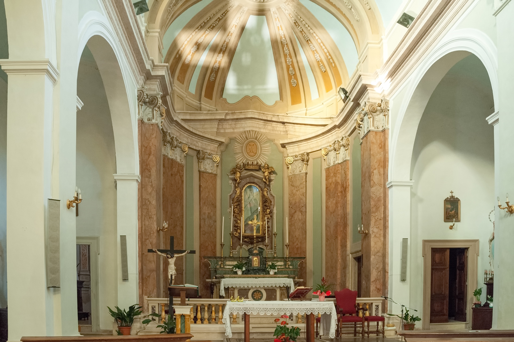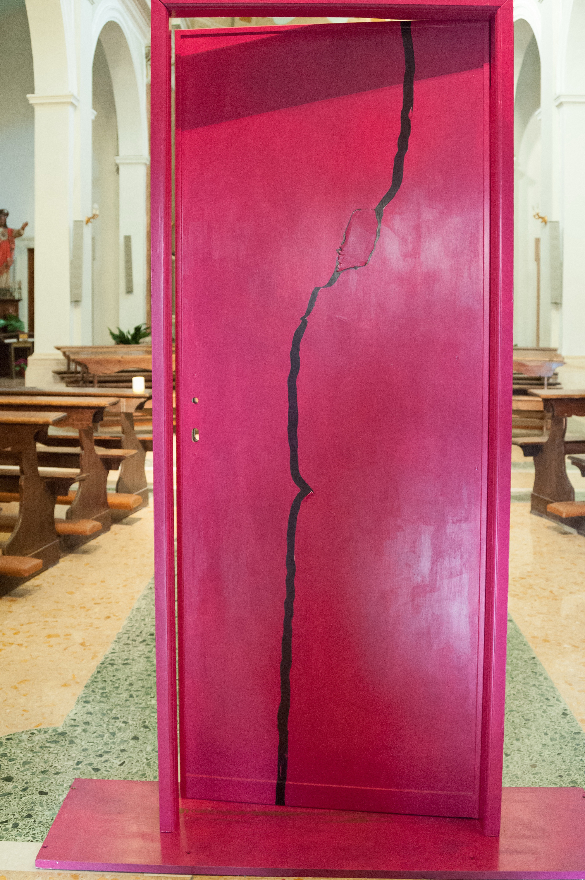 I visitatori sono introdotti all’installazione attraverso una “Porta d’Arte”, caratterizzata da una lesione riprodotta sul legno del battente. Una porta semiaperta che conduce verso un altro spazio, ignoto, ma anche verso la speranza. Una allusione che si realizza navata centrale, grazie alla croce specchiata, simbolo di rinascita e resurrezione.