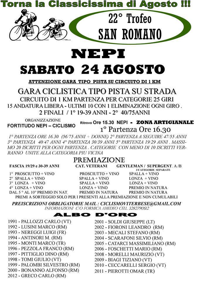 Con l’organizzazione della Fortitudo Nepi Ciclismo e con il patrocinio del comune di Nepi, sabato 24 agosto è in programma una della gare più longeve della provincia viterbese portando avanti una tradizione che dura a partire dagli anni Sessanta in cui questa manifestazione è passata di mano da parte dei vari comitati e delle varie associazioni.