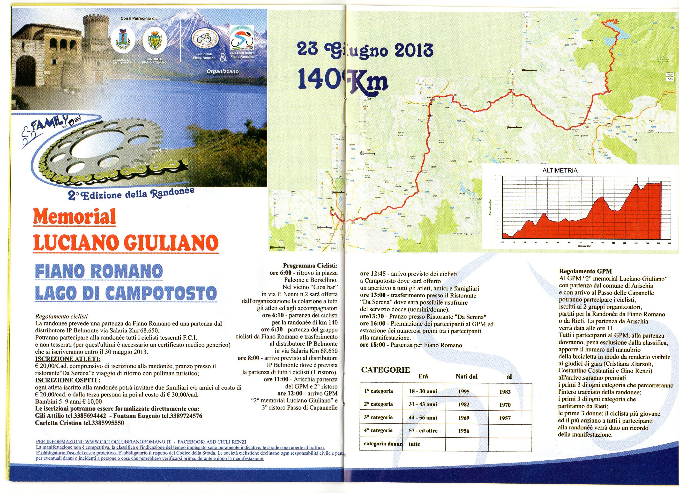 Campotosto, il caratteristico paese della provincia de L’Aquila affacciato sul piccolo mare artificiale delle montagne d’Abruzzo, è pronto ad ospitare domenica prossima, 23 giugno, la seconda edizione della randonnèe intitolata alla memoria di Luciano Giuliano a cura delle società Asd Cicli Renzi Fiano Romano e Ciclo Club Fiano Romano entrambi nelle doppie vesti di organizzatori e partecipanti.