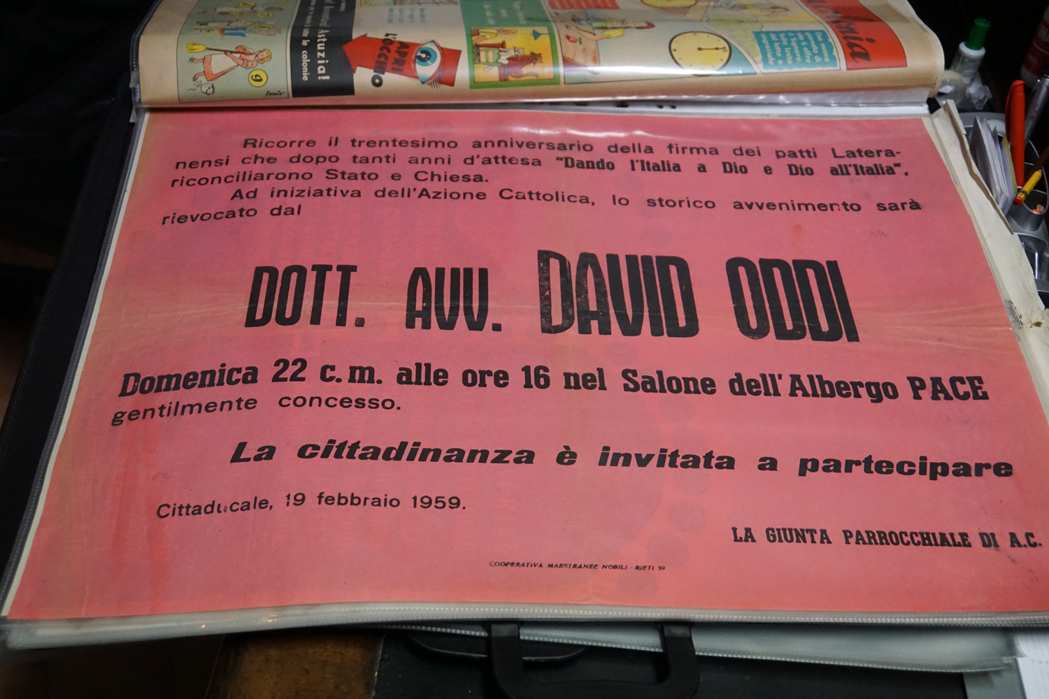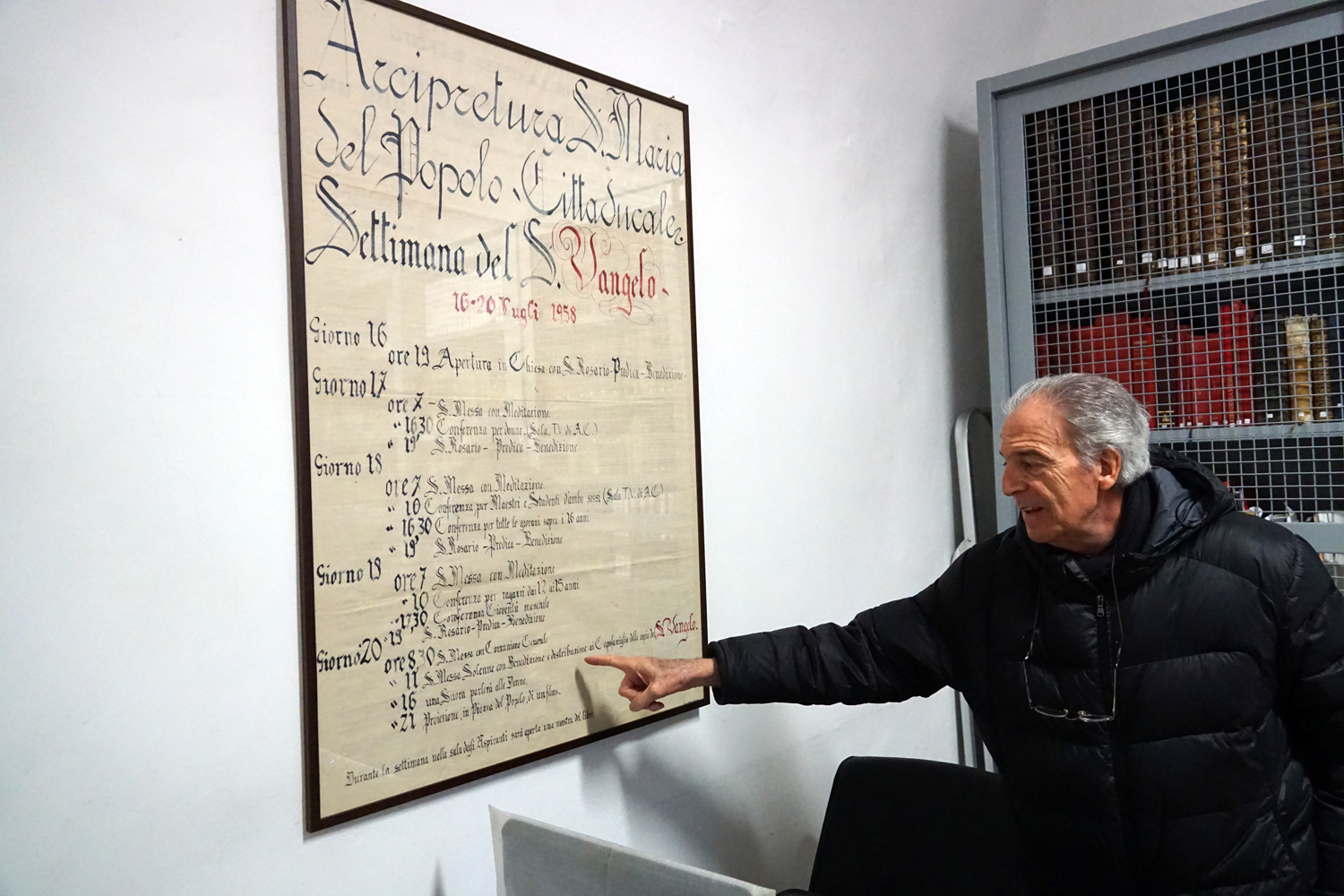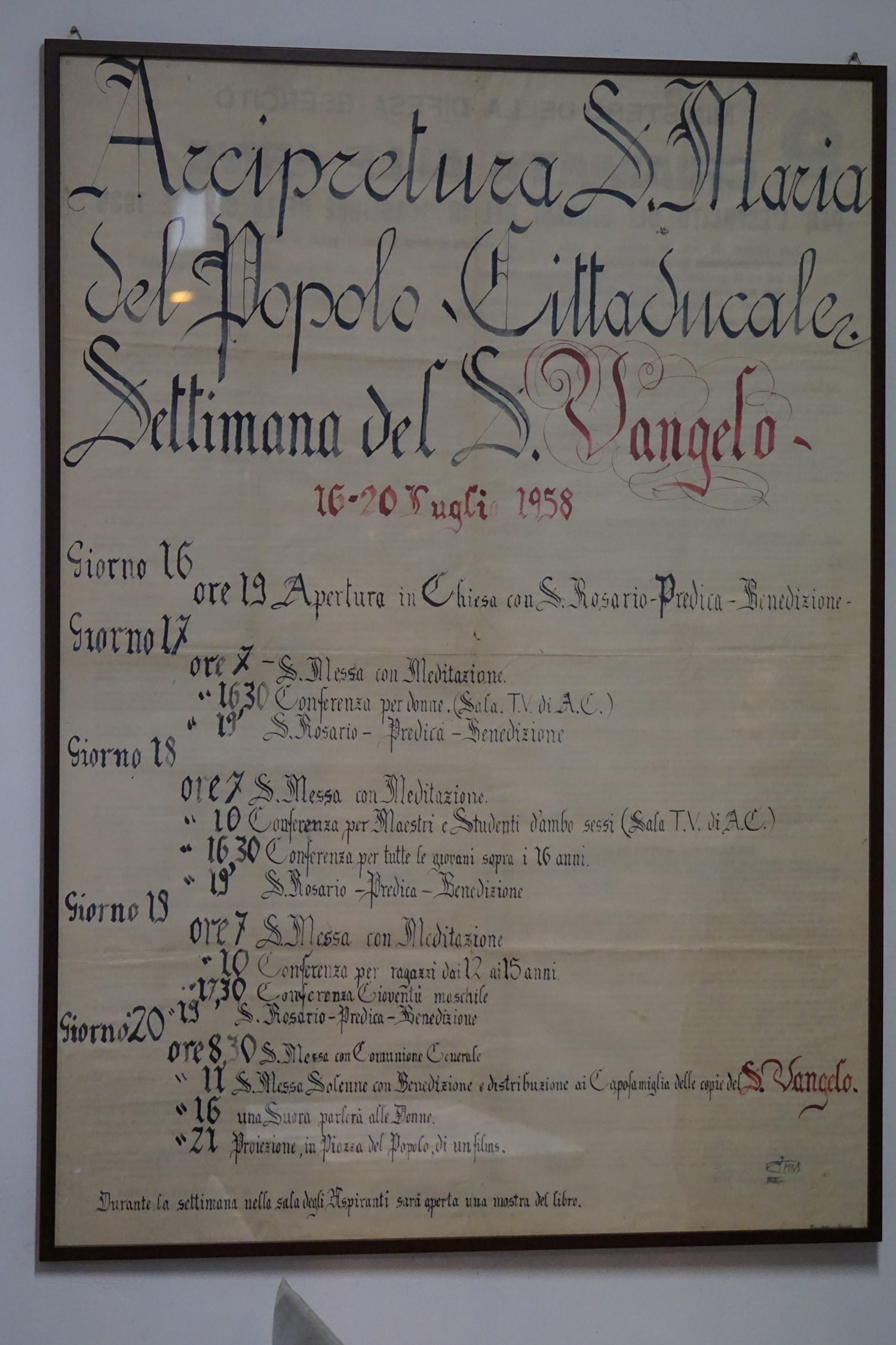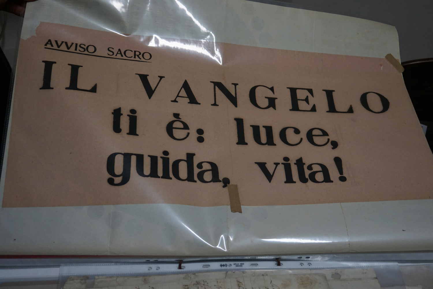 La collezione dell’archivio parrocchiale, peraltro, non si limita solo ai messali e ai registri. Al fianco delle carte rilegate ci sono i fogli sciolti della stampa cattolica raccolta dallo stesso Felice Gianfelice, e pure tanti manifesti d’epoca, capaci di restituire tanto lo stile pastorale quanto il gusto estetico della prima metà del secolo scorso. Un manifesto in particolare attira l’attenzione di chi entra nella stanza dell’Archivio storico della parrocchia di Cittaducale: annuncia la “Settimana del Santo Vangelo” che si è tenuta dal 16 al 20 luglio 1958.