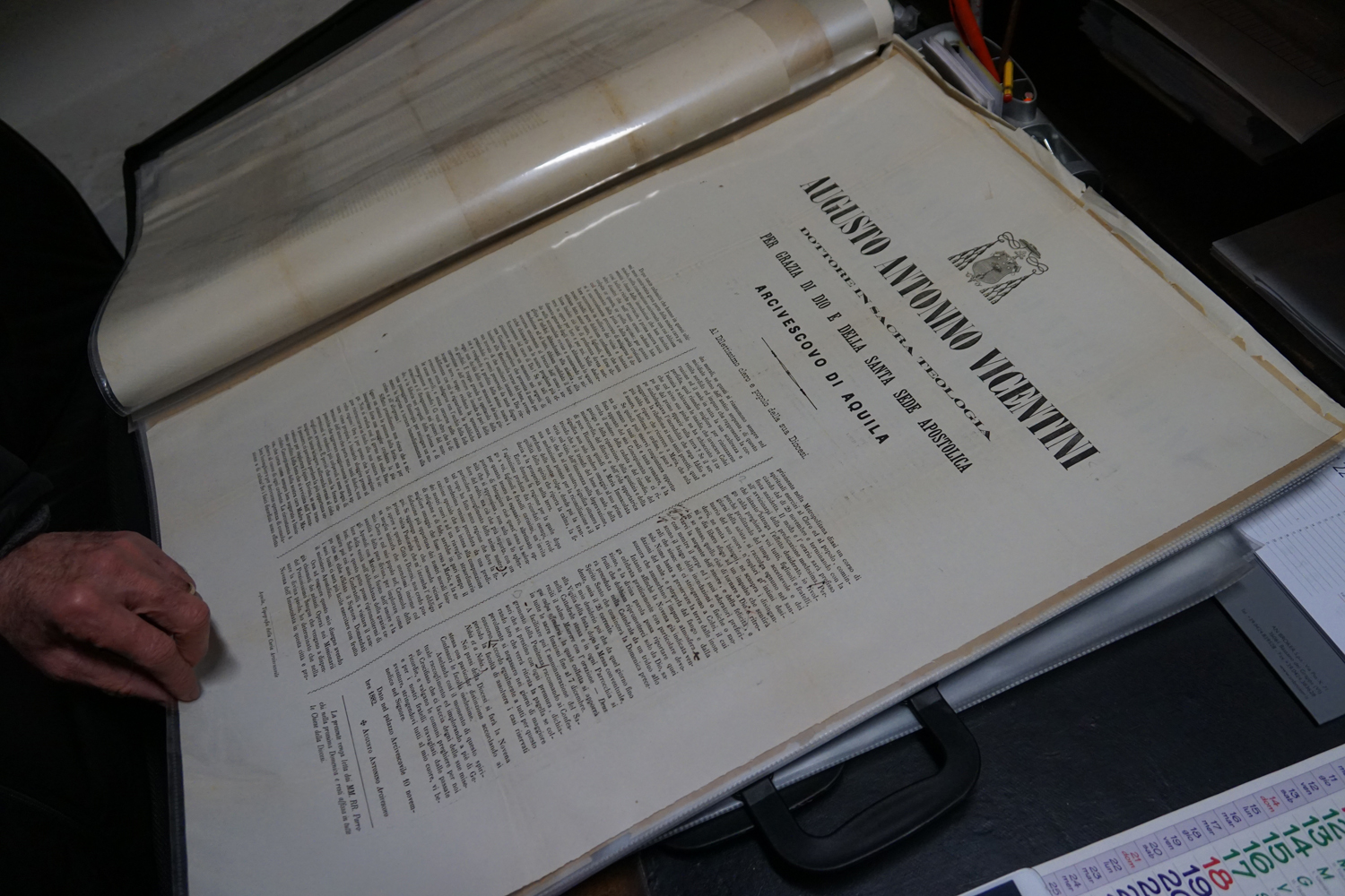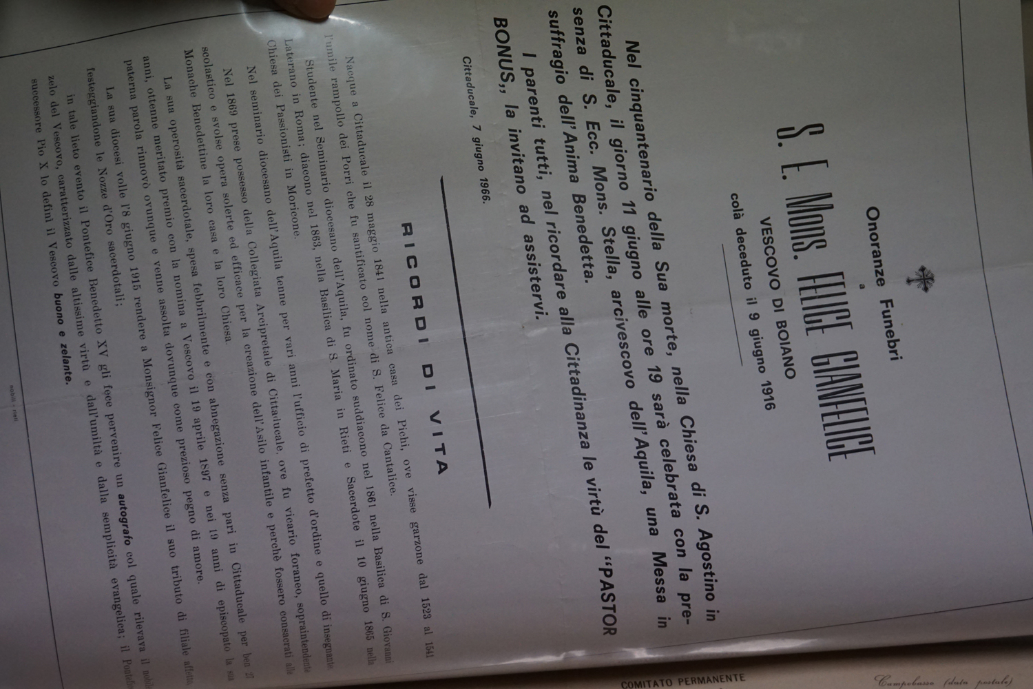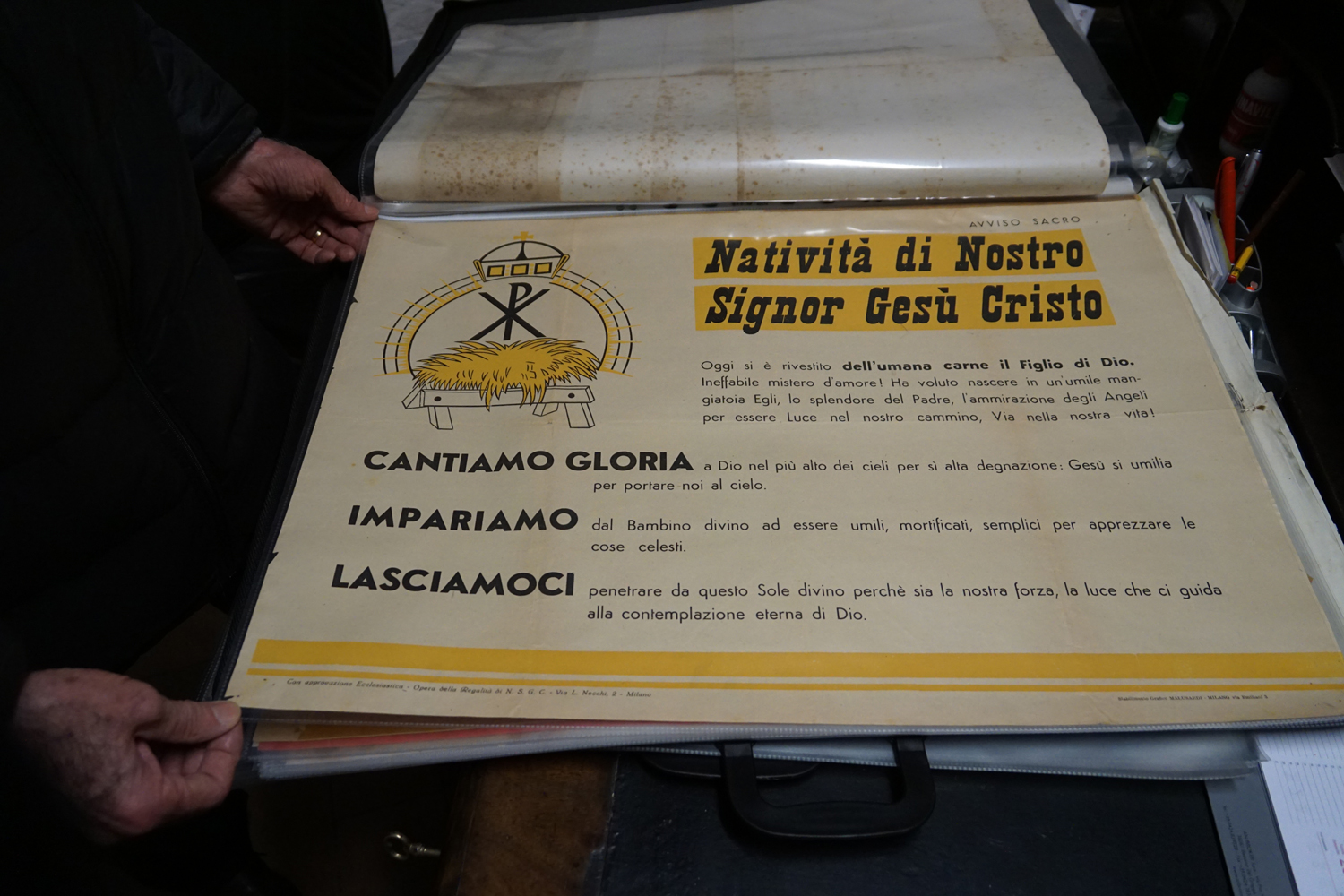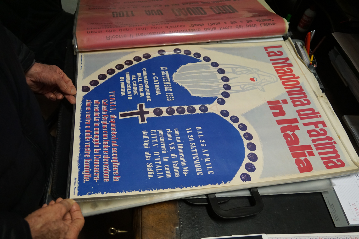 La collezione dell’archivio parrocchiale, peraltro, non si limita solo ai messali e ai registri. Al fianco delle carte rilegate ci sono i fogli sciolti della stampa cattolica raccolta dallo stesso Felice Gianfelice, e pure tanti manifesti d’epoca, capaci di restituire tanto lo stile pastorale quanto il gusto estetico della prima metà del secolo scorso. Un manifesto in particolare attira l’attenzione di chi entra nella stanza dell’Archivio storico della parrocchia di Cittaducale: annuncia la “Settimana del Santo Vangelo” che si è tenuta dal 16 al 20 luglio 1958.