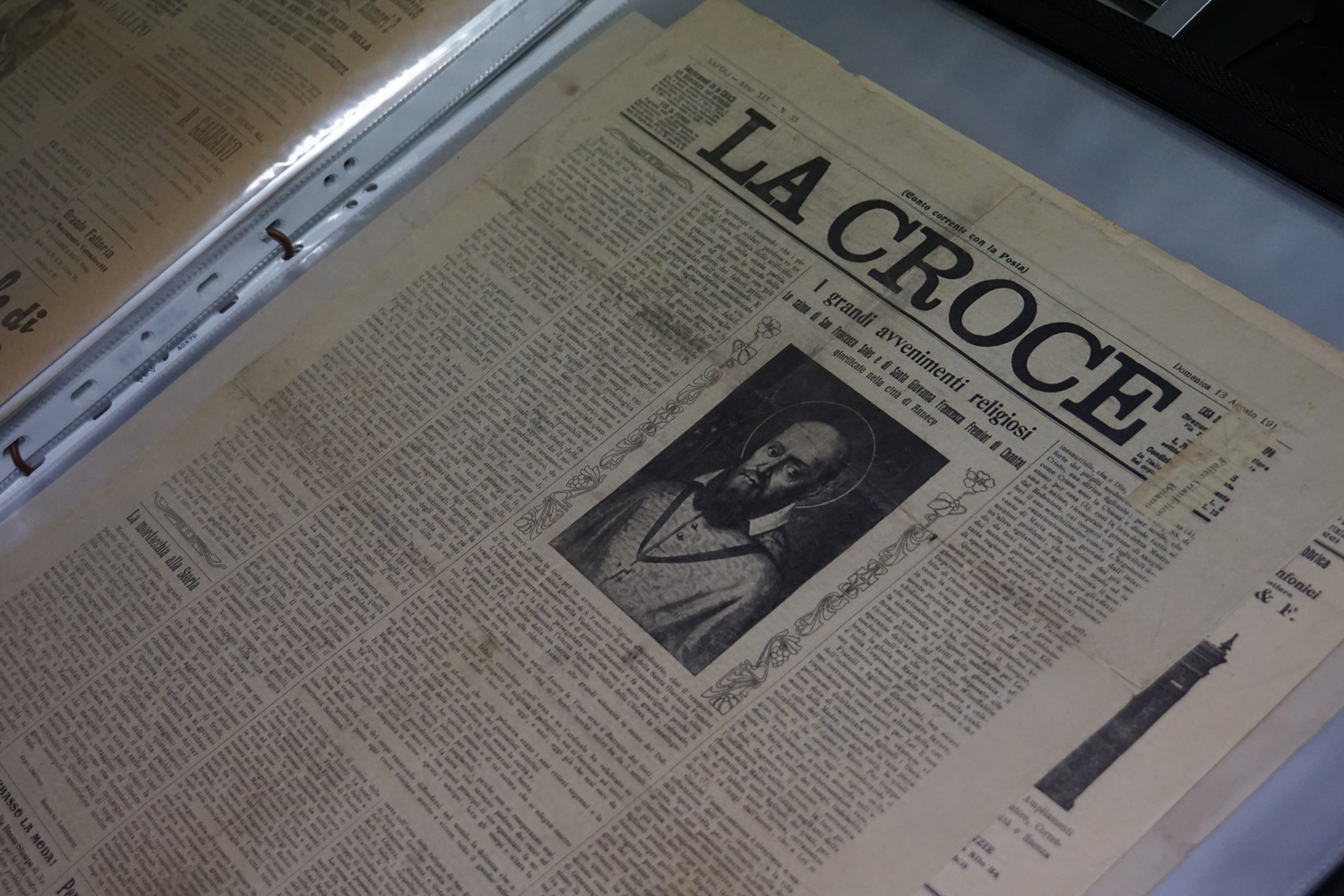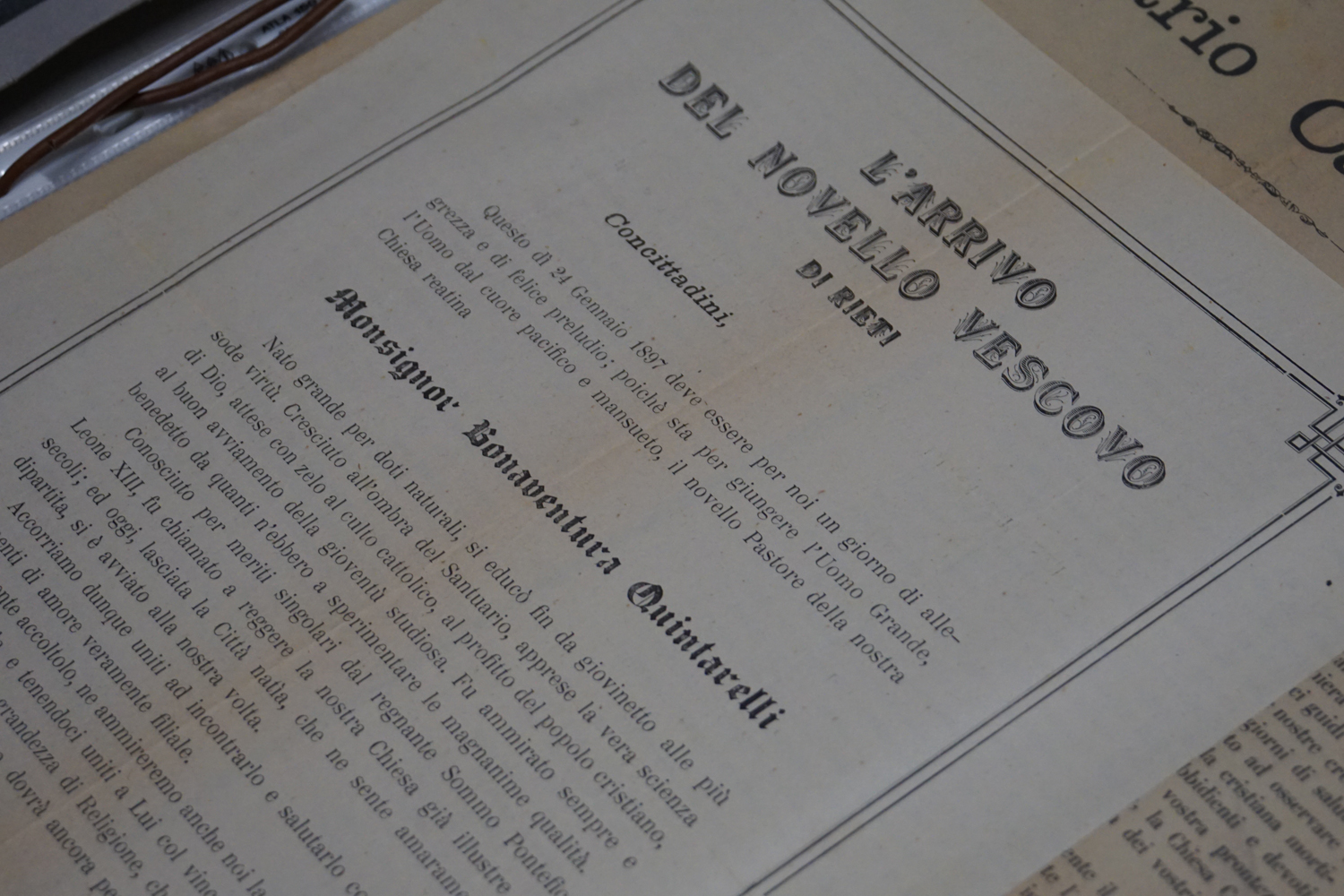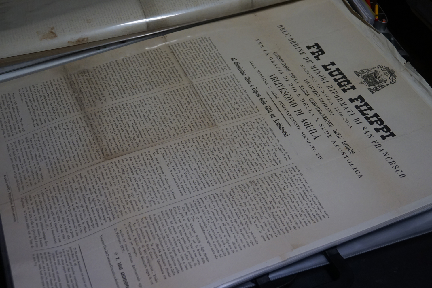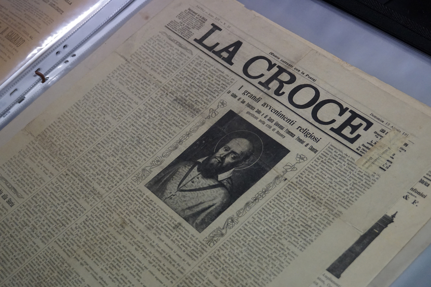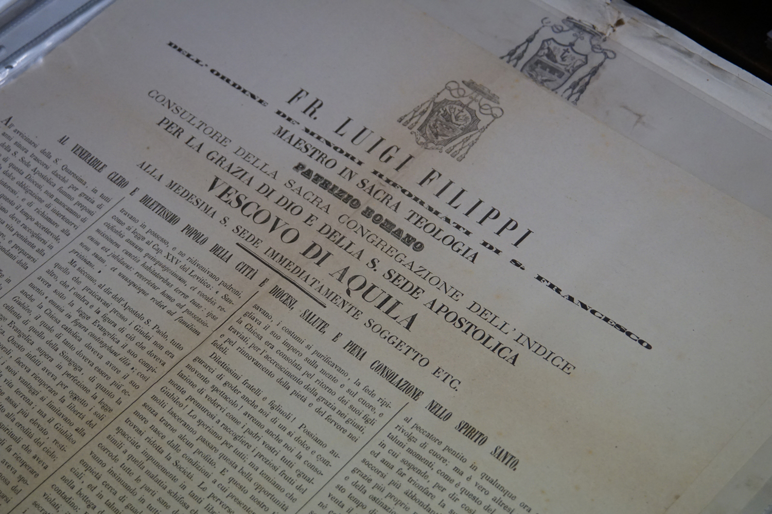 La collezione dell’archivio parrocchiale, peraltro, non si limita solo ai messali e ai registri. Al fianco delle carte rilegate ci sono i fogli sciolti della stampa cattolica raccolta dallo stesso Felice Gianfelice, e pure tanti manifesti d’epoca, capaci di restituire tanto lo stile pastorale quanto il gusto estetico della prima metà del secolo scorso. Un manifesto in particolare attira l’attenzione di chi entra nella stanza dell’Archivio storico della parrocchia di Cittaducale: annuncia la “Settimana del Santo Vangelo” che si è tenuta dal 16 al 20 luglio 1958.