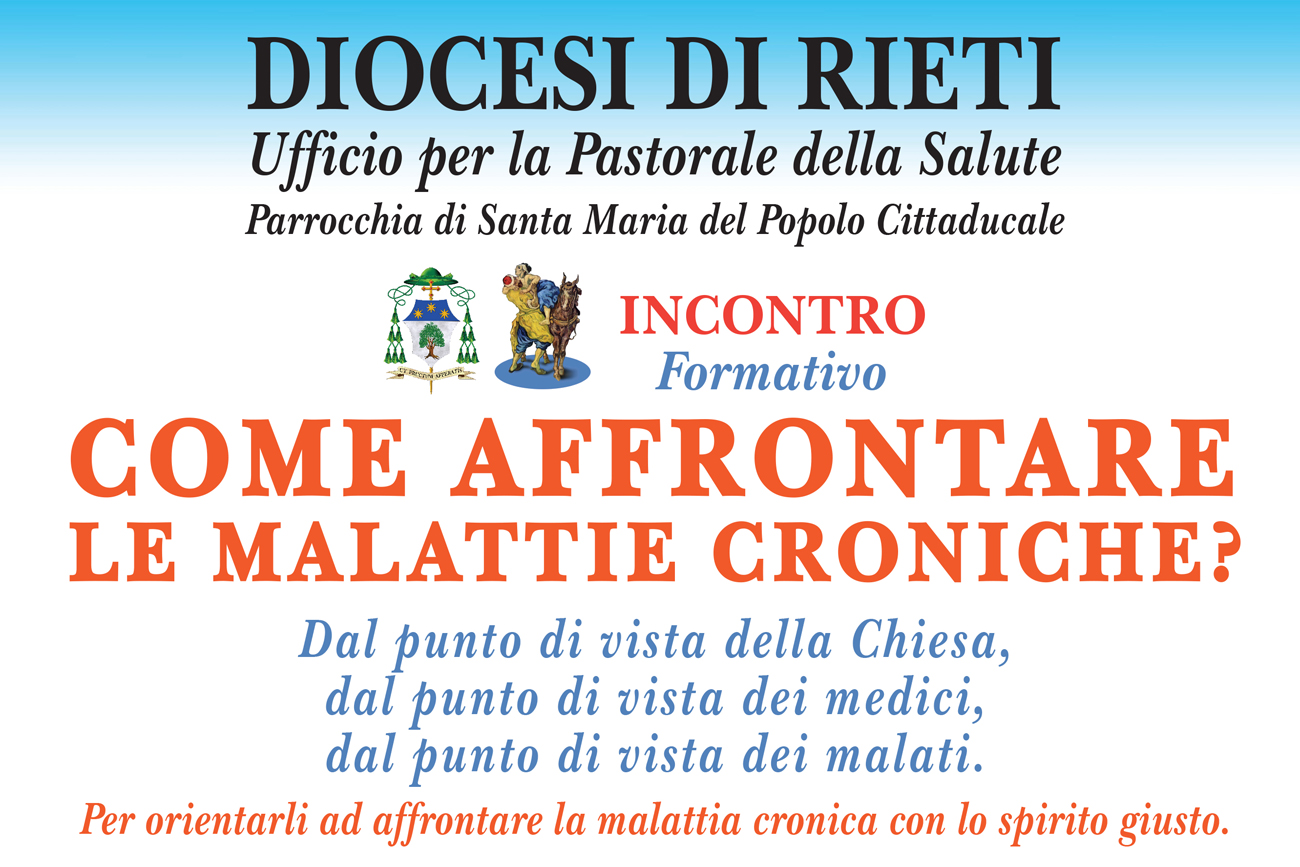 Sabato 10 ottobre alle 9 nella Basilica di Santa Maria del Popolo di Cittaducale, si terrà un importante incontro formativo promosso dall’Ufficio diocesano per la Pastorale della Salute dal titolo “Come affrontare le malattie croniche?”. Una discussione dal punto di vista della Chiesa, dal punto di vista dei medici, dal punto di vista dei malati. Per orientarli ad affrontare la malattia cronica con lo spirito giusto. All’evento parteciperà anche il vescovo Domenico Pompili.