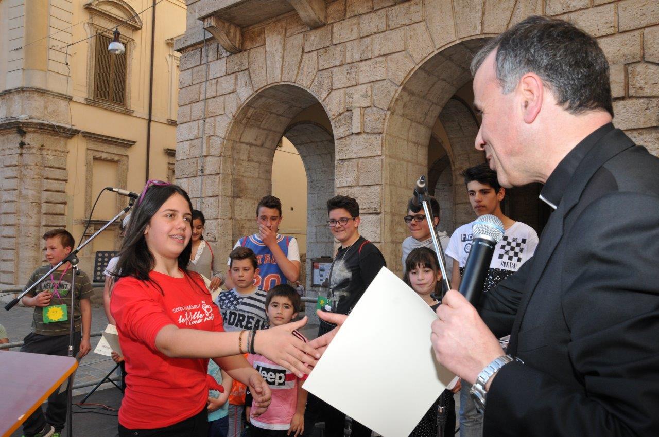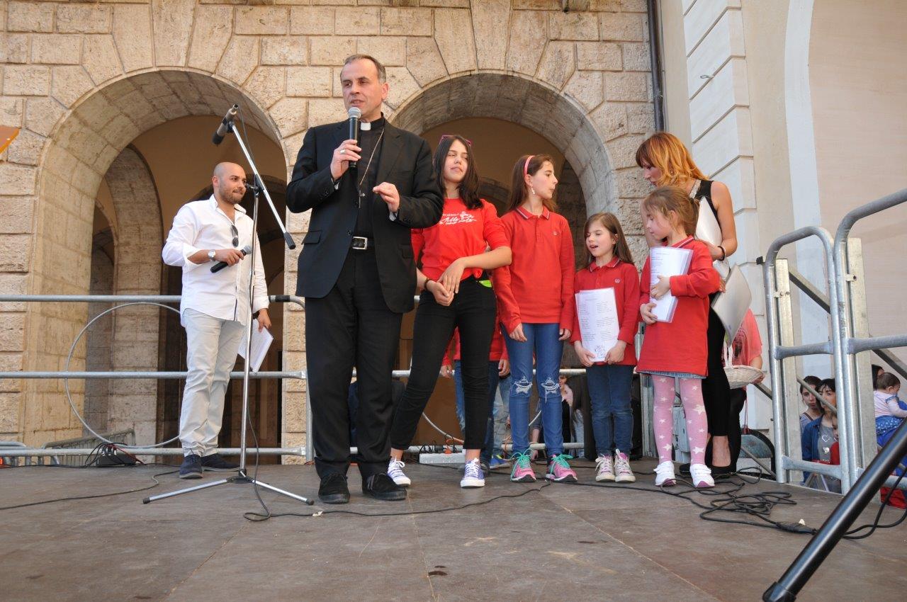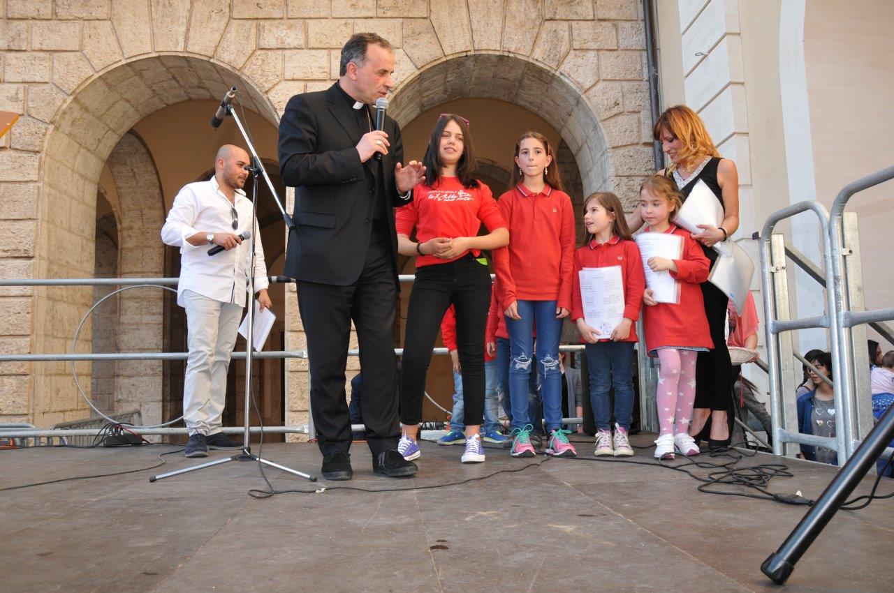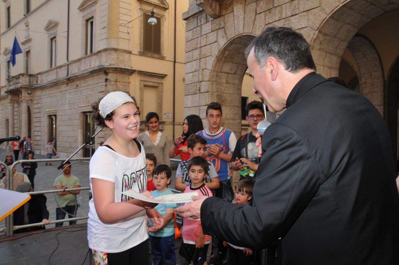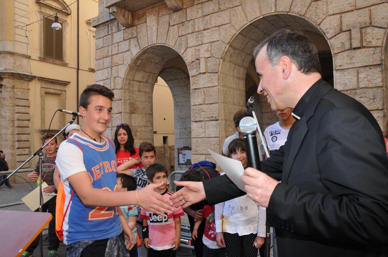 Una quinta tappa svolta nel centro storico di Rieti, dove si è svolta una “Caccia ai talenti, alla scoperta del tesoro di Francesco”, e che in piazza Vittorio Emanuele II ha visto il vescovo Domenico consegnare ai bambini le certificazioni finali del progetto.