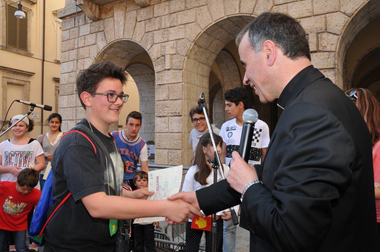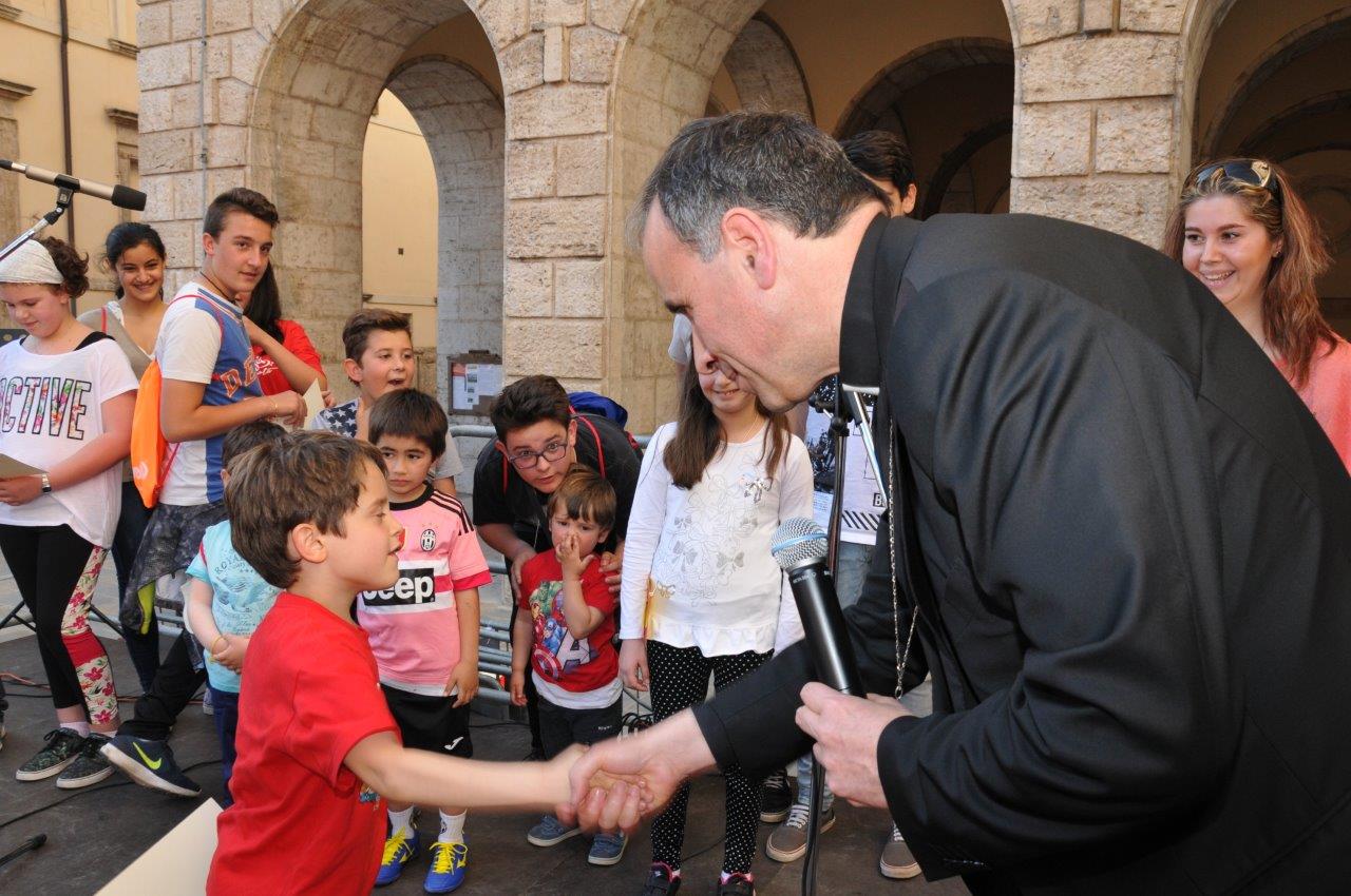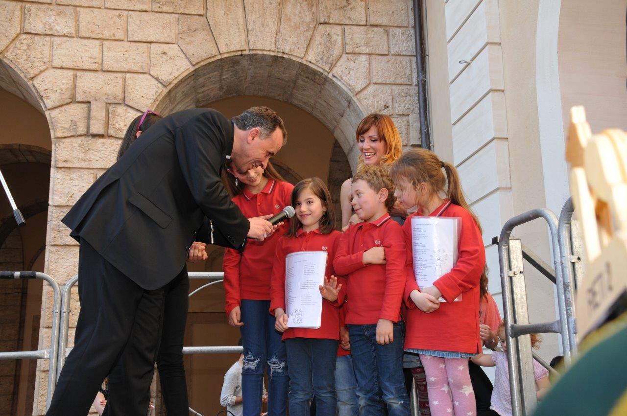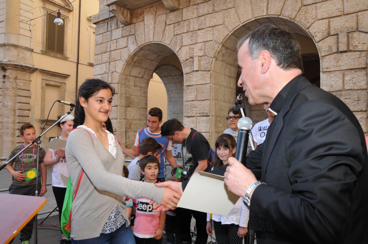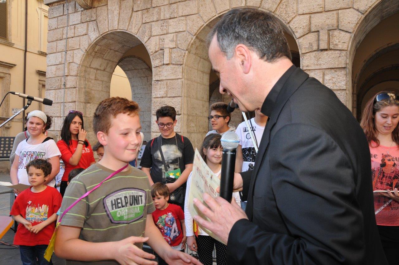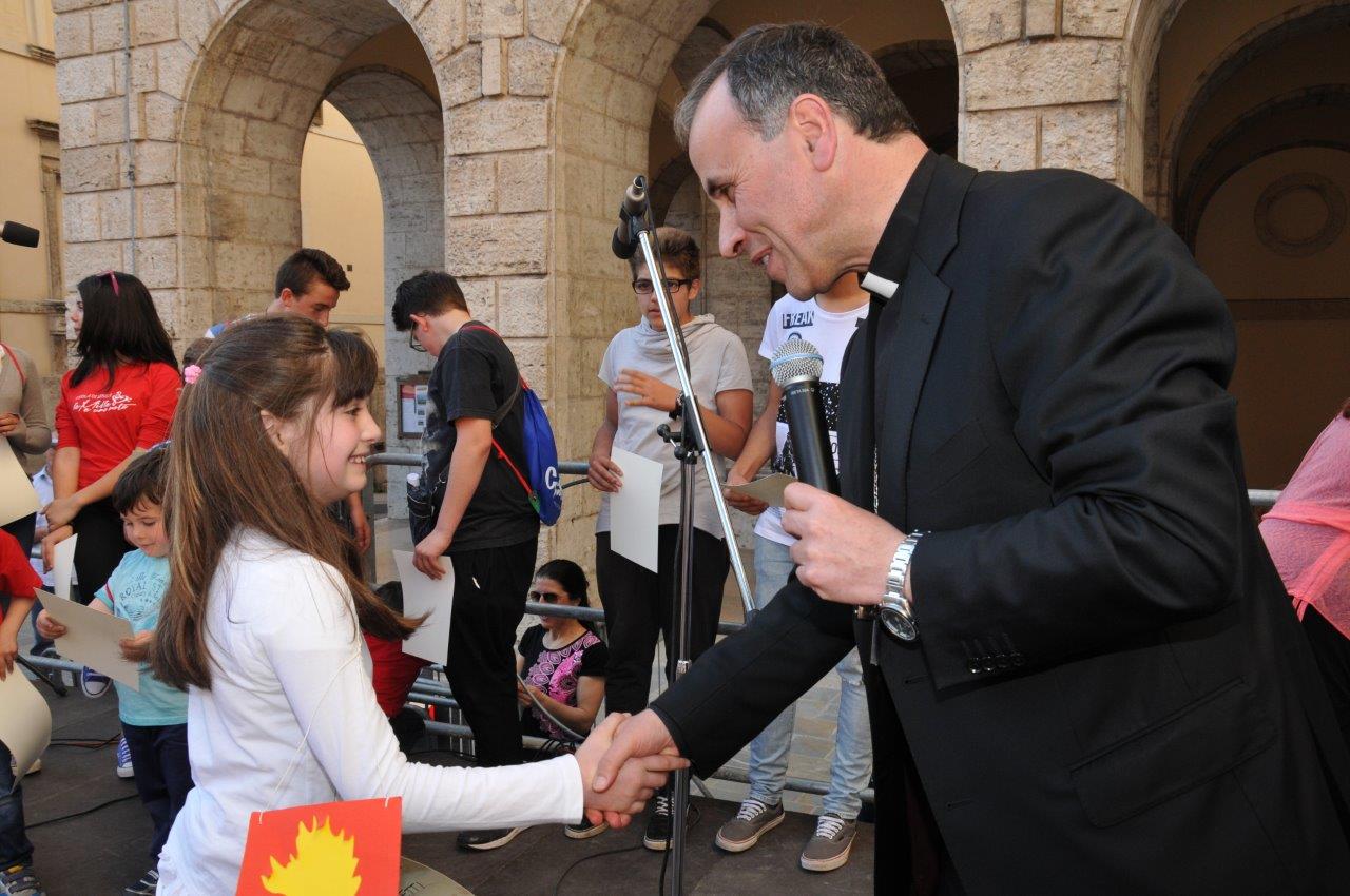 Una quinta tappa svolta nel centro storico di Rieti, dove si è svolta una “Caccia ai talenti, alla scoperta del tesoro di Francesco”, e che in piazza Vittorio Emanuele II ha visto il vescovo Domenico consegnare ai bambini le certificazioni finali del progetto.
