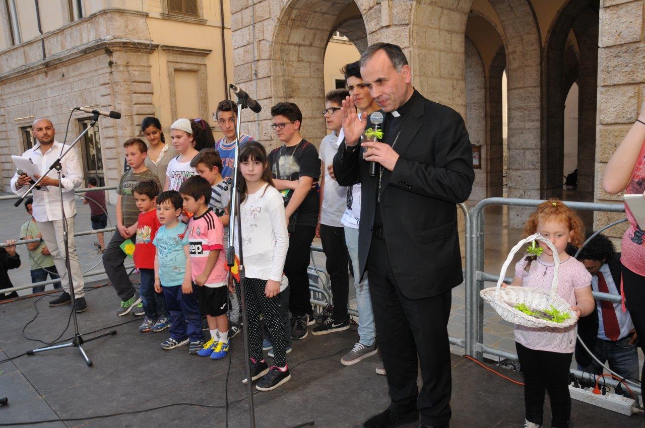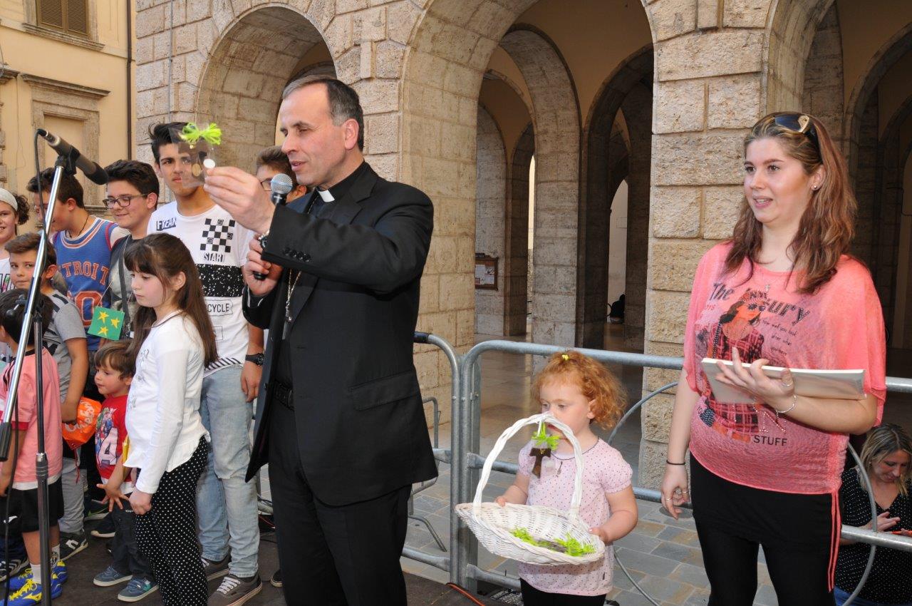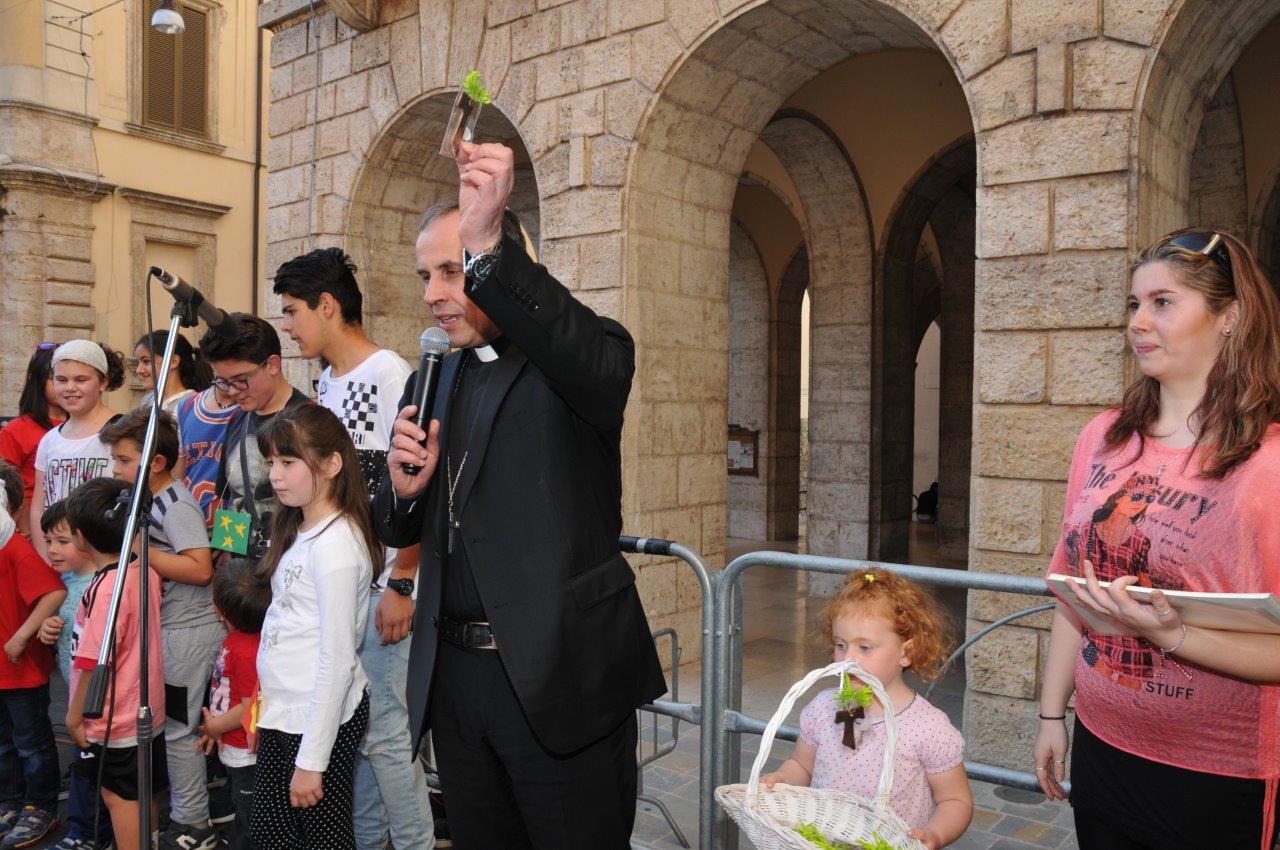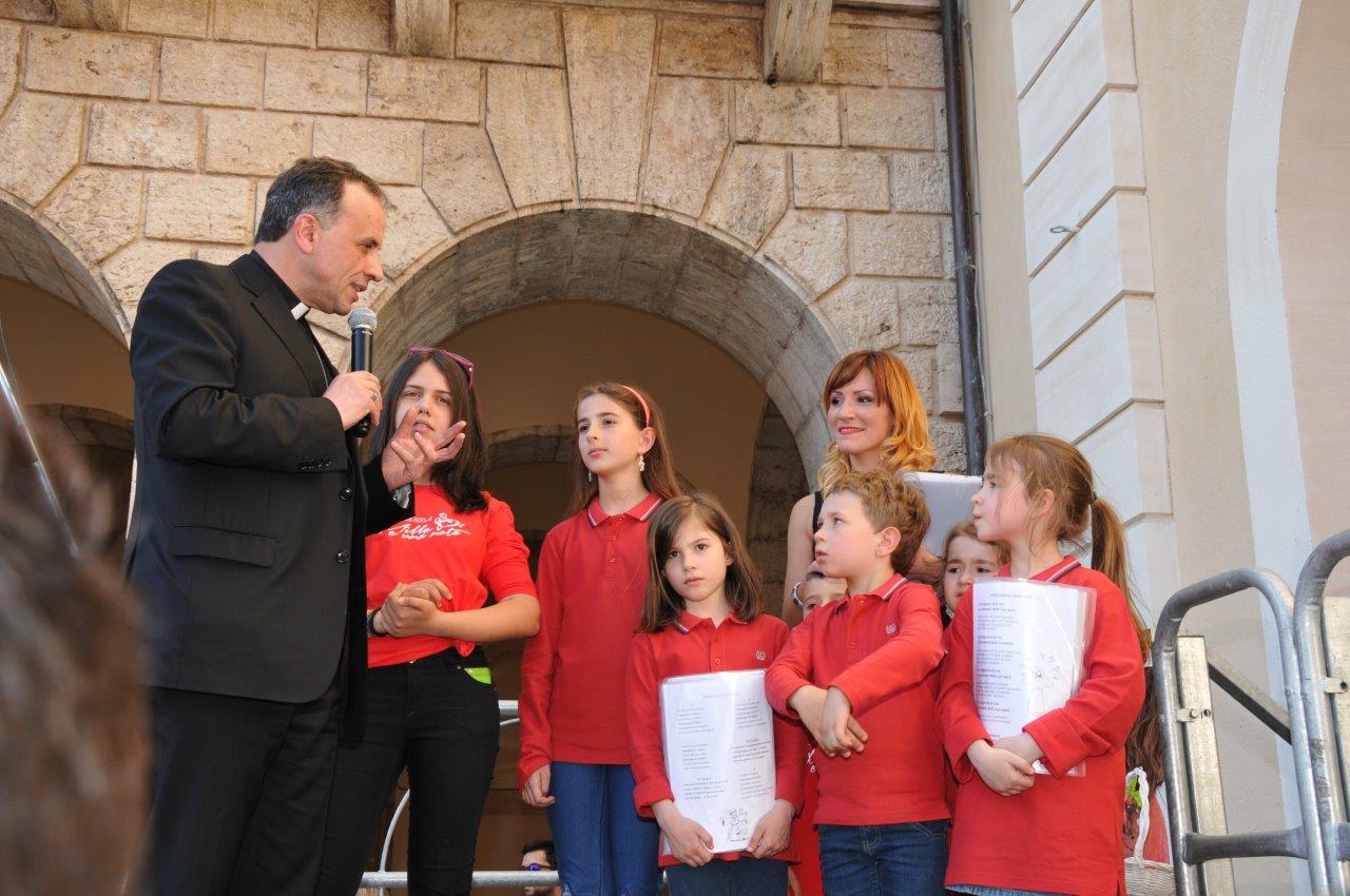 «Noi adulti siamo un po’ complessati – ha detto mons. Pompili ai piccoli – a noi interessano solo le cose grandi, potenti, appariscenti. Invece voi bambini sapete cogliere le cose piccole, nascoste, che richiedono cura e protezione. Come san Francesco, che è stato capace di innamorarsi di tutto, di saper far cantare il sole e la luna, di trovare perfino un agnello dentro un lupo».