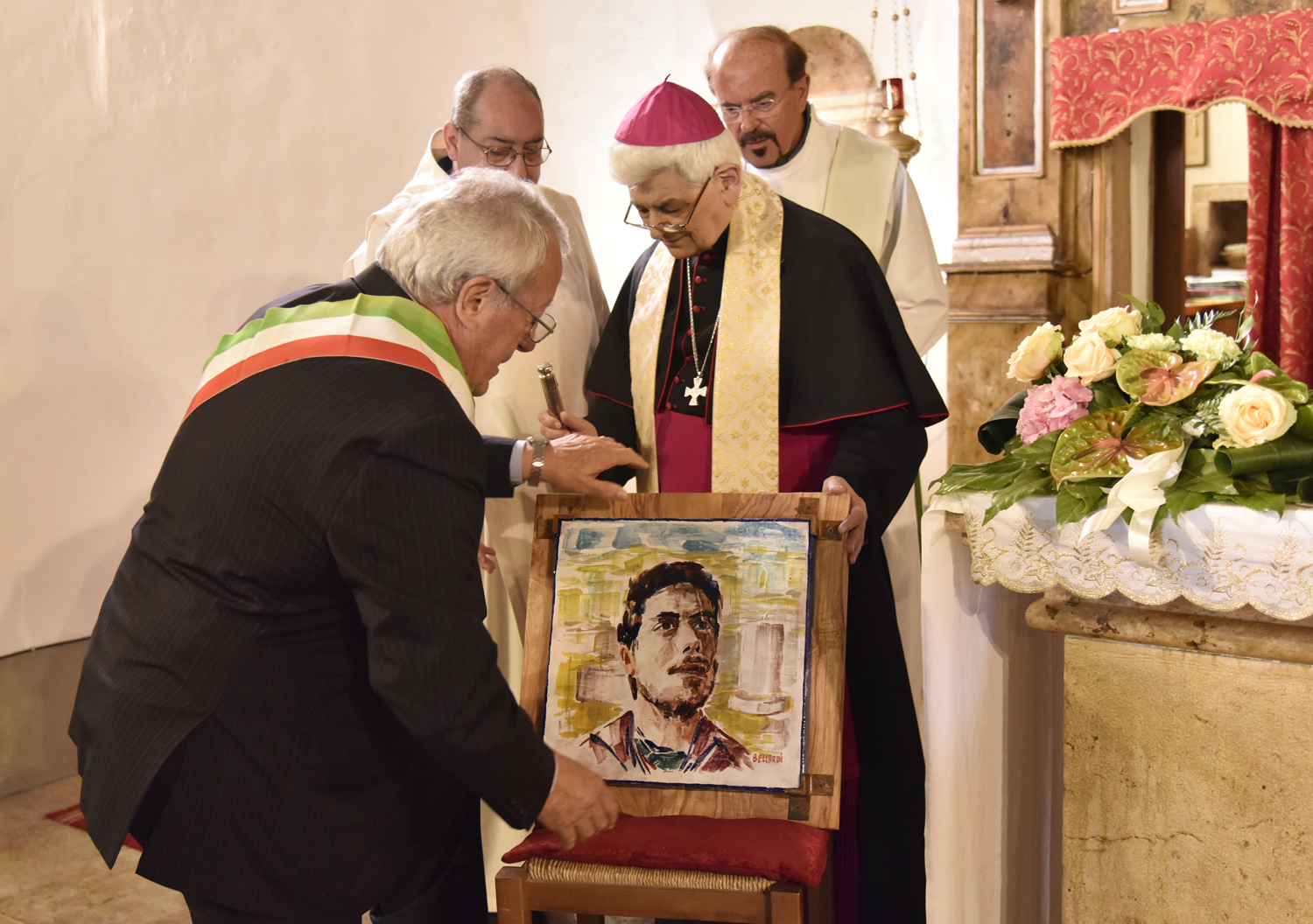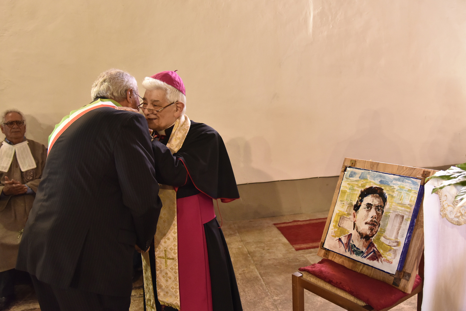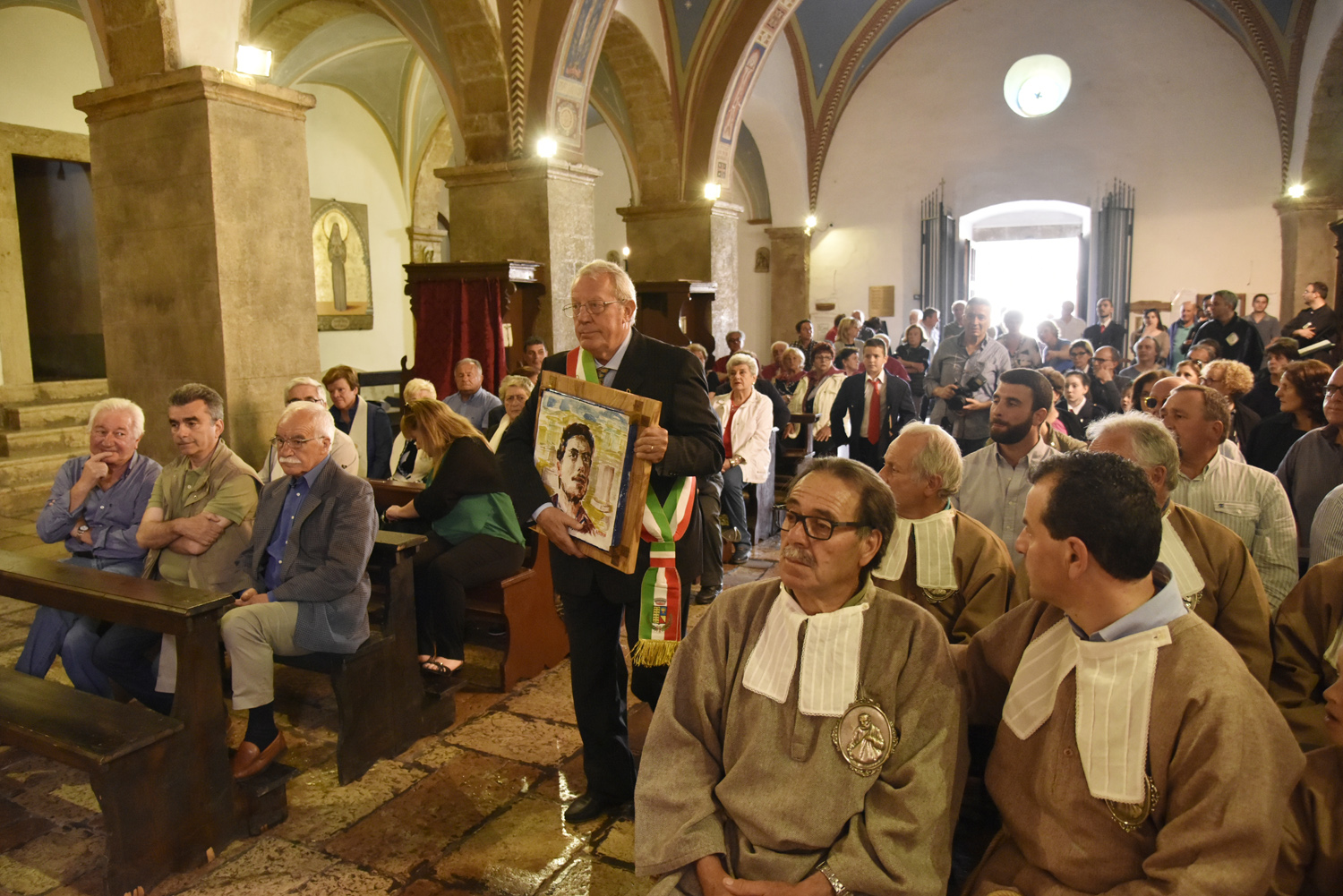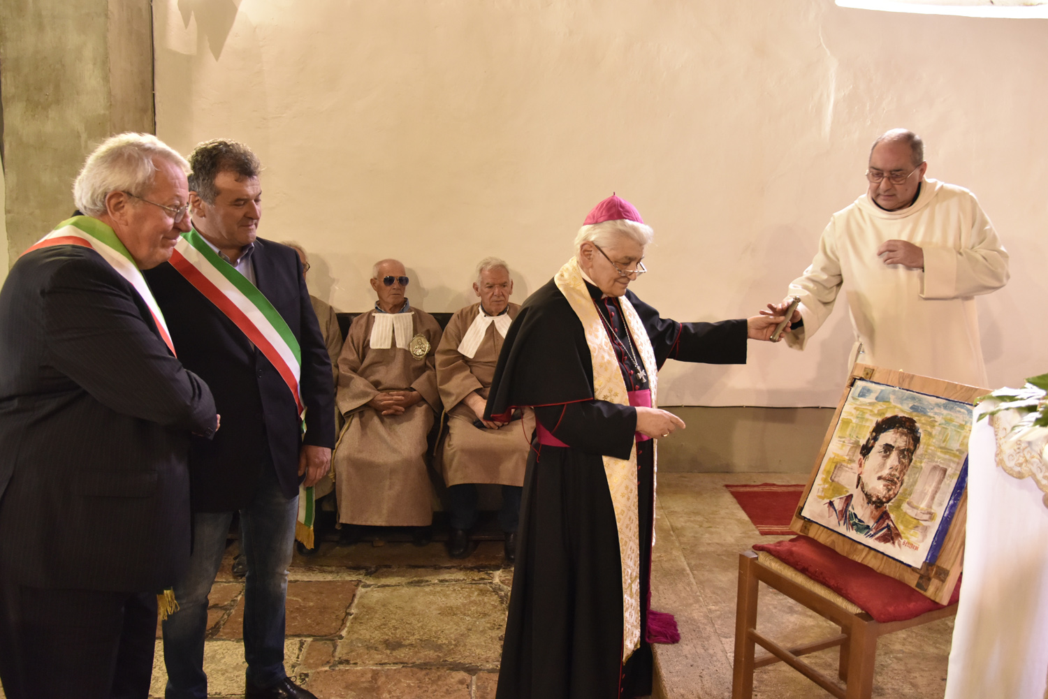 Al termine della Messa, l’atto di omaggio della comunità di Labro a quella di Colli, ricambiando il gesto svolto poco prima nella collegiata che di Colli è la “chiesa matrice”: stavolta è il sindaco di Labro, Gastone Curini, a consegnare a quello di Colli, Alberto Micanti, un quadro in bassorilievo, raffigurante la patrona santa Maria Maddalena, anch’esso opera dell’artista Franco Bellardi. Residente in paese e autore del ciclo pittorico che arricchisce la chiesa con l’affresco dell’abside e le quattro tele agli altari laterali, anche il pittore ha rivolto il suo saluto ai convenuti, prima che il Santissimo Sacramento venisse esposto nell’ostensorio. La santa ostia, sotto il baldacchino sorretto dai confratelli, è stata condotta nel sacro corteo, con la partecipazione dei parrocchiani e dei sodalizi con i loro stendardi e insegne, fino alla vecchia chiesa di Santa Maria Maddalena, fuori il paese, recuperata anni fa e di recente riconsacrata dal vescovo Pompili, dove è stato cantato il Te Deum di ringraziamento per concludere con la benedizione eucaristica impartita da monsignor Lucarelli.