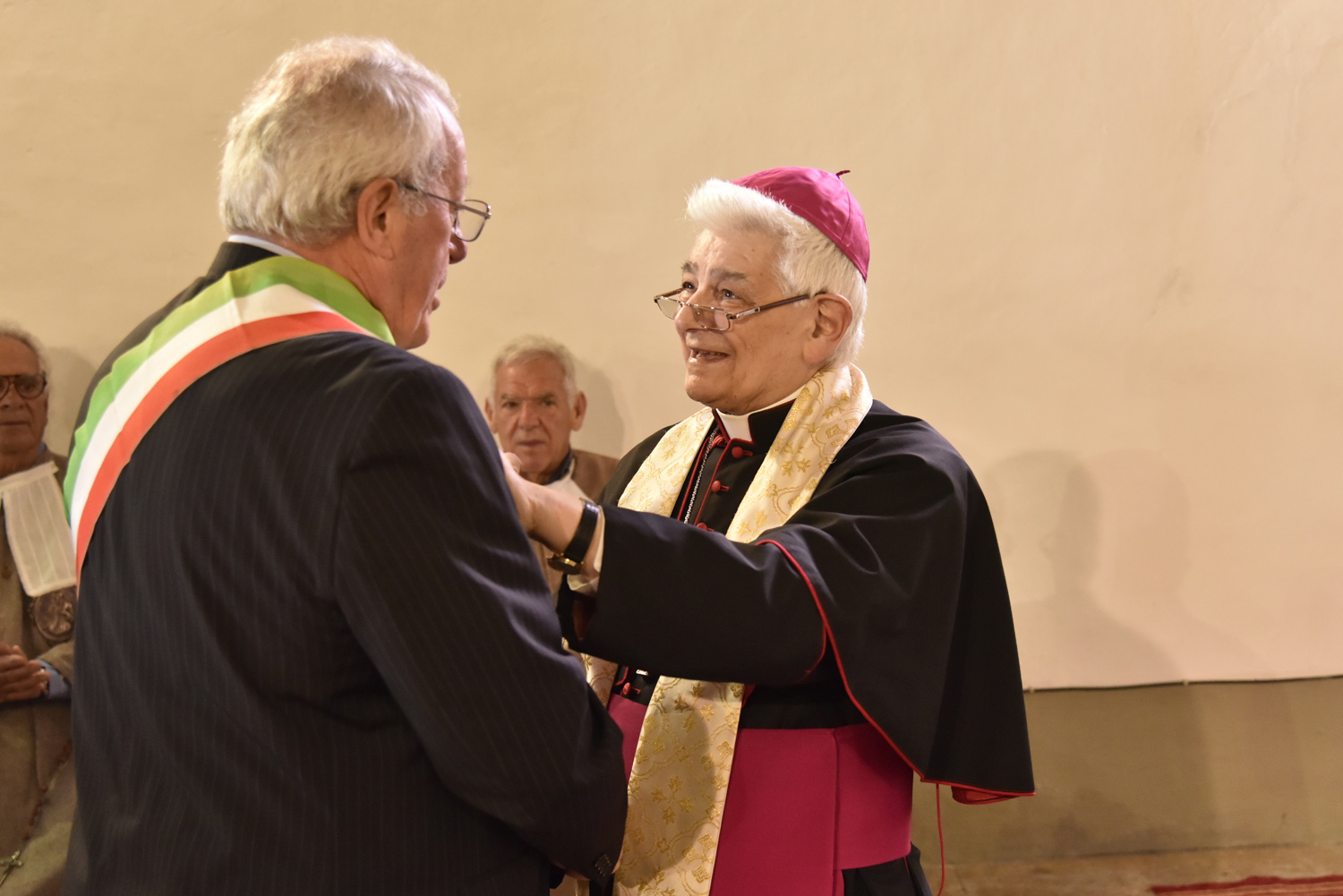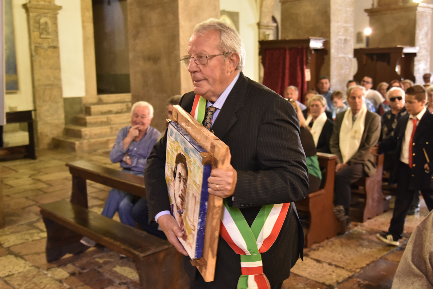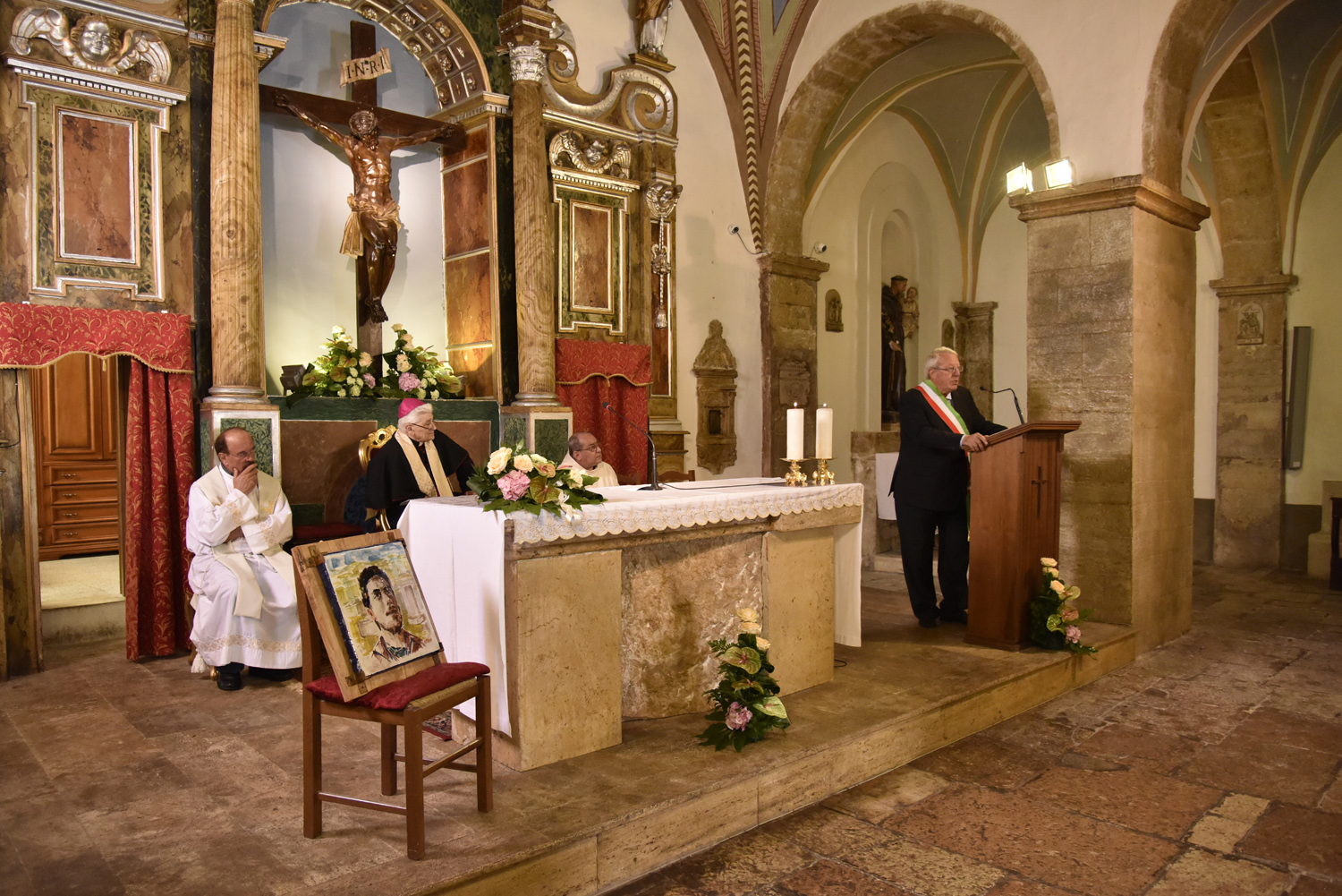 Al termine della Messa, l’atto di omaggio della comunità di Labro a quella di Colli, ricambiando il gesto svolto poco prima nella collegiata che di Colli è la “chiesa matrice”: stavolta è il sindaco di Labro, Gastone Curini, a consegnare a quello di Colli, Alberto Micanti, un quadro in bassorilievo, raffigurante la patrona santa Maria Maddalena, anch’esso opera dell’artista Franco Bellardi. Residente in paese e autore del ciclo pittorico che arricchisce la chiesa con l’affresco dell’abside e le quattro tele agli altari laterali, anche il pittore ha rivolto il suo saluto ai convenuti, prima che il Santissimo Sacramento venisse esposto nell’ostensorio. La santa ostia, sotto il baldacchino sorretto dai confratelli, è stata condotta nel sacro corteo, con la partecipazione dei parrocchiani e dei sodalizi con i loro stendardi e insegne, fino alla vecchia chiesa di Santa Maria Maddalena, fuori il paese, recuperata anni fa e di recente riconsacrata dal vescovo Pompili, dove è stato cantato il Te Deum di ringraziamento per concludere con la benedizione eucaristica impartita da monsignor Lucarelli.