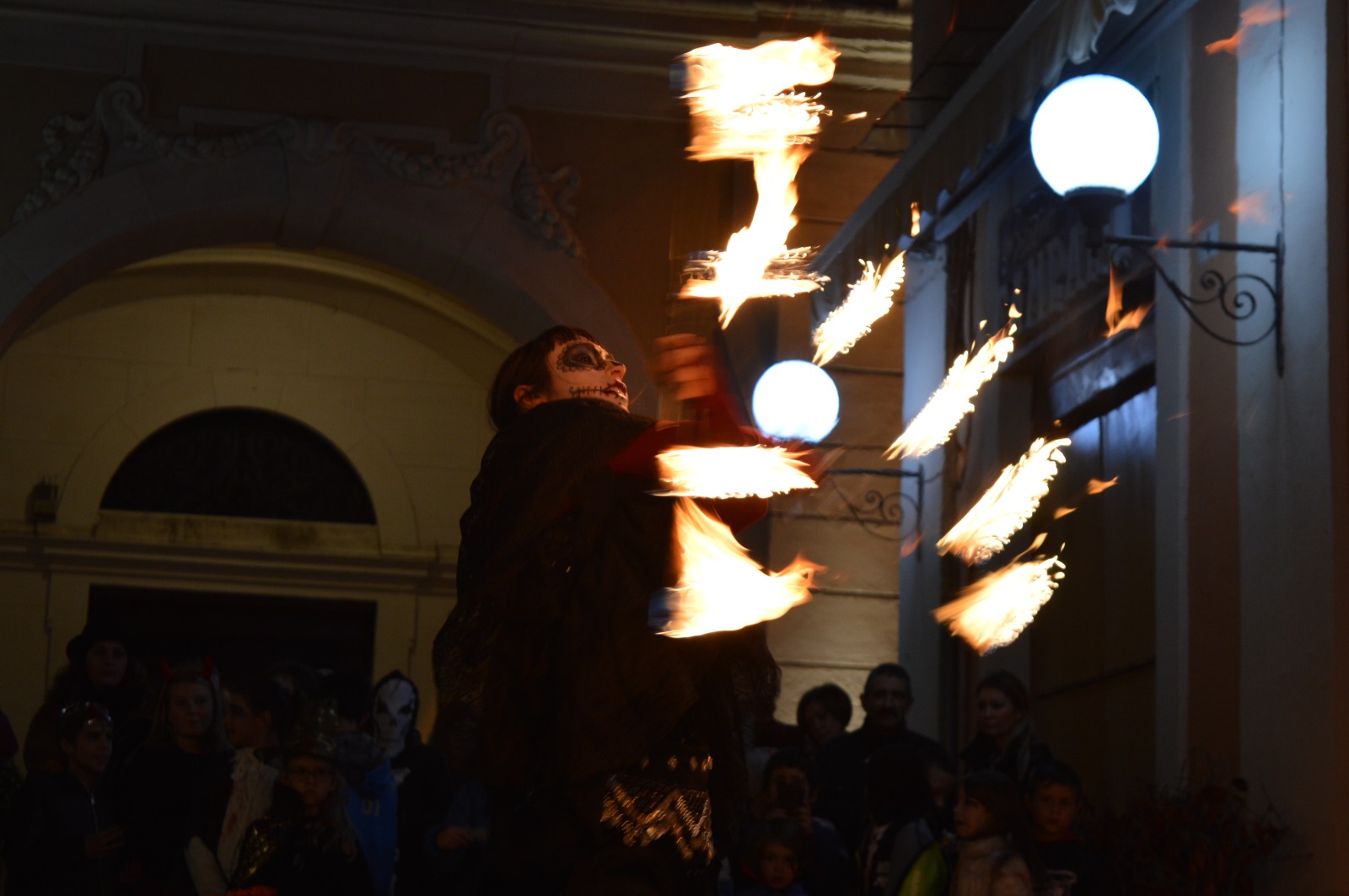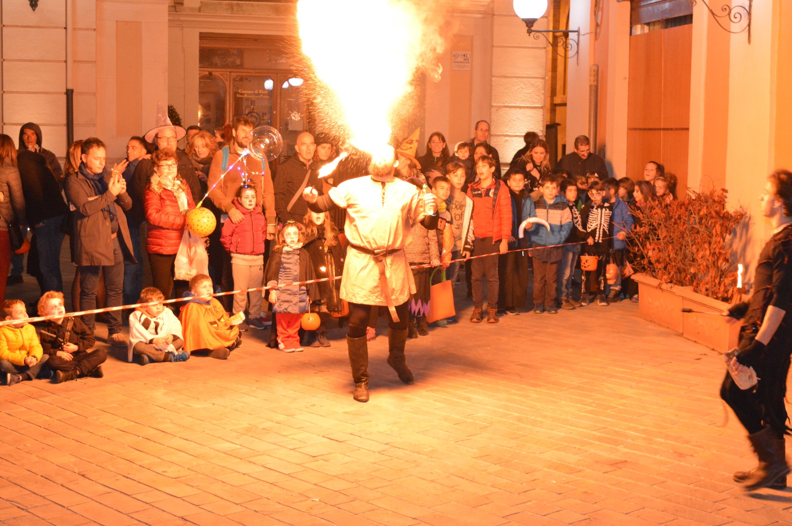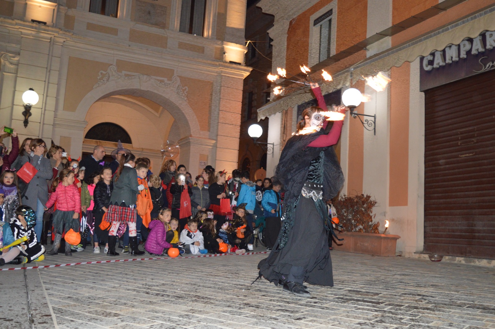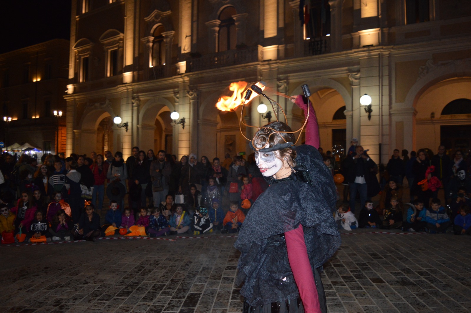 Un entusiasmante spettacolo che ha raccolto gli sguardi attenti e curiosi di tanti bambini mascherati per Halloween. Scroscianti applausi al termine di ogni esibizione dei giocolieri del fuoco.