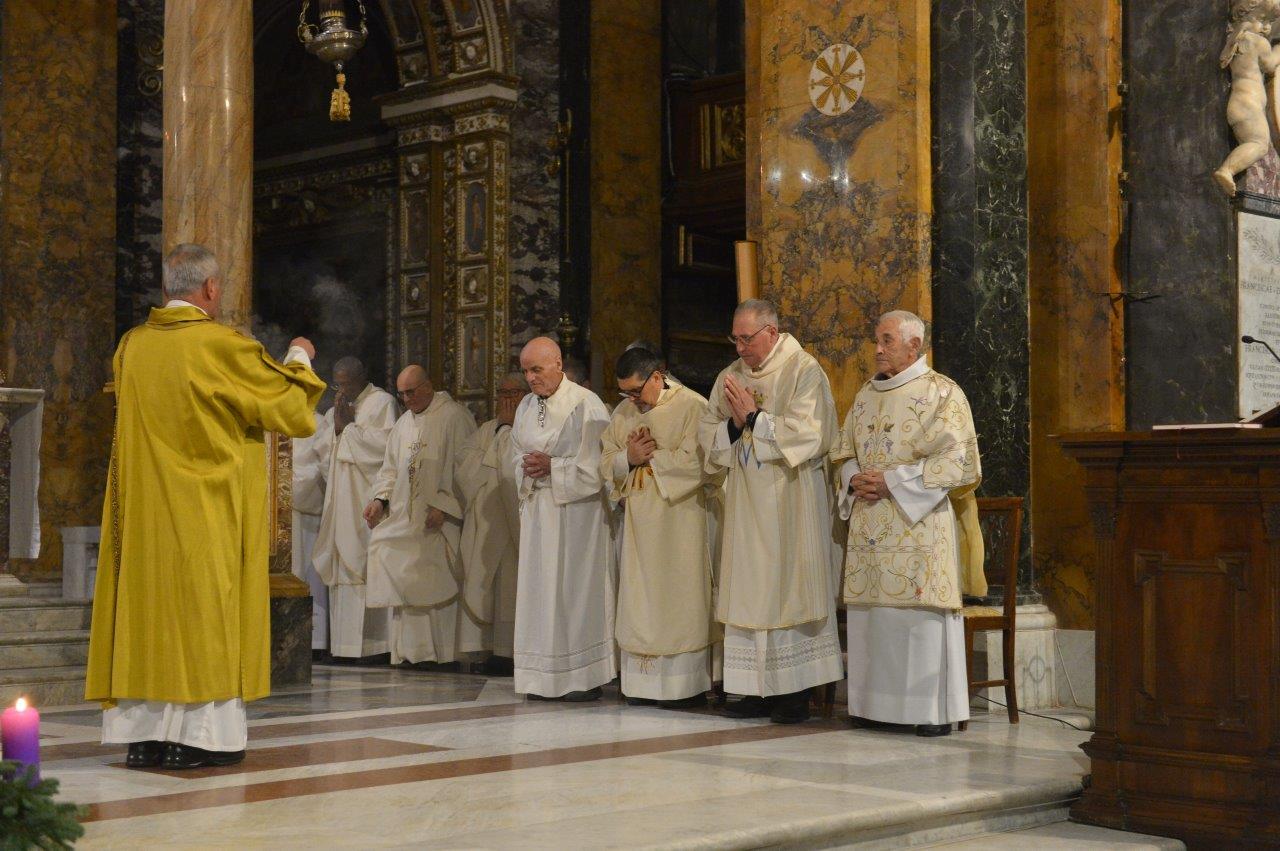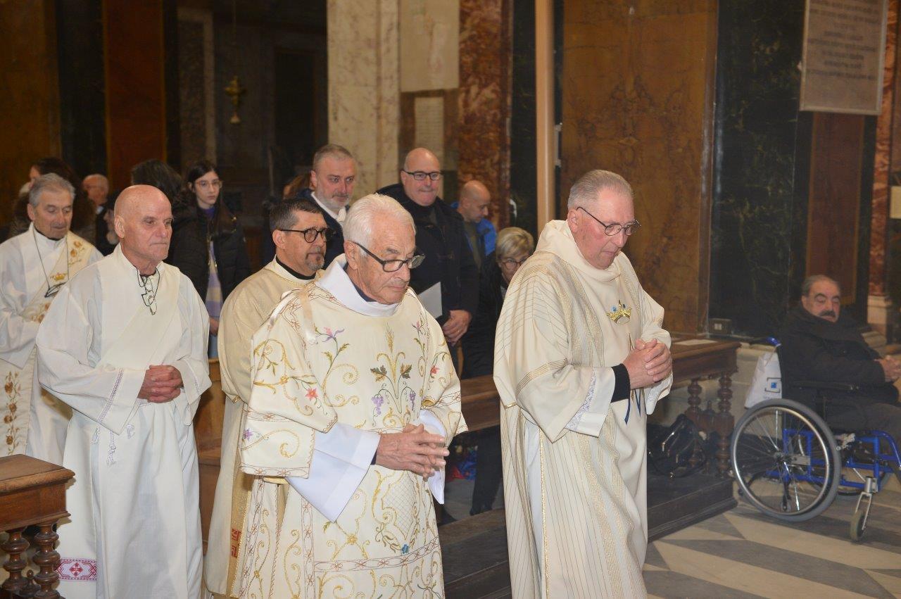 Era infatti l’otto dicembre del 2004 quando il compianto mons. Delio Lucarelli, nel Duomo reatino, conferiva l’ordinazione diaconale a sette uomini, significativamente lo stesso numero dei primi sette diaconi che gli apostoli, nella primitiva Chiesa di Gerusalemme, scelsero come speciali coadiutori nel ministero. Con loro quattro c’erano anche Francesco Corso, che poi si è spostato nel clero di Roma (avrebbe partecipato volentieri anche lui a questa liturgia di anniversario ma ha avuto un impedimento all’ultimo) e poi Silvano Silvani e Gilberto Aleandri, che sono nel frattempo tornati alla casa del Padre. Per loro – insieme agli altri due diaconi della Chiesa reatina defunti, Agostino Russo e Arnaldo Proietti – non è mancato il pensiero rivolto da don Vito che, affiancato da altri diaconi e da alcuni presbiteri, ha presieduto la Messa che si è aperta con il canto del Tota pulchra, il tradizionale inno dedicato a Maria Immacolata: la “tutta bella”, la tutta santa che, come la luna dal sole, si è fatta illuminare da Dio e ha saputo far risplendere il luminoso amore con cui Dio l’ha amata.