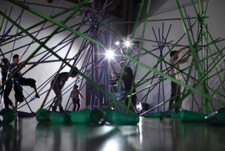 Un intervento performativo che trasforma lo spazio rettilineo nello spazio/tempo curvo, coinvolgendo il pubblico nella creazione di un ambiente-architettura: un happening del “qui e ora”.