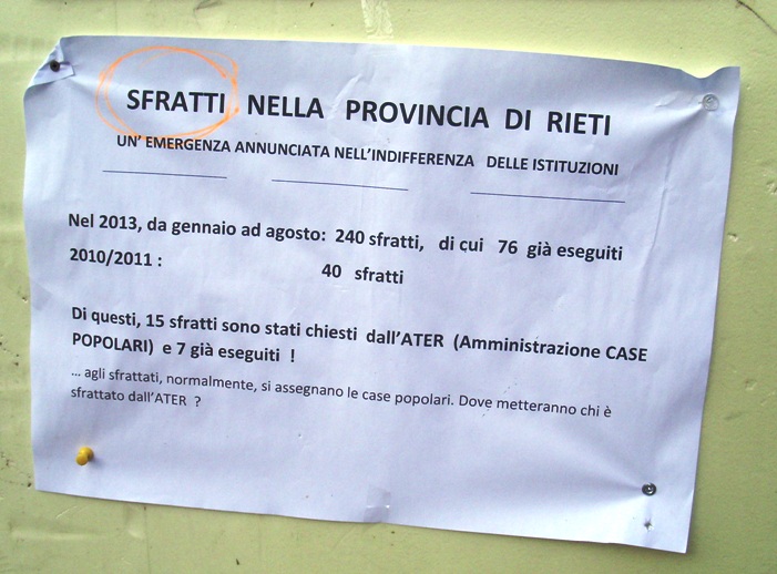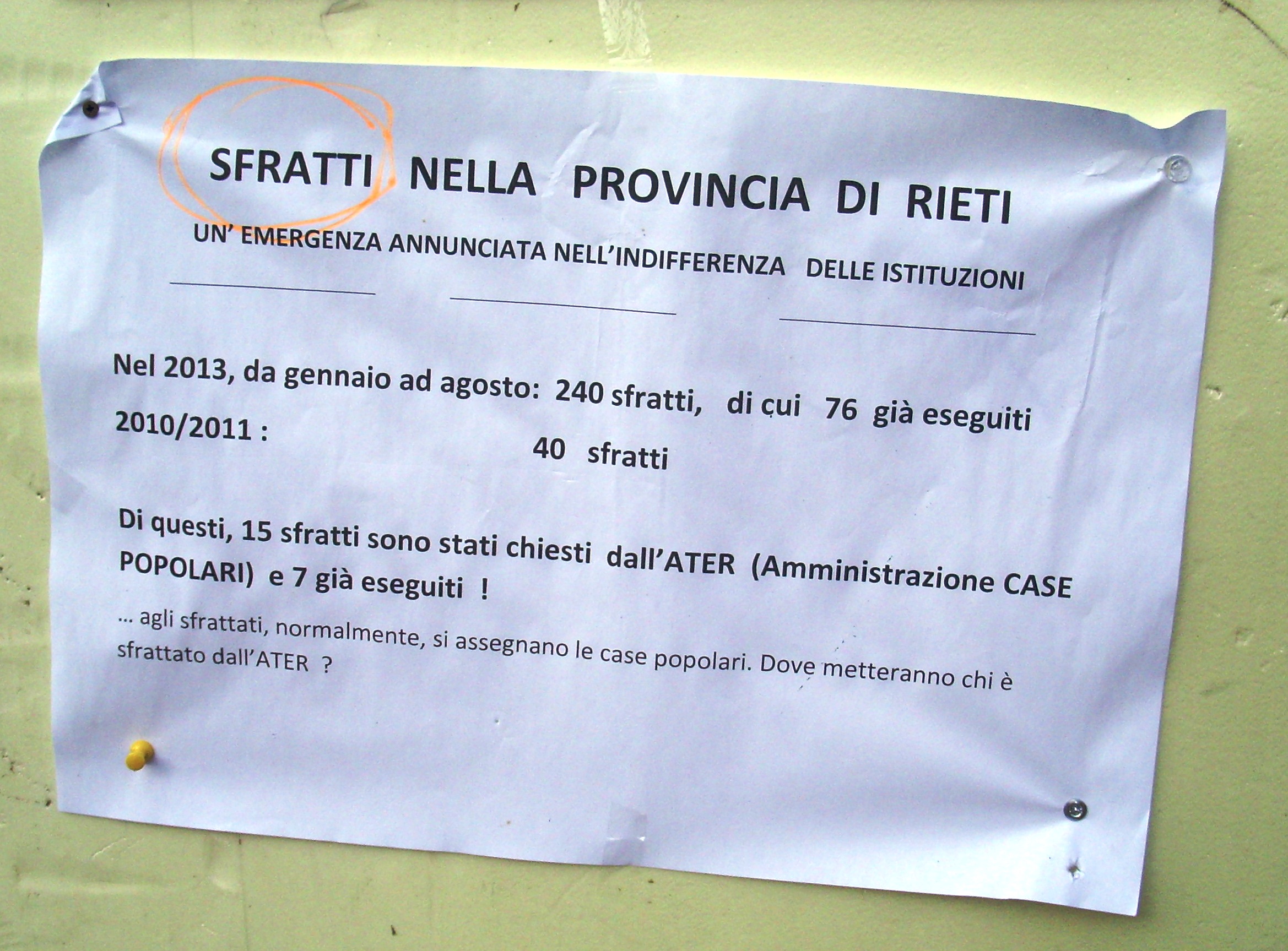 Attualmente in Italia sono 700 mila le richieste per gli alloggi popolari, mentre la fascia di disagio abitativo riguarda almeno 4-5 milioni di italiani. Sulla scia della mozione presentata alla Camera e della crisi abitativa di alcune famiglie reatine i Grilli Parlanti di Rieti intendono richiedere al Comune, secondo l’art. 23 del regolamento comunale approvato con deliberazione del Consiglio comunale n. 17 del 25/02/2009, l’esatto numero e localizzazione delle proprietà comunali, reclamandone il rispetto.