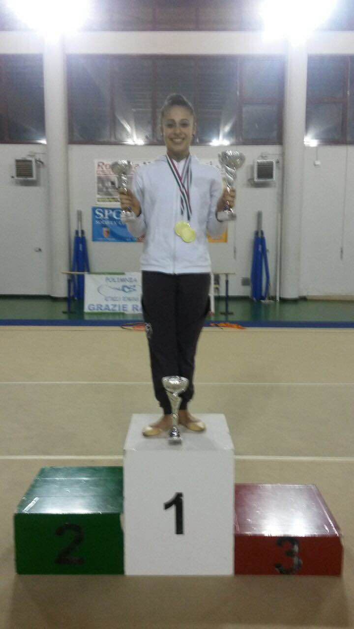 Alice era la ginnasta più giovane del campionato, e alla sua prima esperienza nella categoria senior, è già vincitrice di due titoli regionali dimostrando un’ottima preparazione tecnica eseguendo in modo eccellente gli esercizi con le clavette e con il cerchio, con invidiabile grinta e magnifica espressione esecutiva.