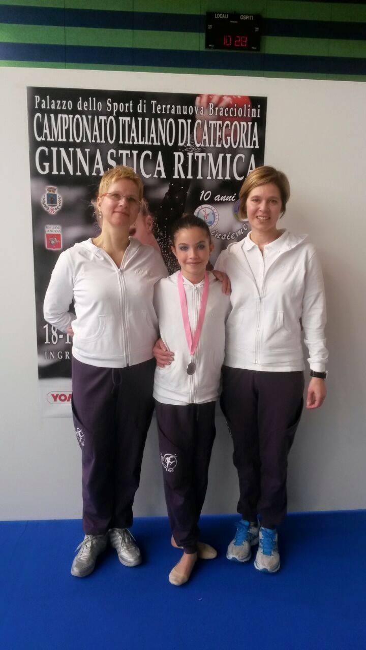 Marzia Tarquini con la sua prima esperienza al Campionato Nazionale di Categoria e come primo anno nel settore agonistico, ottiene lo splendido decimo posto in classifica generale, e si riconferma la migliore ginnasta del Lazio nella sua categoria. Una ginnasta di soli 9 anni che nell’arco della stagiona agonistica 2014/ 2015 è già salita due volte sui podi regionali, vincendo il Torneo Regionale Allieve e conquistando l’argento al Campionato Regionale di Categoria, qualificandosi così per il Campionato Interregionale di Categoria ( zona Centro-Ovest ), dove si aggiudica il titolo di Vicecampionessa Interregionale, per arrivare poi alla prestigiosissima qualificazione al Campionato Nazionale. E’ una ginnasta bellissima, elegante, espressiva, con grande grinta e determinazione ,con la voglia di migliorare sempre di più le sue prestazioni agonistiche in campo di gara, cercando di imparare i nuovi elementi nel maneggio con gli attrezzi e acquisire maggiore tecnica nello studio delle difficoltà corporee. Al termine della manifestazione, significative sono state le parole della Direttrice Tecnica Nazionale Marina Piazza che si è complimentata con le ginnaste in gara e con le loro allenatrici per l’ottima preparazione tecnica ed artistica delle giovani atlete, simbolo di un futuro promettente per la ginnastica ritmica. Quindi una grande soddisfazione per la Eos e per le tecniche Nina Trouchkova e Tatiana Sinogheikina ad avere una ginnasta così giovane ma con il bagaglio dei risultati già così grande!