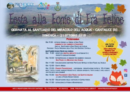 Una grande festa alla “fonte di San Felice” con la camminata fino al santuario del miracolo dell’acqua organizzata dalla Pro Loco di Cantalice per domenica 21 ottobre.