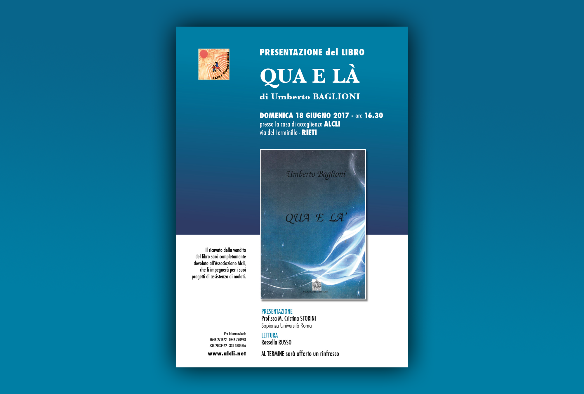 La prof.ssa Monica Storini, docente di Letteratura italiana della facoltà di Lettere all’Università La Sapienza di Roma, presenterà il libro, di cui saranno letti alcuni stralci dalla dott.ssa Rossella Russo. Al termine della presentazione sarà offerto un rinfresco. L’intero ricavato delle vendite del libro sarà devoluto all’Alcli.