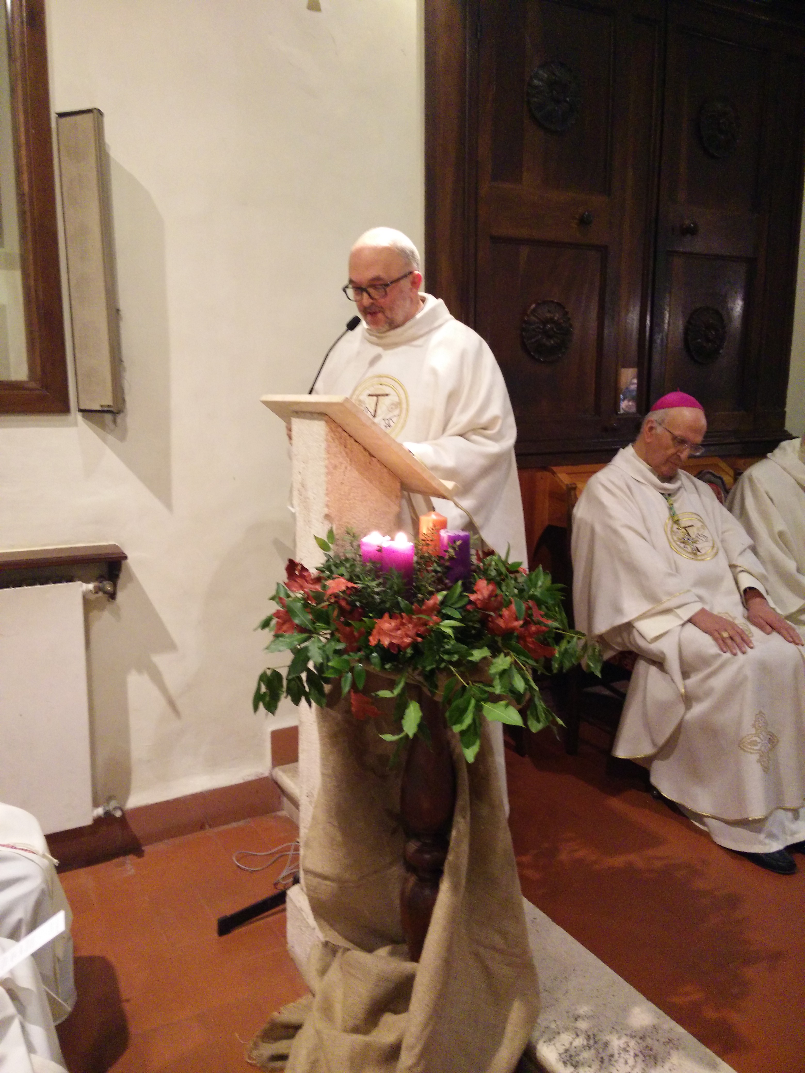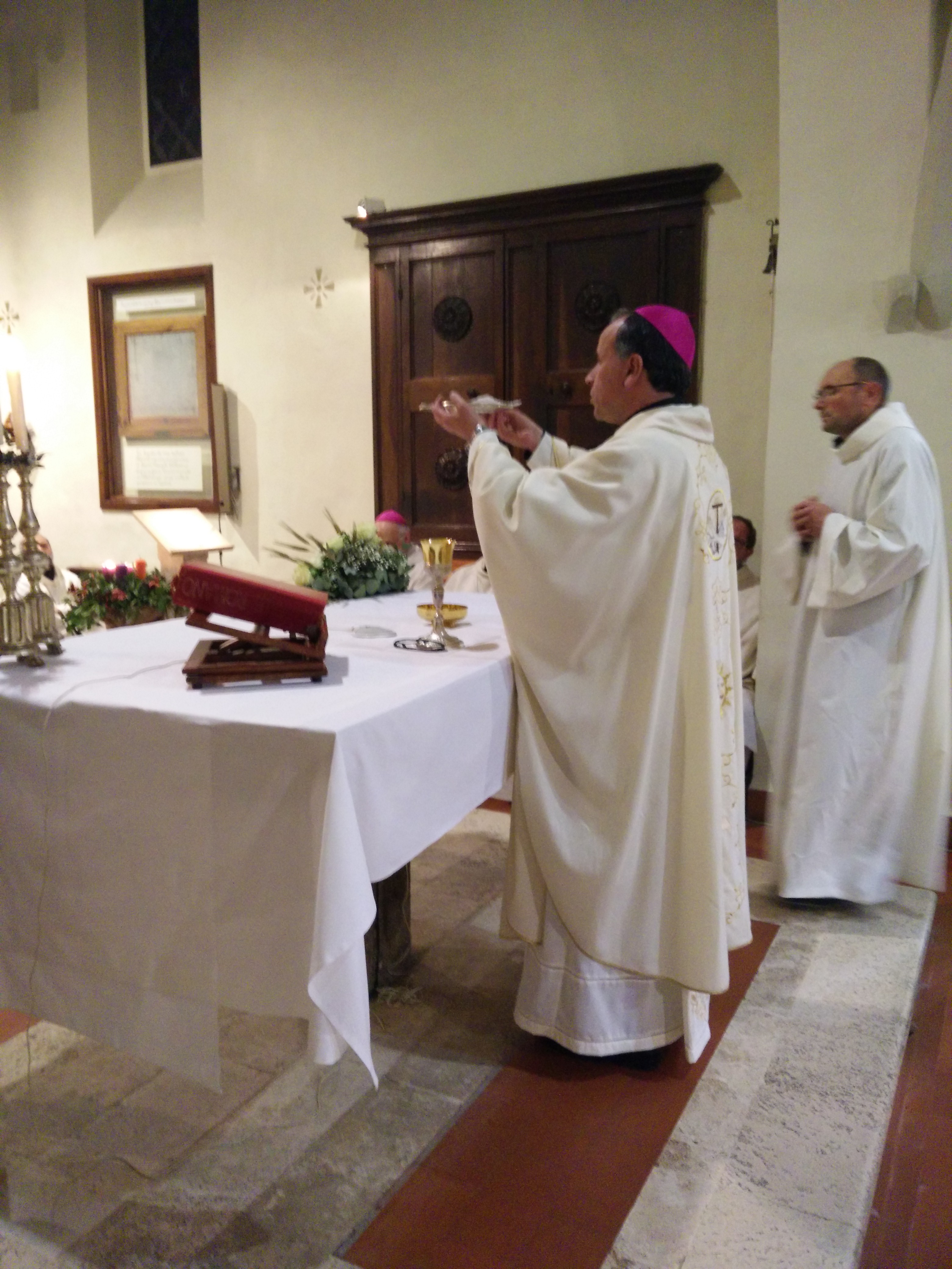 E con lui – e diversi sacerdoti, fra confratelli dell’ordine dei Minori e, del clero diocesano, don Valerio – a concelebrare, nella chiesa di Fonte Colombo, la solenne eucarestia presieduta da monsignor Domenico Pompili c’erano altri due vescovi: il reatino monsignor Lorenzo Chiarinelli e l’aquilano monsignor Giuseppe Molinari, che sulla cattedra episcopale reatina sedeva allorché, 25 anni prima, il francescano Ezio riceveva il sacramento dell’Ordine. Fra Ezio, nato e cresciuto a Fagge, paesino del Cicolano, aveva voluto infatti diventare sacerdote nella sua terra di origine, scegliendo la chiesa del monastero reatino di S. Chiara per la liturgia di ordinazione presbiterale. E fu Molinari, nel dicembre del 1991 ad imporgli per la seconda volta le mani, dopo che già aveva avuto la gioia di presiedere la sua ordinazione diaconale a Roma.