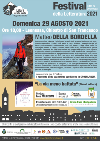 Dopo Federica Angeli, Gino Castaldo, Franco Arminio e Simona Lo Iacono, alle ore 18 presso il Chiostro di San Francesco, a salire sul palco sarà Matteo Della Bordella con il suo libro “La via meno battuta. Tutto quello che mi ha insegnato la montagna” (Rizzoli editore).