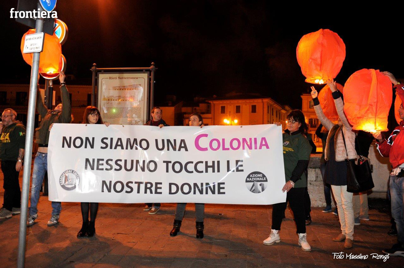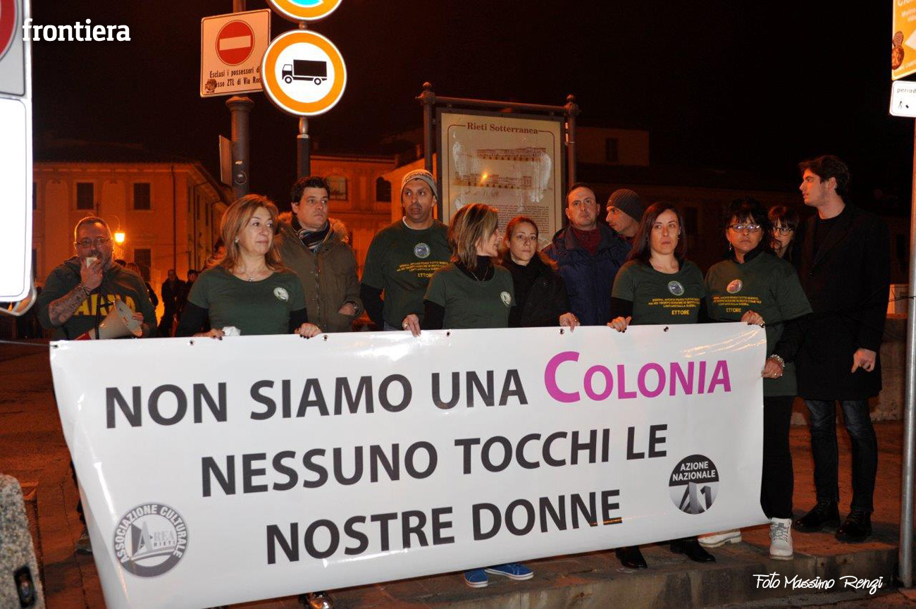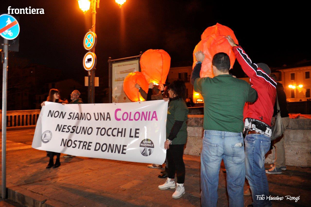 Nella serata del 9 gennaio, l’associazione Area Rieti – Azione Nazionale ha dato vita ad un Flash Mob di protesta rispetto a quanto accaduto nella notte tra giovedì 31 dicembre e venerdì 1 gennaio a Colonia, in Germania, dove decine di donne sono state molestate sessualmente. Le aggressioni sono avvenute nella zona centrale della città dove si trovano il duomo e la stazione.