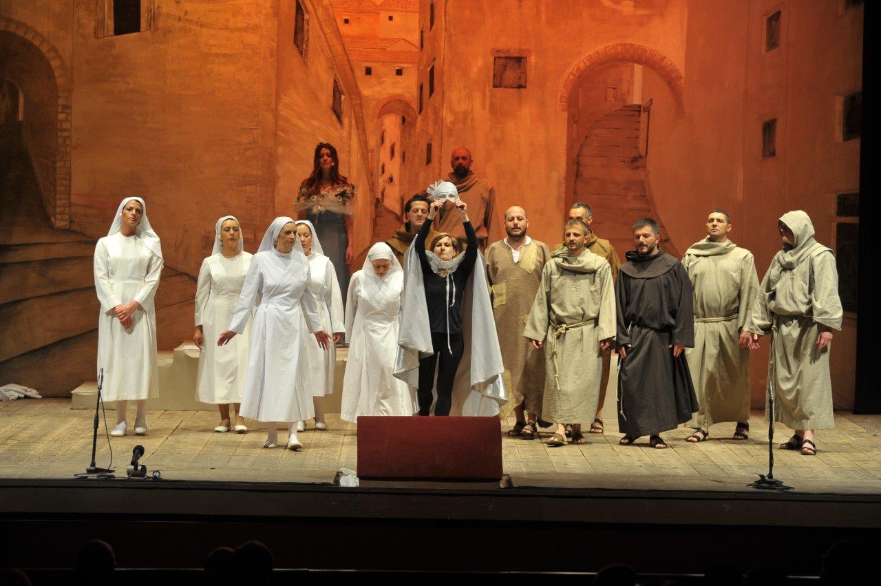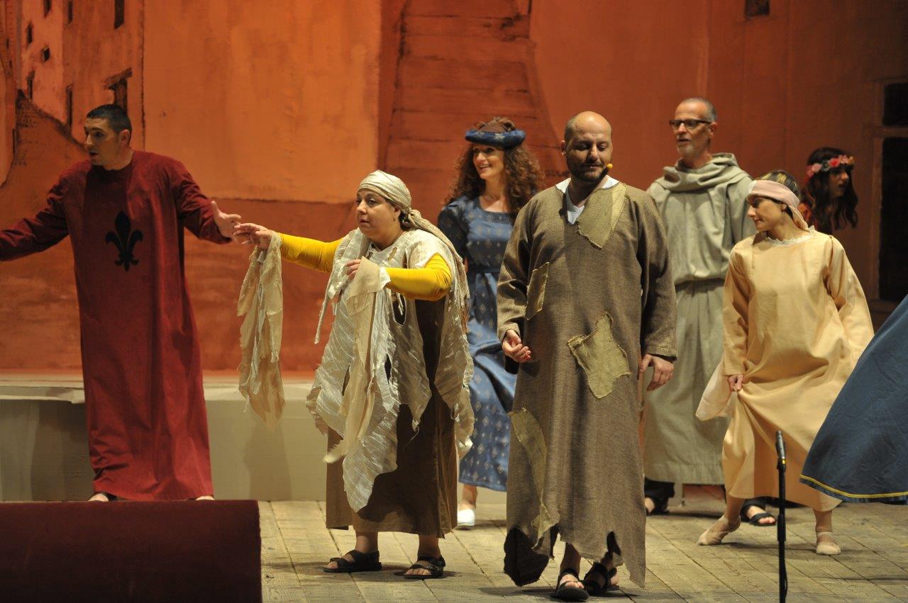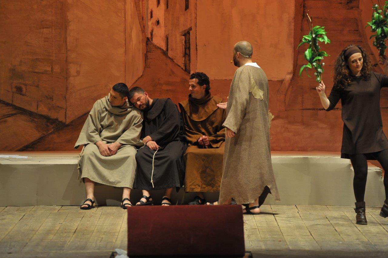 Bravi tutti gli interpreti, cominciando dai due protagonisti dei dialoghi, Luca Santori nel ruolo di Pietro Bernardone e la pimpante spalla suor Patrizia Cimmino nei panni della “Cenciosa”, e poi i due papà alternatisi nel prestare in canto la voce al personaggio di Francesco, Claudio De Santis e Danilo Formichetti, e ancora la giovanissima Mariana Ottaviani (Chiara), Valentina Onofri (Provvidenza e Povertà), Domenico Ottaviani (Lupo), Manuel Baldi (Diavolo), e Annalisa Blasetti (Morte e Luna). A guidare le coreografie Martina Ricciutelli e suor Kristina Gjonaj, mentre Maria Rosaria De Rossi e Paolo Paniconi hanno coordinato il canto, Alessio Angelucci e Andrea Pitoni la recitazione e i testi, le scenografie e i costumi sono stati invece curati da Desirè Proietti Lupi, Giovanni Tomassetti, Laura Cardini e Martina Di Marco, con la preziosa collaborazione della Confraternita di Misericordia di Rieti che ha messo a disposizione gli abiti d’epoca.