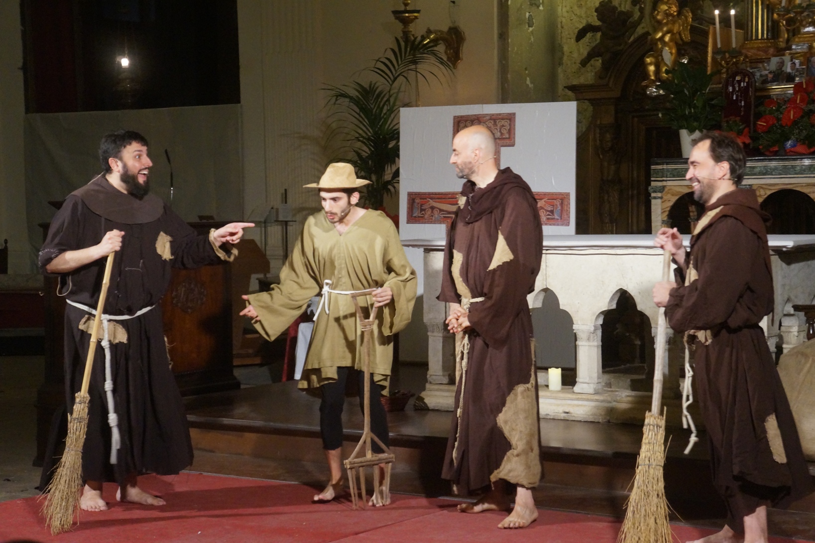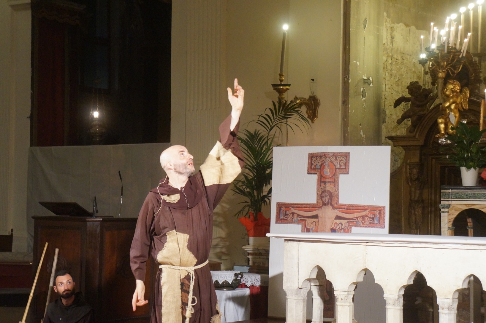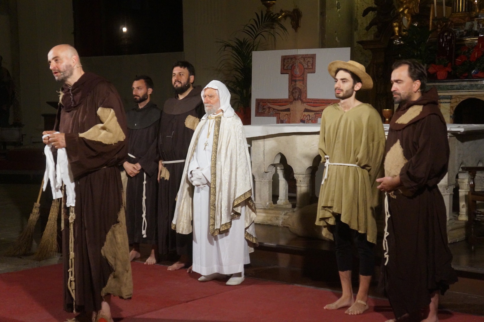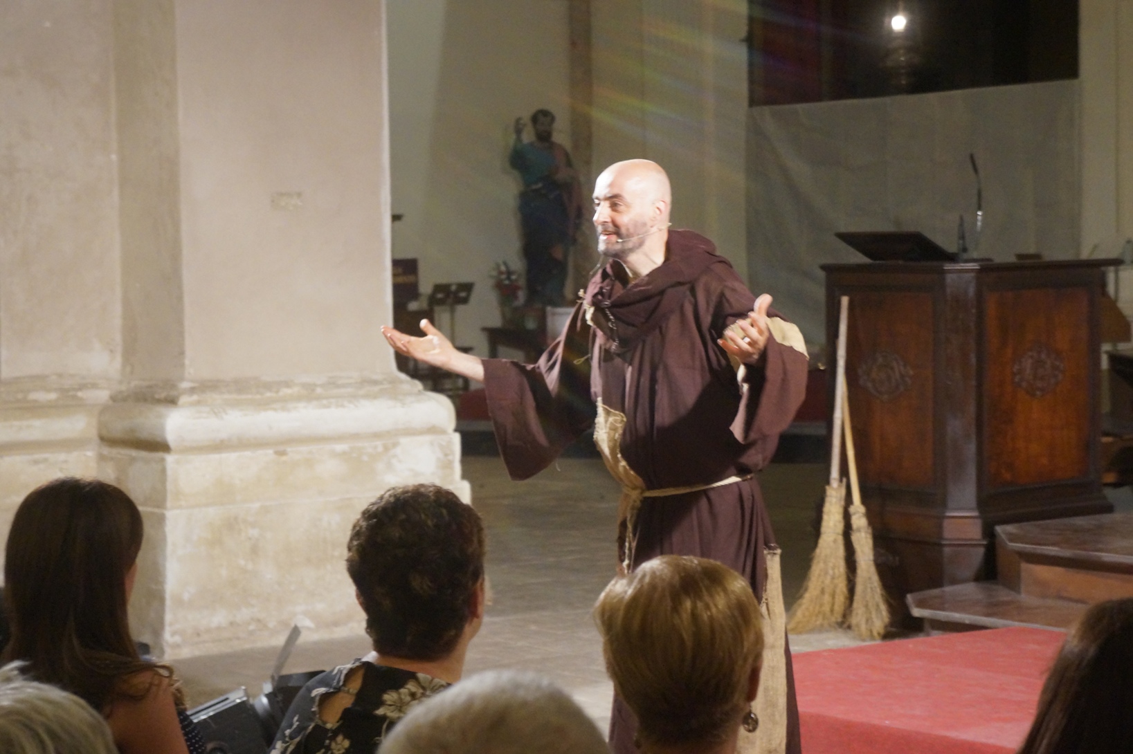 Mercoledì 21 giugno, presso la chiesa di san Francesco, è stato rappresentato lo spettacolo teatrale “Francesco e i suoi frati” di e con fra Renzo Cocchi per la regia di Cataldo Nalli. Il recital unisce il racconto di alcuni momenti salienti della vita di san Francesco con canzoni originali (di fra Renzo Cocchi e Daniele Marcelli) ispirate alla storia e allo spirito francescano. Si va dalla giovinezza alla conversione, dalla vita quotidiana alla benedizione papale, passando per la regola di Fontecolombo e il presepe di Greccio. Molto intense la scena in cui il santo riceve le stigmate, come pure quella della sua morte. Le canzoni, cantate dallo stesso fra Renzo, sono la ciliegina sulla torta dello spettacolo e contribuiscono a trasmettere con semplicità e leggerezza il messaggio di Francesco.