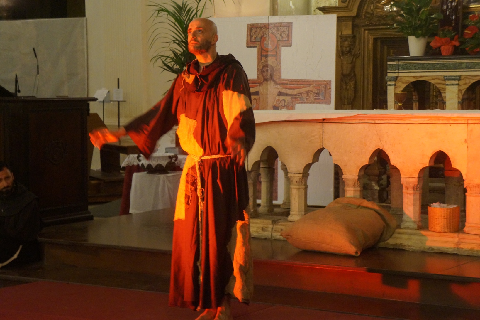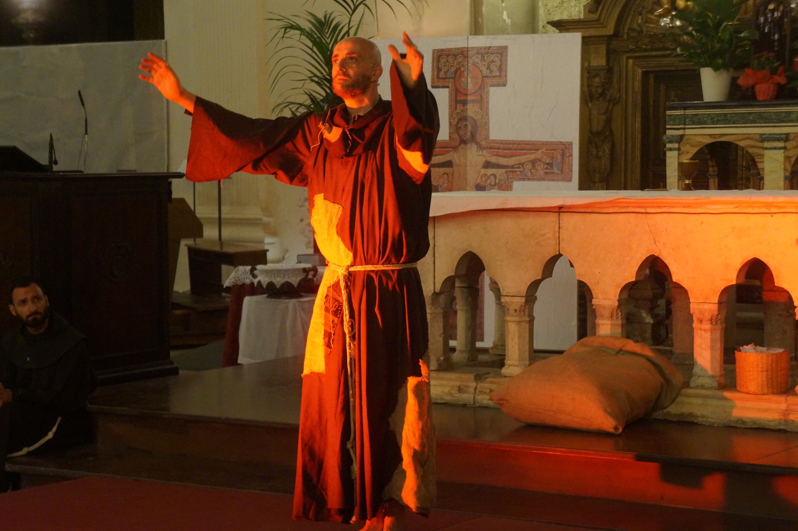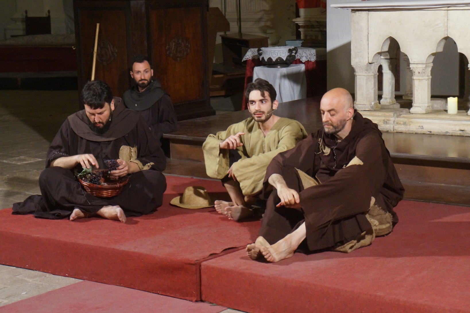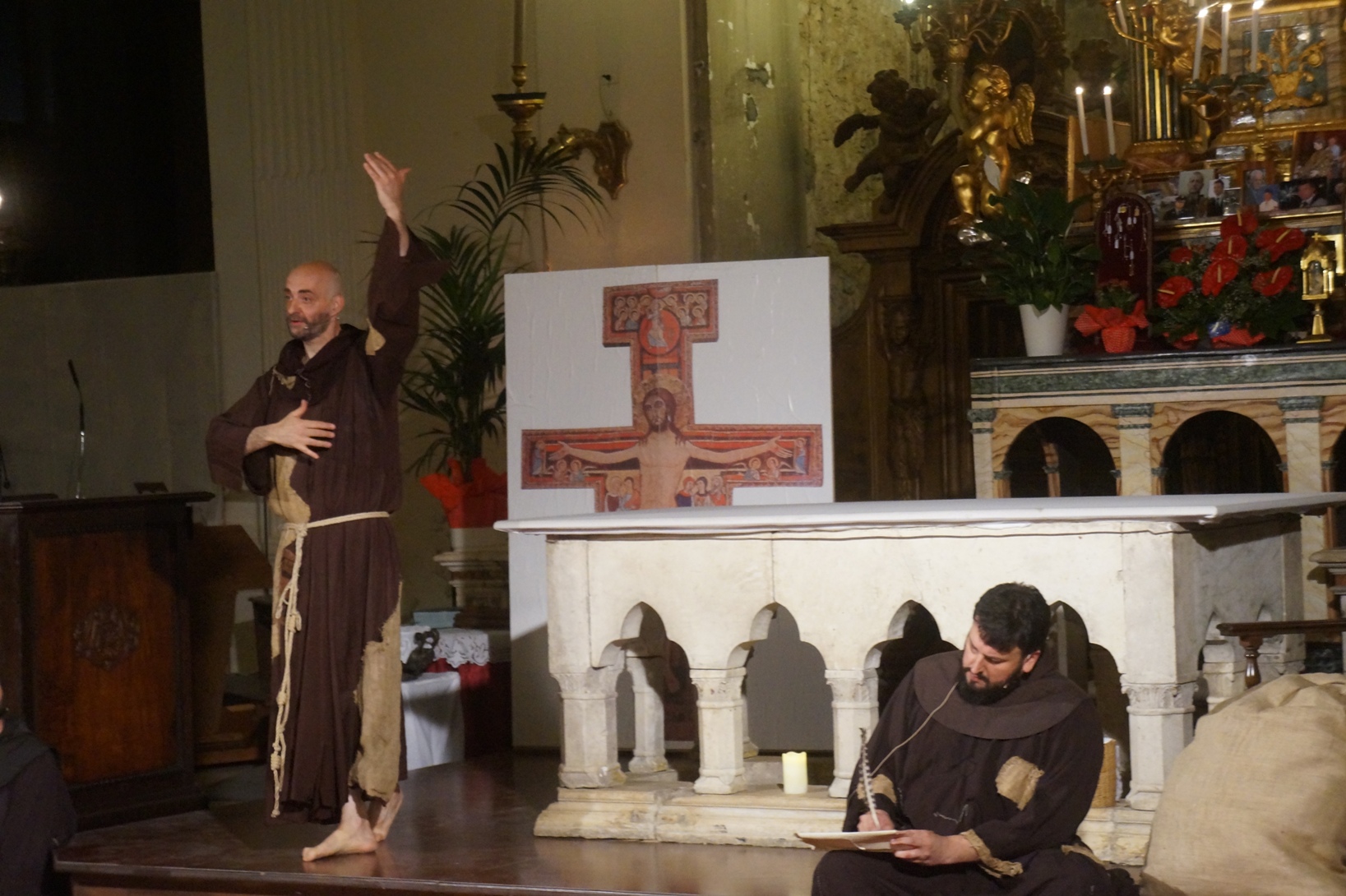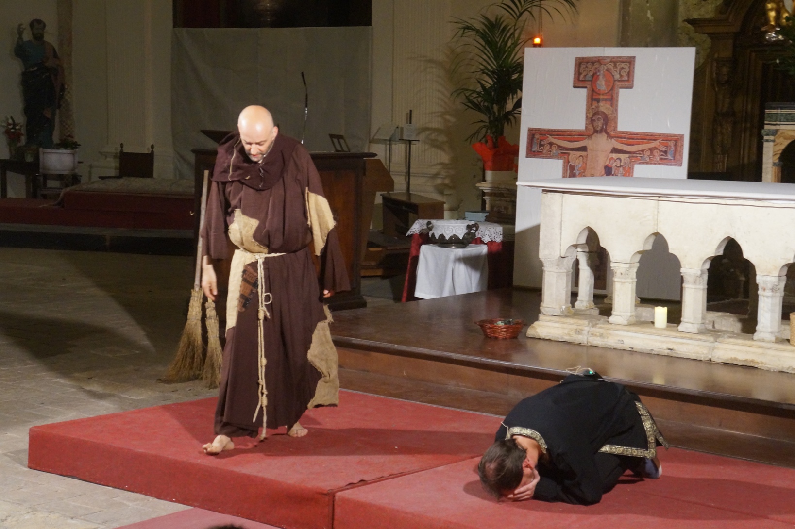 Mercoledì 21 giugno, presso la chiesa di san Francesco, è stato rappresentato lo spettacolo teatrale “Francesco e i suoi frati” di e con fra Renzo Cocchi per la regia di Cataldo Nalli. Il recital unisce il racconto di alcuni momenti salienti della vita di san Francesco con canzoni originali (di fra Renzo Cocchi e Daniele Marcelli) ispirate alla storia e allo spirito francescano. Si va dalla giovinezza alla conversione, dalla vita quotidiana alla benedizione papale, passando per la regola di Fontecolombo e il presepe di Greccio. Molto intense la scena in cui il santo riceve le stigmate, come pure quella della sua morte. Le canzoni, cantate dallo stesso fra Renzo, sono la ciliegina sulla torta dello spettacolo e contribuiscono a trasmettere con semplicità e leggerezza il messaggio di Francesco.