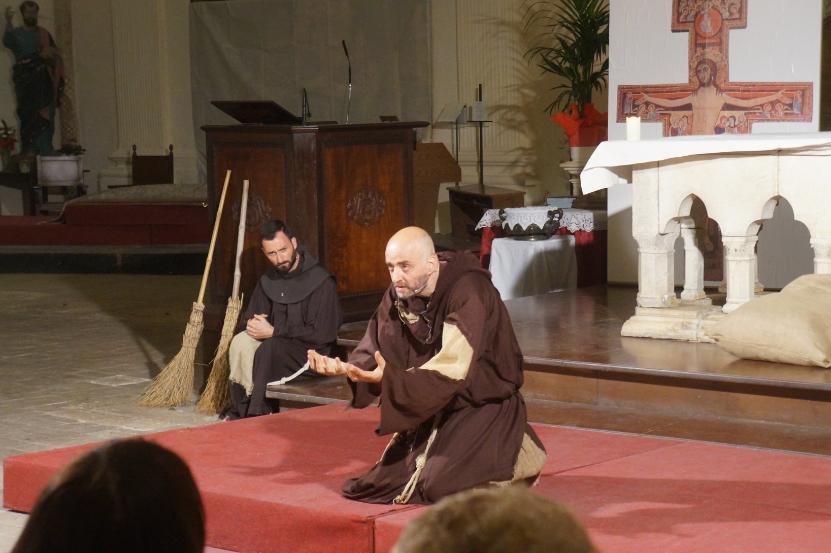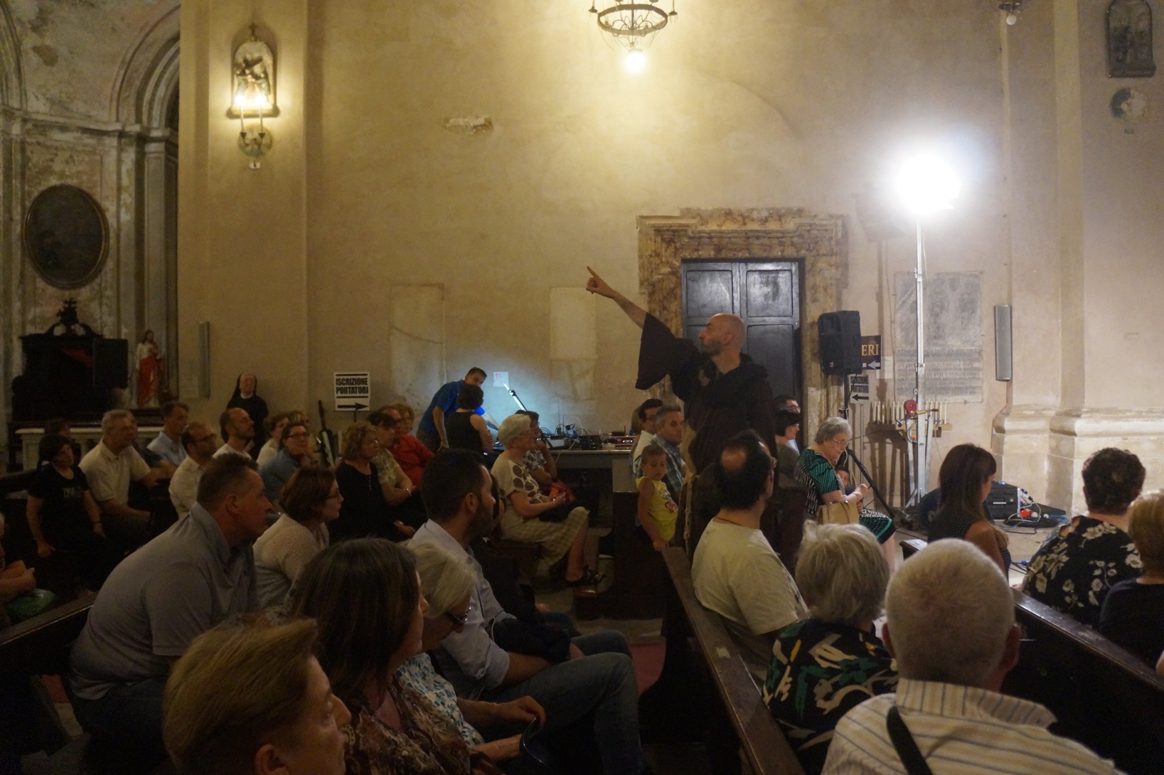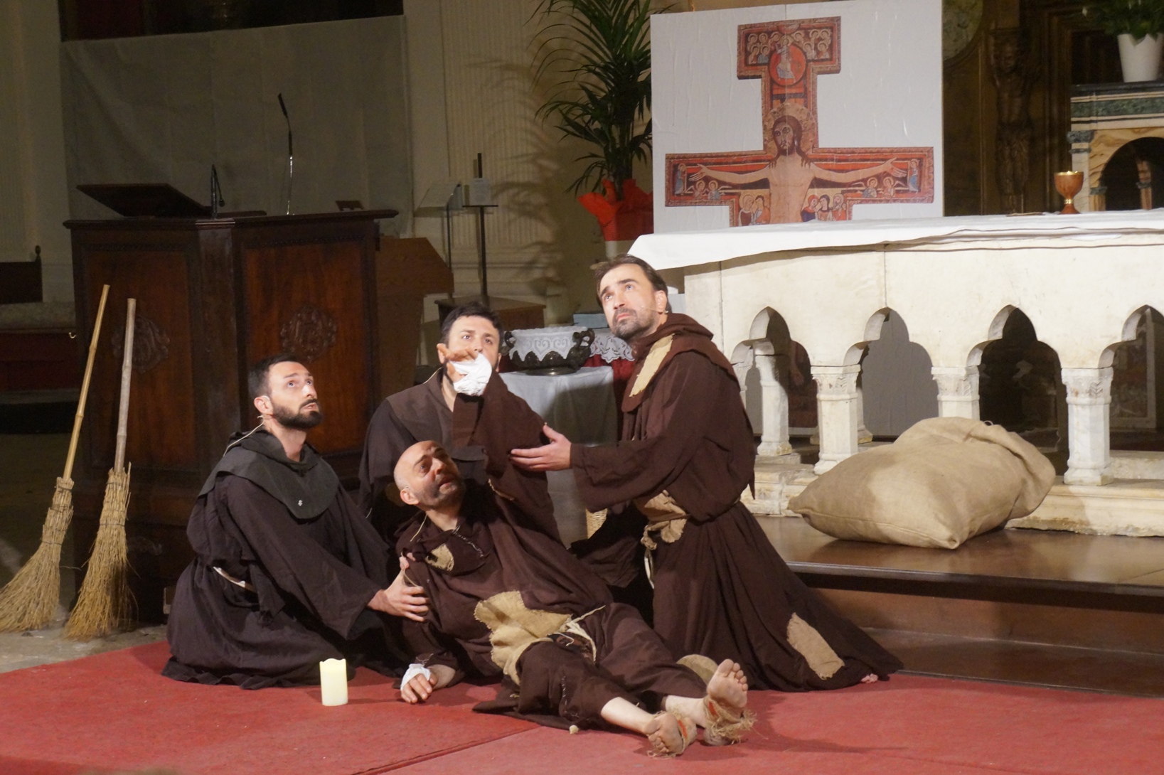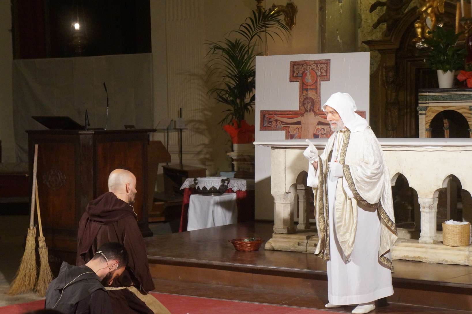 Mercoledì 21 giugno, presso la chiesa di san Francesco, è stato rappresentato lo spettacolo teatrale “Francesco e i suoi frati” di e con fra Renzo Cocchi per la regia di Cataldo Nalli. Il recital unisce il racconto di alcuni momenti salienti della vita di san Francesco con canzoni originali (di fra Renzo Cocchi e Daniele Marcelli) ispirate alla storia e allo spirito francescano. Si va dalla giovinezza alla conversione, dalla vita quotidiana alla benedizione papale, passando per la regola di Fontecolombo e il presepe di Greccio. Molto intense la scena in cui il santo riceve le stigmate, come pure quella della sua morte. Le canzoni, cantate dallo stesso fra Renzo, sono la ciliegina sulla torta dello spettacolo e contribuiscono a trasmettere con semplicità e leggerezza il messaggio di Francesco.