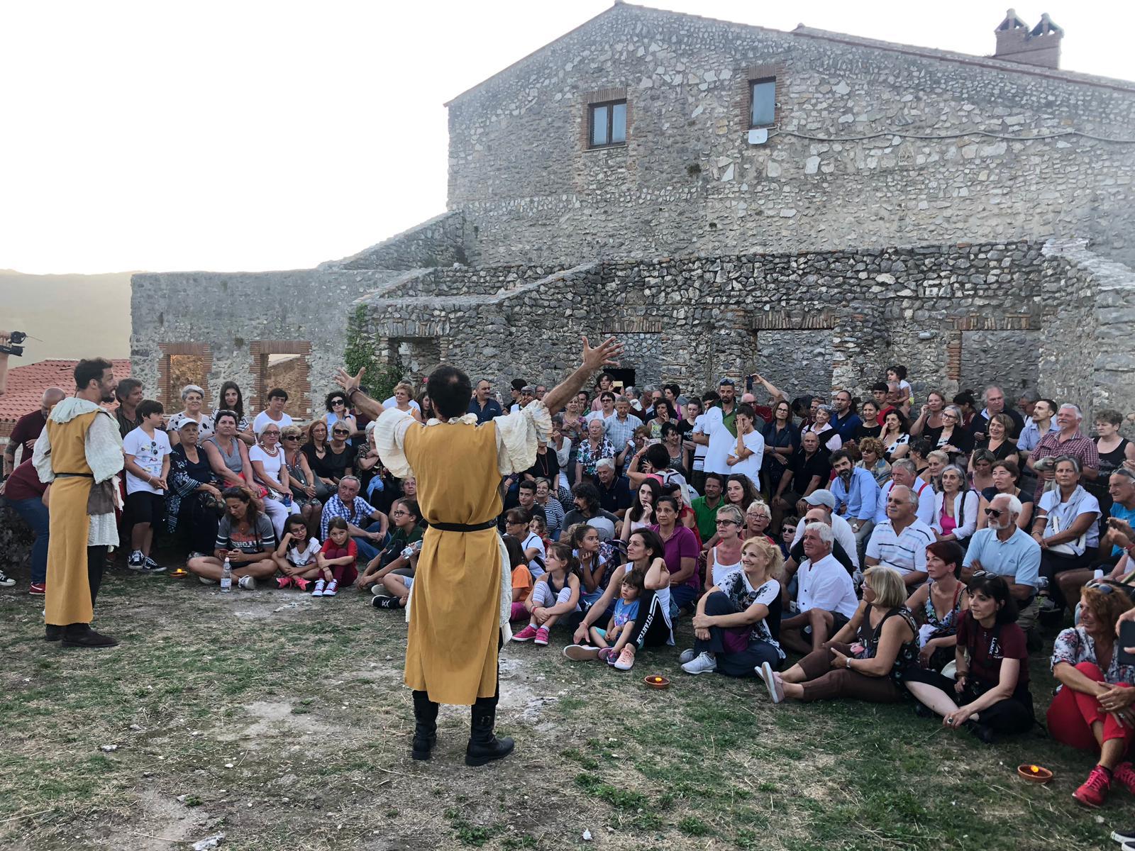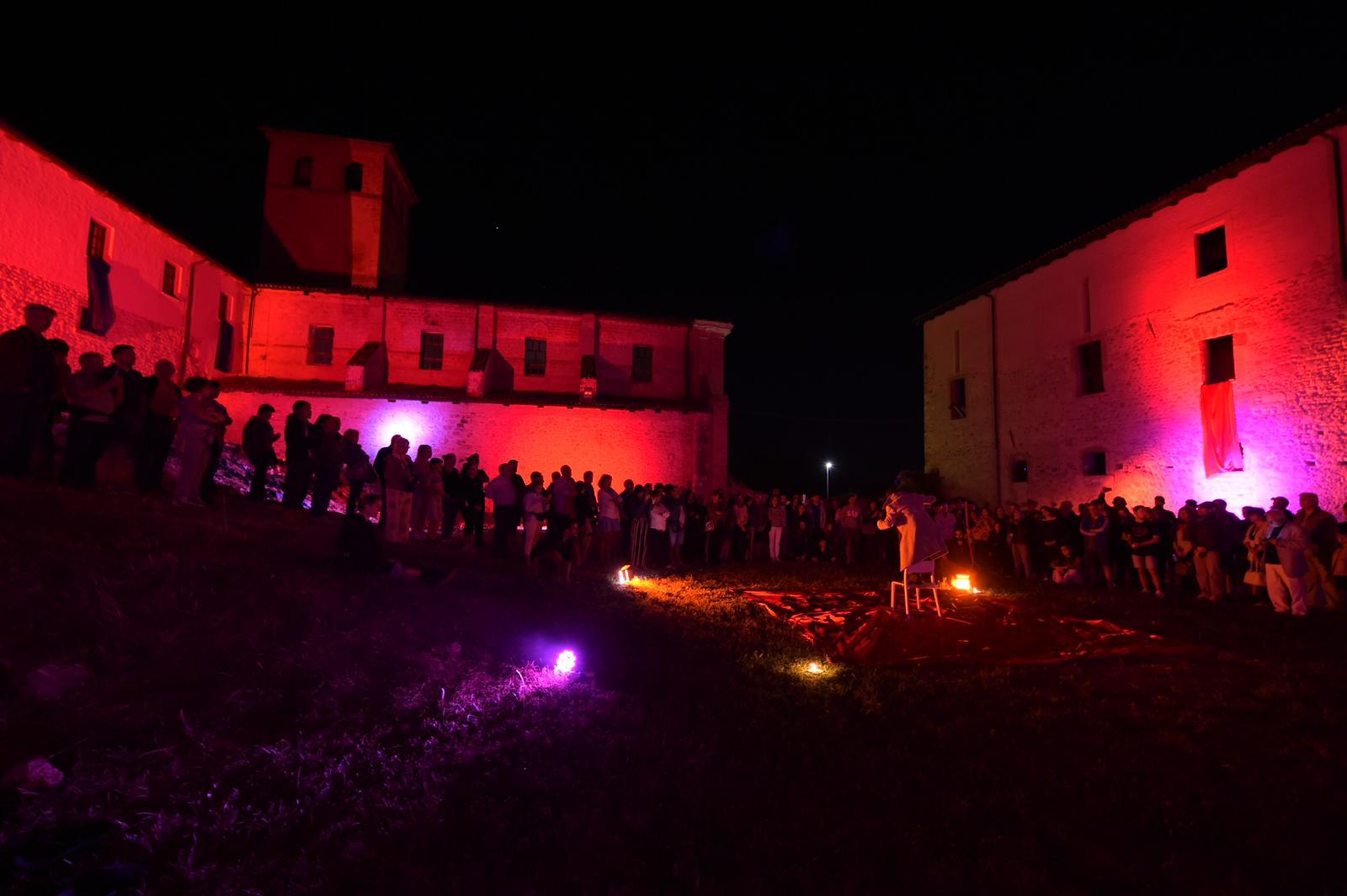 Un grande ringraziamento lo meritano anche i padroni di casa: a Rocca Sinibalda il professor Enrico Pozzi, che ha spalancato le porte del suo misterioso e mutevole Castello, e il sindaco Stefano Micheli; a Borgo Antuni la sindaca di Castel di Tora Cesarina D’Alessandro e il presidente della Riserva Cervia e Navegna Giuseppe Ricci: grazie alla loro assistenza e a quella dei guardiaparchi, dei ragazzi del Servizio Civile e dei volontari dell’associazione Camminando con, centinaia di persone sono potute arrivare fino in cima a Monte Antuni e godere lassù di due splendidi pomeriggi di teatro. Un grande grazie anche al sindaco di Concerviano Pierluigi Buzzi, che pur di consentire l’utilizzo della maestosa Abbazia di San Salvatore si è messo a totale disposizione dei gruppi teatrali. Il risultato sono stati i “Racconti di Shakespeare” del Potlach che hanno incantato il pubblico con giochi di luce e azioni sceniche e suggestioni quasi felliniane, e da ultimo il viaggio nell’Inferno di Dante con il Jobel, con la gente letteralmente immersa nel flusso dello spettacolo. Oltre 200 le persone che hanno sfidato la notte e la strada per arrivare e ripartire in piena sicurezza, grazie ad un servizio di gestione della viabilità impeccabile svolto dai volontari del Noe di Rieti.