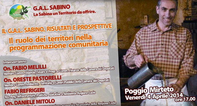 “Il Gal Sabino, risultati e prospettive. Il ruolo dei territori nella programmazione comunitaria”. È questo il titolo del convegno organizzato dal Gal Sabino che si terrà venerdì 4 aprile alle ore 17 presso la Nuova Sala della Cultura di Poggio Mirteto.