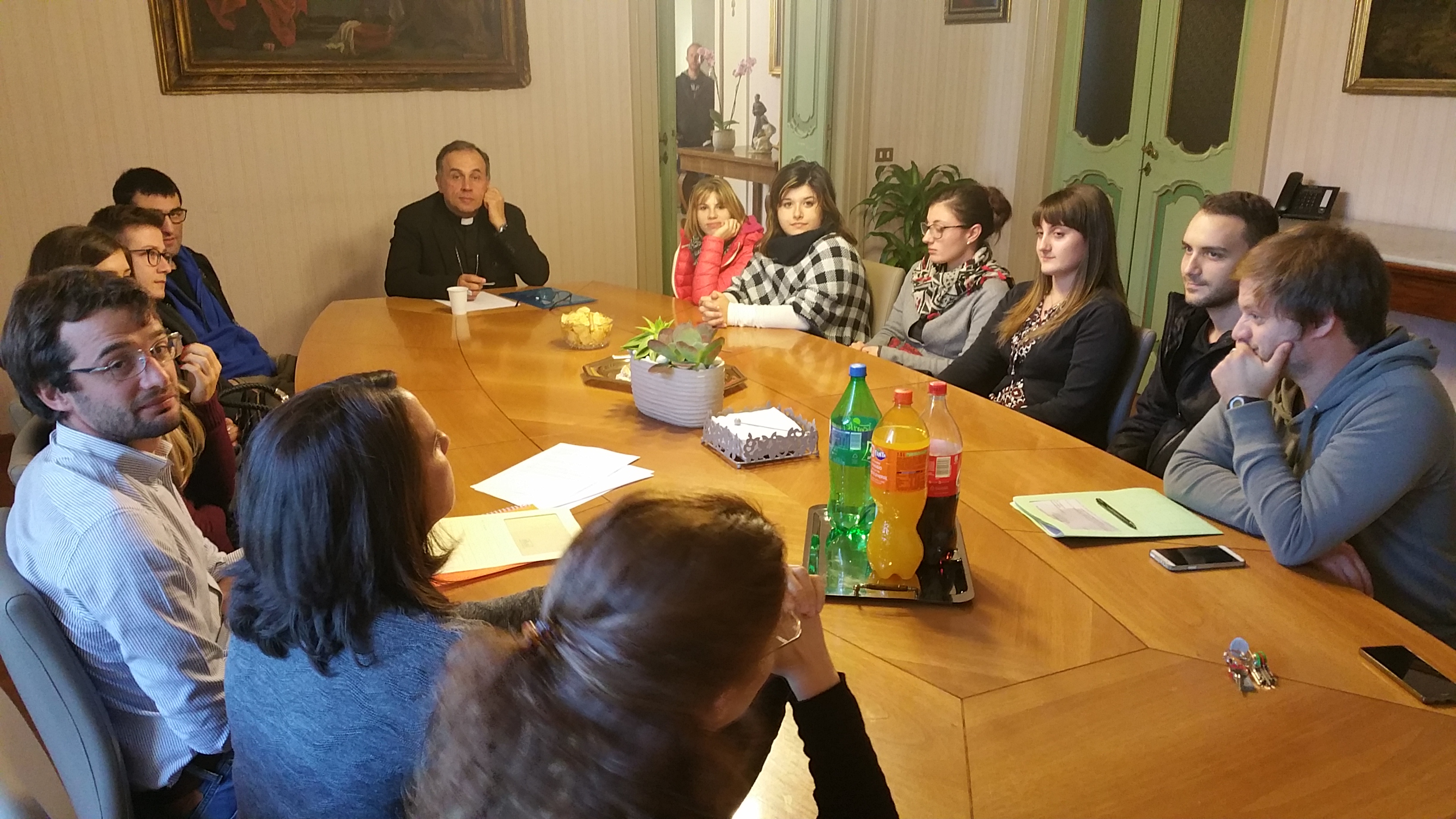 Nel tardo pomeriggio di lunedì 9 ottobre, al piano nobile dell’episcopio, il vescovo Domenico ha incontrato i volontari di #Si riparte con il patrimonio artistico e la cultura, il progetto di servizio civile di cui la Provincia di Rieti è ente capofila e la diocesi uno degli enti attuatori. A tre mesi dall’inizio dell’attività dei 14 ragazzi presso la curia vescovile, mons Pompili si è voluto sedere con loro intorno a tavolo per fare il punto della situazione e ascoltare le loro prime impressioni. Nelle intenzioni del vescovo quello con i volontari dovrebbe diventare un appuntamento almeno mensile.