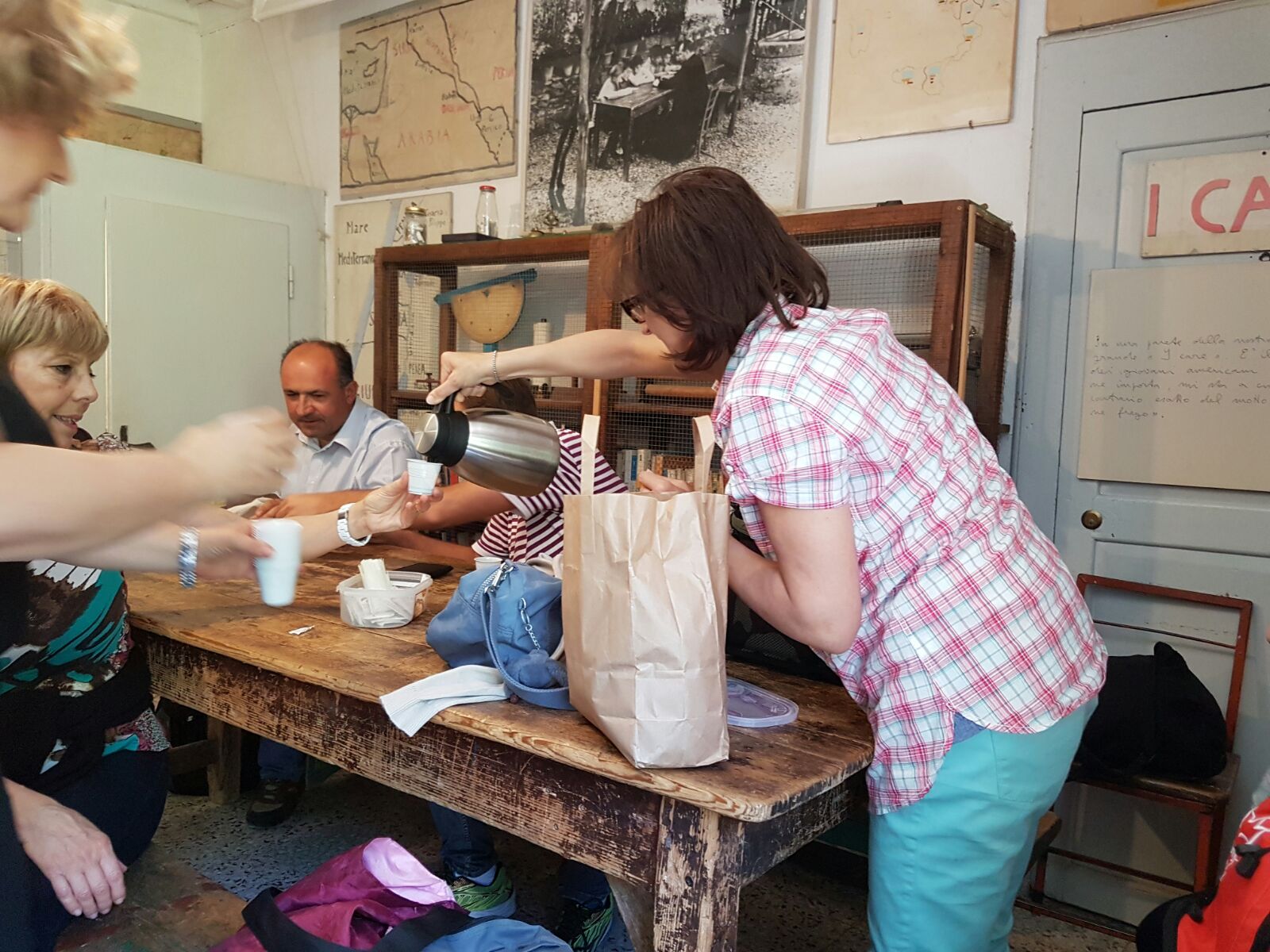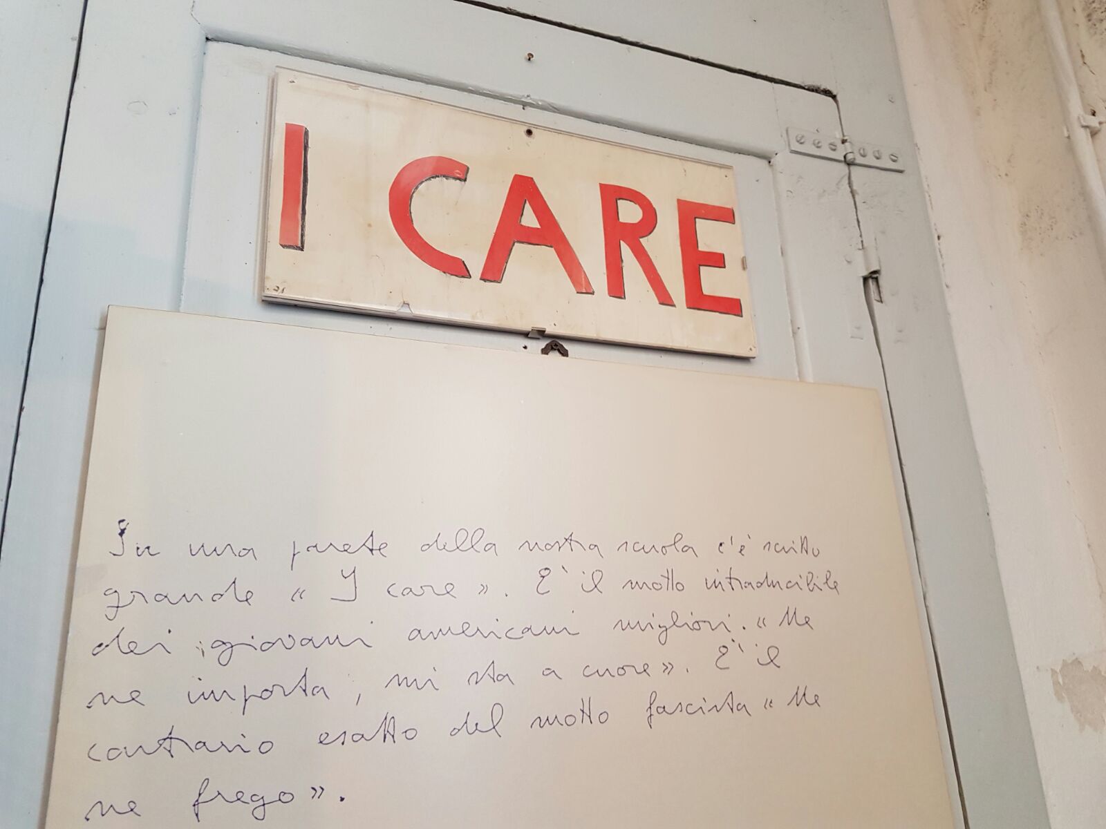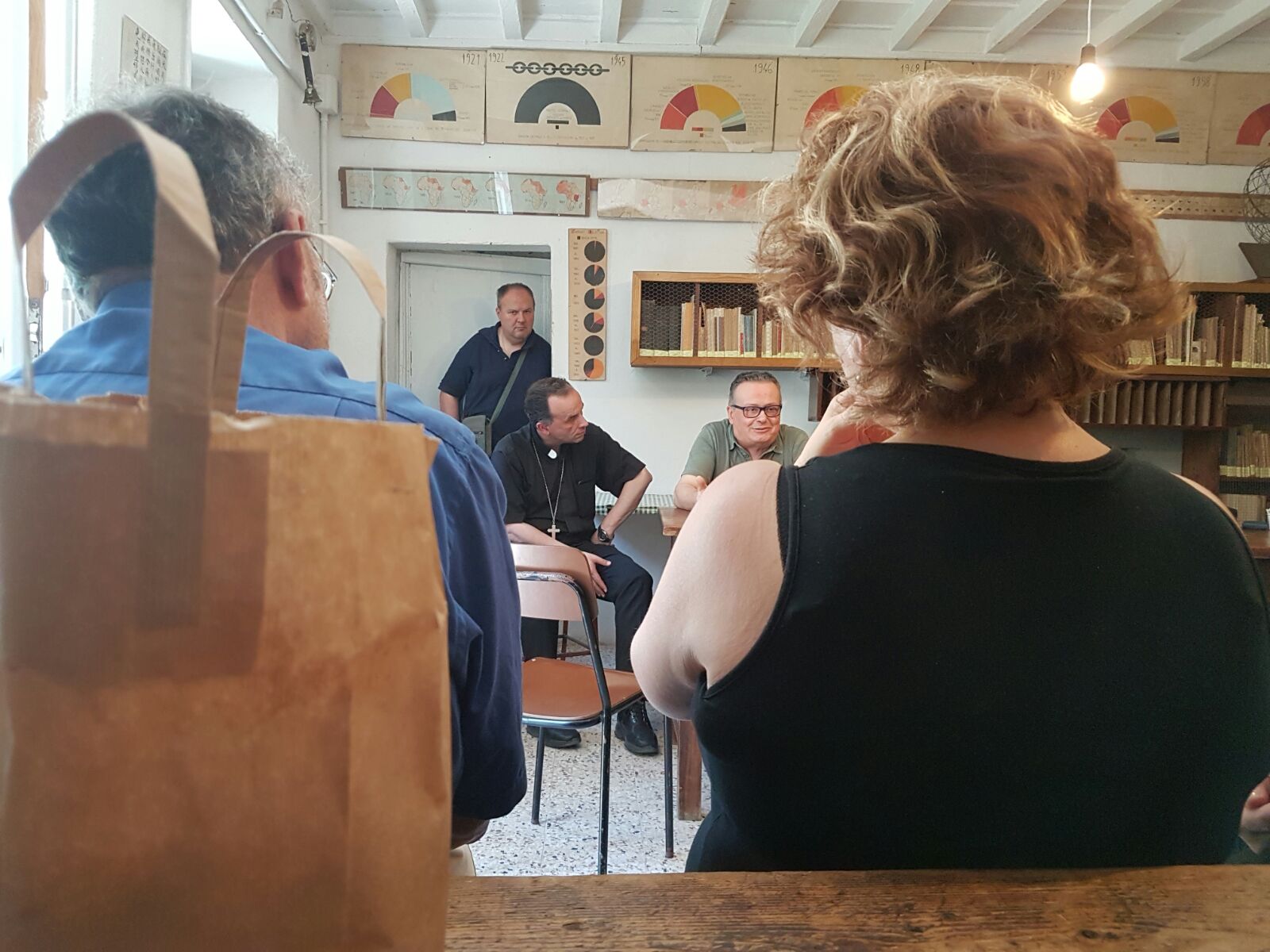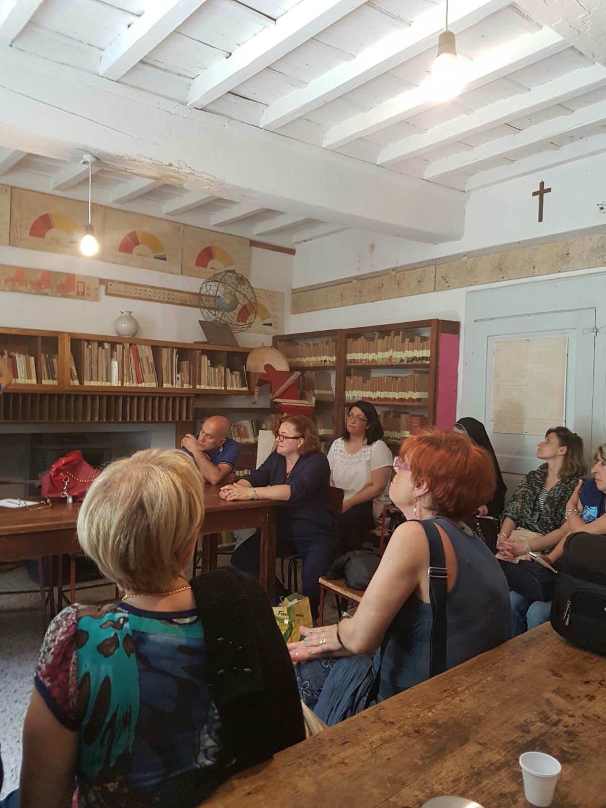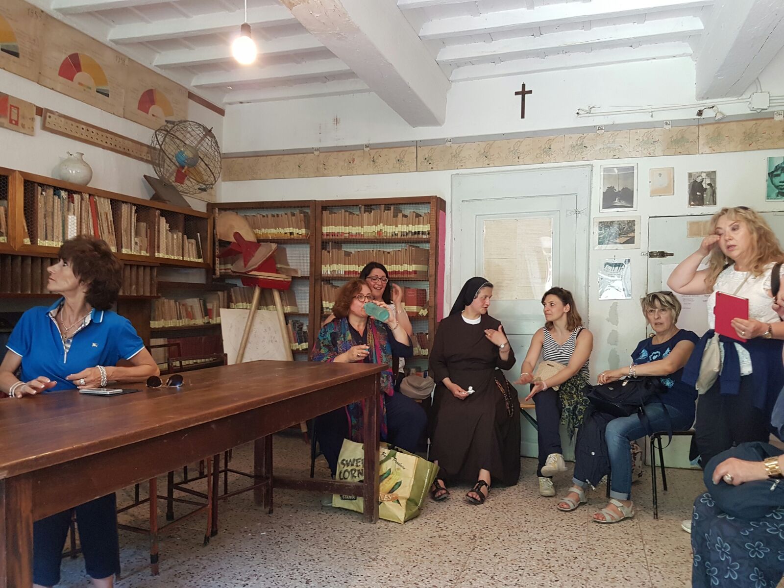 Ma in che modo insegnava questo prete toscano così “diverso” dagli altri? Gli insegnanti hanno potuto scoprirlo visitando gli ambienti nei quali i ragazzi, maschi e femmine insieme, vivevano per circa dodici ore al giorno: l’aula, il laboratorio, la chiesetta contenente il mosaico del “monachello scolaro”. Colpisce il vedere le pareti dell’aula piene dei lavori svolti dagli alunni di don Milani, dalle cartine geografiche narranti la storia del fascismo in Europa, ai grafici di politica e di statistica.