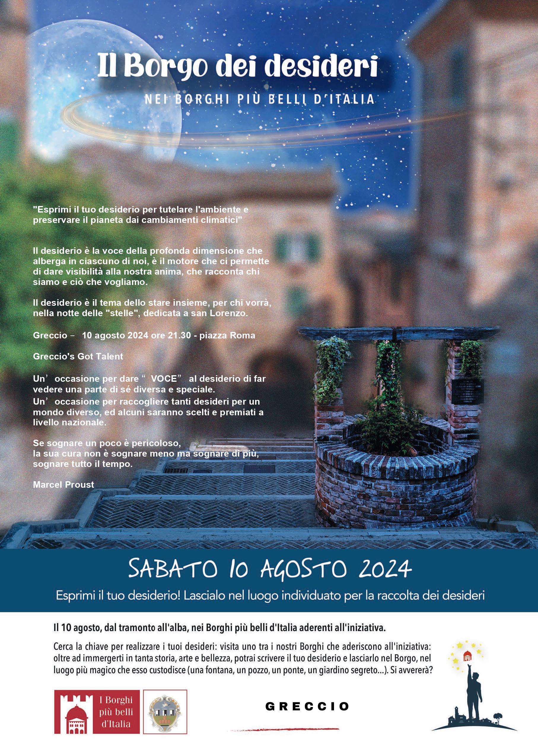 Il circuito dei “Borghi più belli d’Italia”, a cui anche Greccio appartiene, ha lanciato un’originale iniziativa per il 10 agosto, giorno dedicato a San Lorenzo, tradizionalmente legato all’osservazione delle stelle cadenti e ai desideri che in tale occasione vengono espressi. Nella piazza principale di Greccio, dalle ore 21.30, coloro che vorranno potranno scrivere un desiderio su un apposito cartoncino legato al tema scelto dall’organizzazione dei “Borghi”, “Esprimi il tuo desiderio per tutelare l’ambiente e preservare il pianeta dai cambiamenti climatici”. I desideri verranno consegnati all’interno del “Greccio’s Got Talent”, a cui tutti i cittadini possono partecipare, organizzato dalla parrocchia S. Maria di Loreto di Limiti di Greccio.