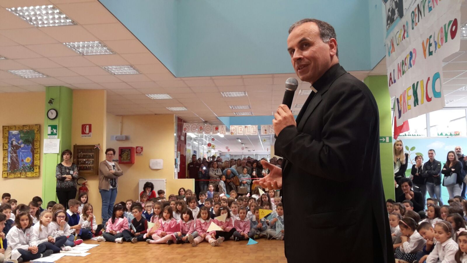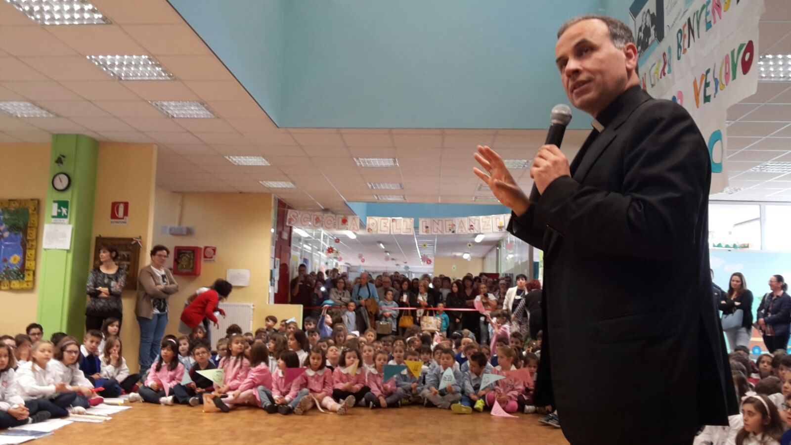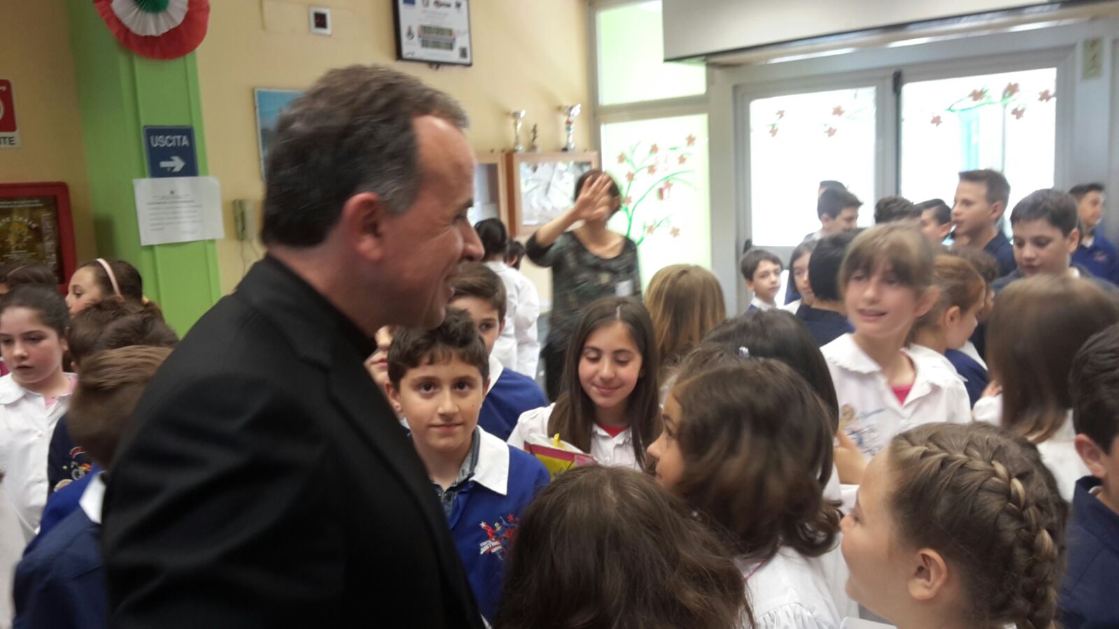 Visita stamattina del vescovo Domenico presso il plesso Falcone-Borsellino (facente parte dell’istituto comprensivo Pascoli), dove i bambini dell’Infanzia e della Primaria lo hanno accolto con canti e musiche.