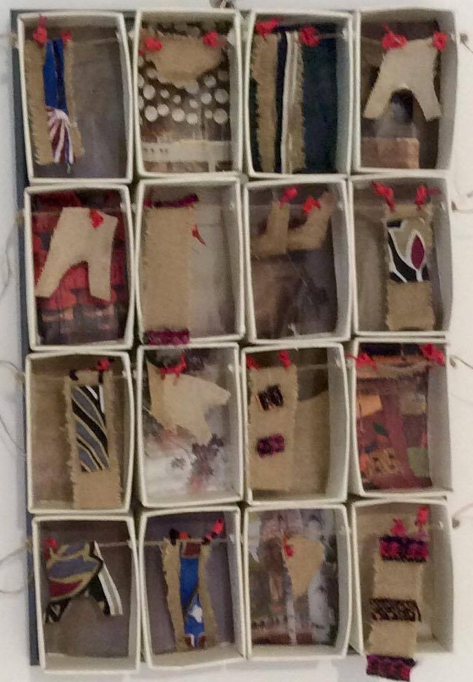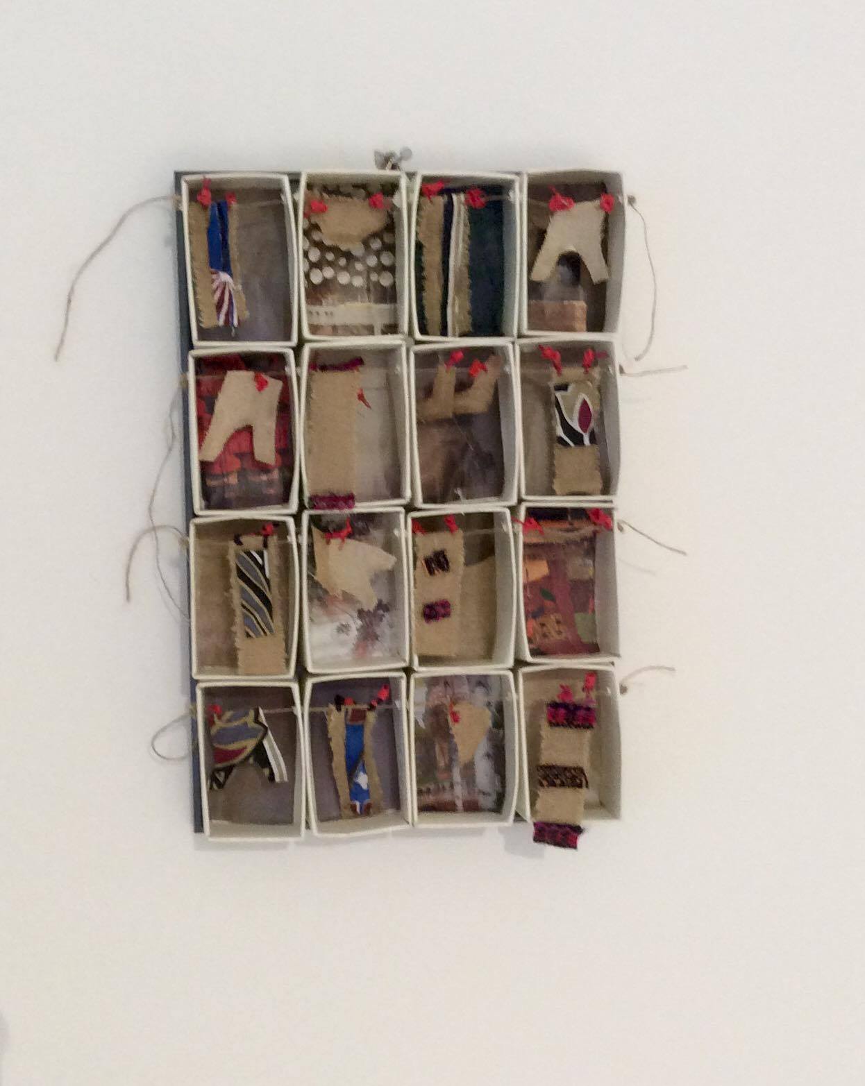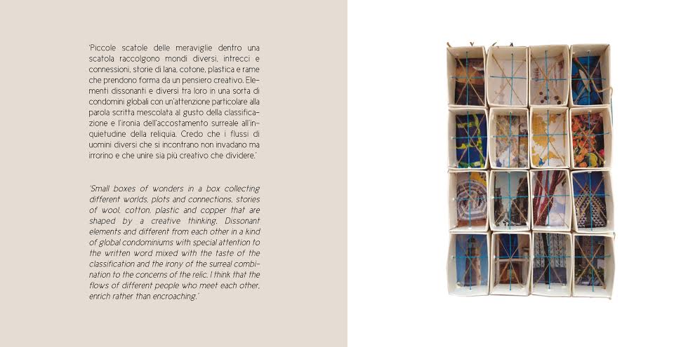 La mostra si snoda attraverso una serie di ‘(…) piccole scatole delle meraviglie dentro una scatola che raccolgono mondi diversi, intrecci e connessioni, storie di lana, cotone, plastica e rame che prendono forma da un pensiero creativo. Elementi dissonanti e diversi tra loro in una sorta di condomini globali con un’attenzione particolare alla parola scritta mescolata al gusto della classificazione e l’ironia dell’accostamento surreale all’inquietudine della reliquia. Credo che i flussi di uomini diversi che si incontrano non ’invadano’ ma ‘irrorino’ e che unire sia più creativo che dividere’.