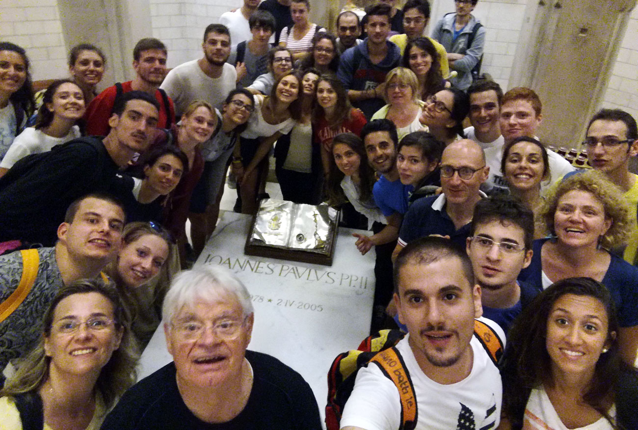Bellissimo l’incontro, tutti insieme, con i ragazzi che assieme a padre Luca, don Roberto e don Domenico (il vescovo!) da Rieti sono venuti a Cracovia in pellegrinaggio. È il loro momento di incontrare la storia, di confrontarsi con la vita.