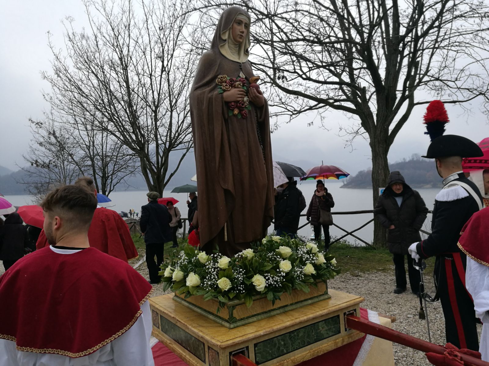 La tradizionale processione con le reliquie e con la statua di Santa Filippa verso il lago si è svolta sotto la pioggia. Seguendo un uso consolidato, le Suore di Santa Filippa hanno posato sulle acque del Turano una corona dei fiori in corrispondenza del luogo in cui, negli anni ‘40, è stato sommerso l’antico monastero.