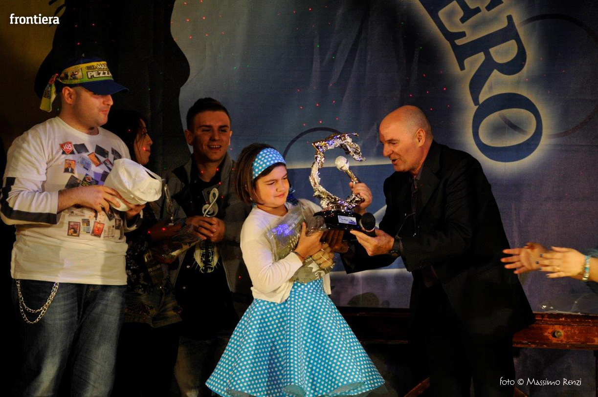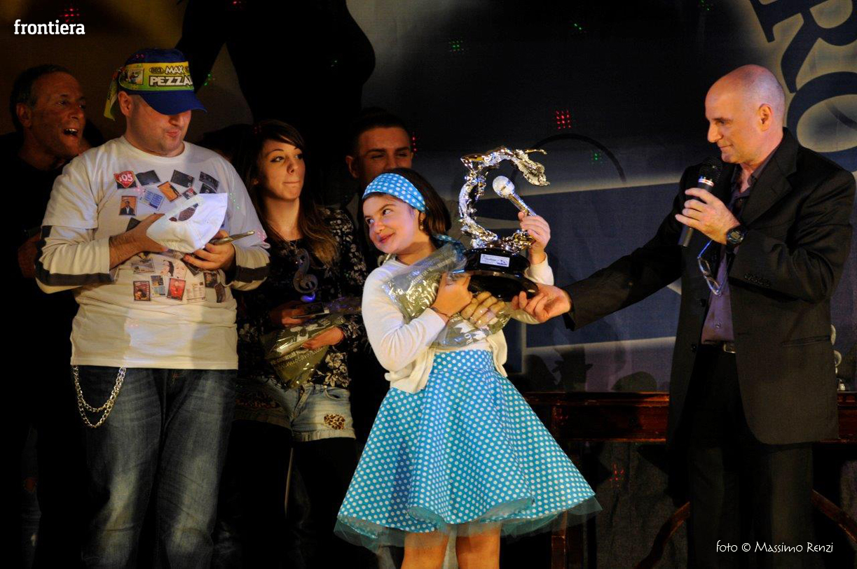 Alla fine l’ha spuntata Rachele Tomassoni, otto anni di Rieti con la canzone “Brava” portata al successo nel 1965 da Mina. Rachele la vedremo presto sui programmi Mediaset (LA5) nella trasmissione “Tra sogno e realtà”. Al secondo posto Cristina Gianni di Lugnano con la canzone “Il cerchio della vita” di Ivana Spagna, al terzo posto Arianna Ranalli (13 anni) di Monterotondo con “Greatest love of all” di Whitney Houston, al quarto Dino Battisti con “Tappeto di fragole” dei Modà, al quinto Aurora Carnevale con “Someone like you” di Adele. Ad Aurora un ringraziamento particolare per la sua partecipazione in quanto presente anche se non al meglio della sua forma fisica.