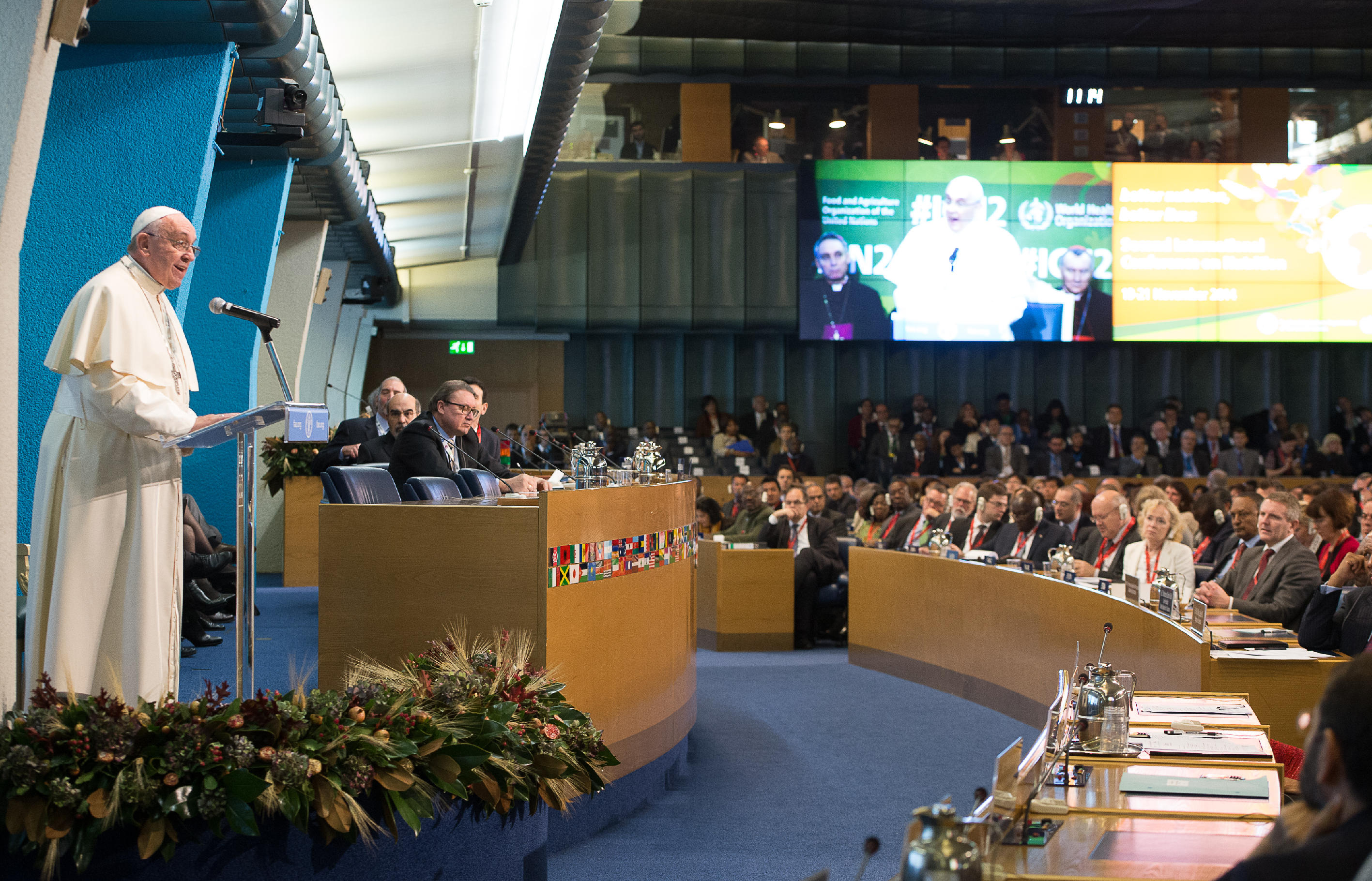 Ventidue anni dopo Giovanni Paolo II, il Papa alla Conferenza internazionale sulla nutrizione. Espressa la consapevolezza che “mentre si parla di nuovi diritti l’affamato è lì, all’angolo della strada”. Pressante invito a non fare del cibo una merce e di essere “liberi da pressioni politiche ed economiche”. Ribadito il “paradosso dell’abbondanza”: “C’è cibo per tutti, ma non tutti possono mangiare”.