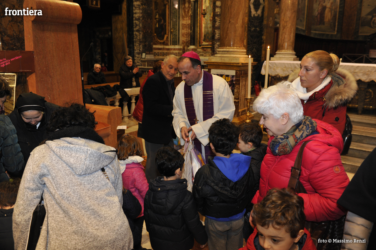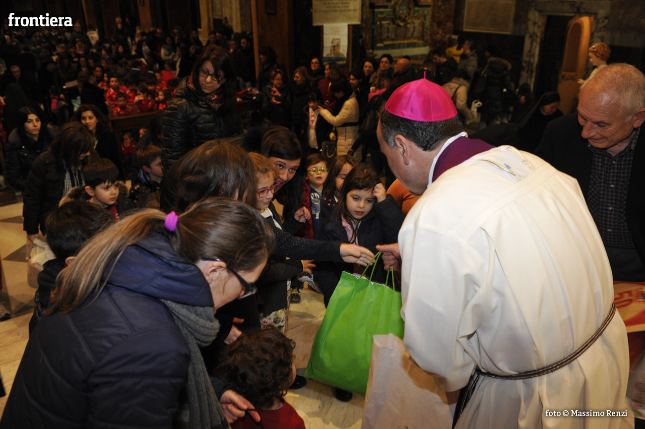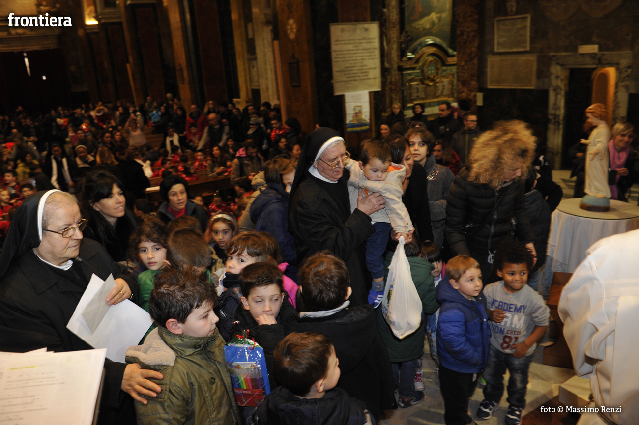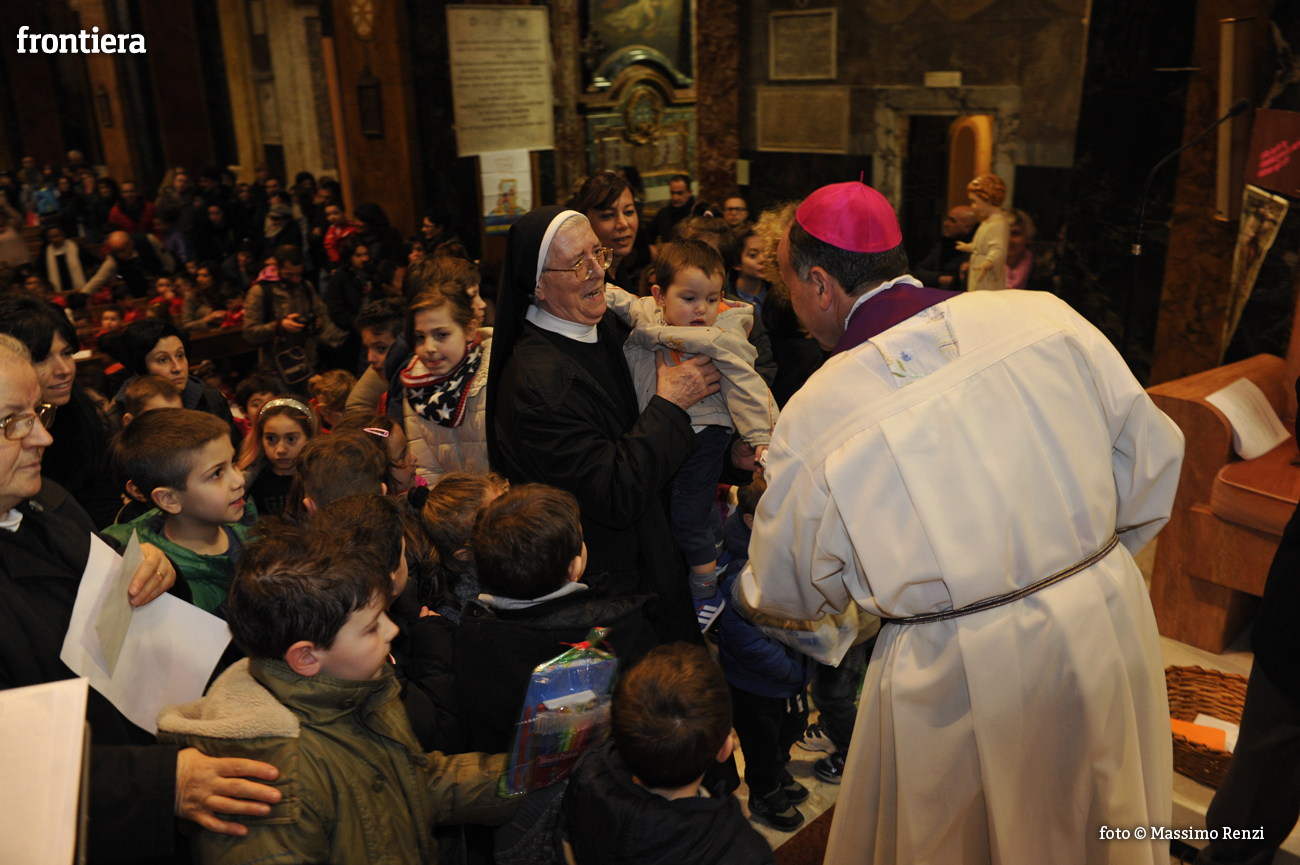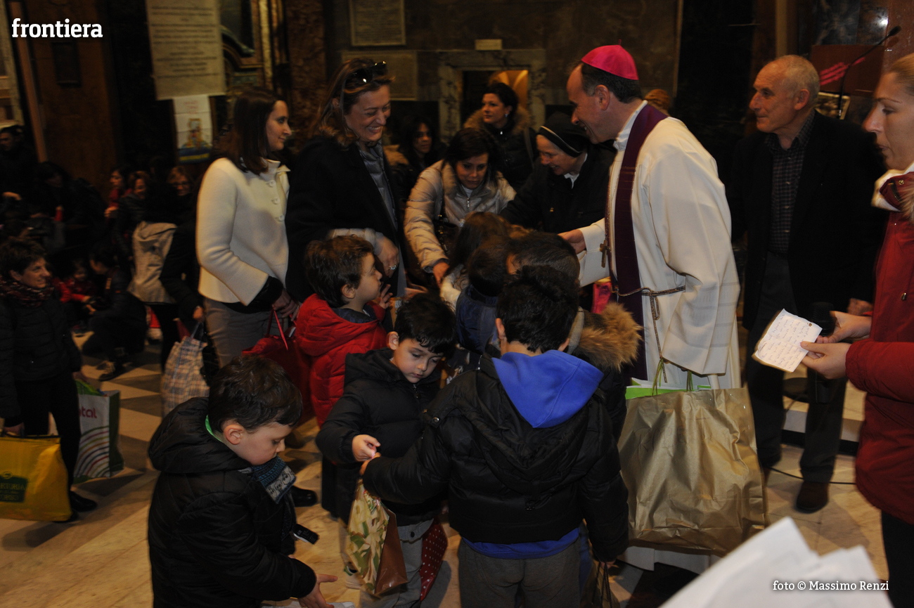 A loro le offerte in denaro e gli impegni di sostegno a distanza, mentre i pacchi con giocattoli e materiale didattico (che sarebbe troppo costoso spedire nel Terzo mondo) vengono indirizzati a bimbi bisognosi del posto. Li hanno presentati nelle mani del vescovo, accompagnati da un piccolo pensiero letto dinanzi a tutti, i gruppi delle scuole cattoliche (Istituto Bambin Gesù, Divino Amore, S. Lucia, Maestre Pie Venerini e Maraini di Rieti, oltre alla materna S. Chiara di Santa Rufina) e le rappresentanze di alcune parrocchie (Regina Pacis, Sacro Cuore, S. Michele Arcangelo).