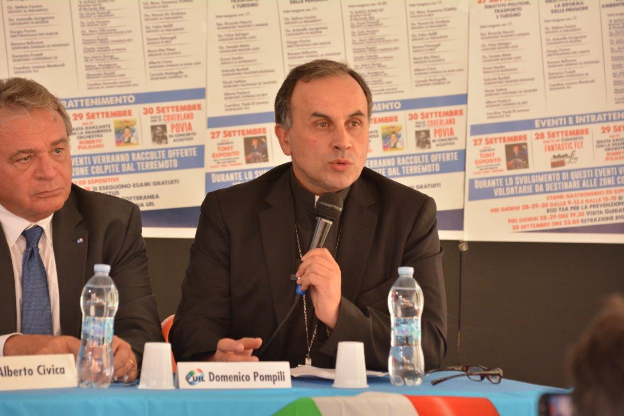 È sul filo di questo discorso che il vescovo Domenico ha portato il suo saluto al dibattito dedicato al tema della “Ricostruzione” compreso nella tre giorni “Incontriamoci” promossa dalla Uil di Rieti. «Un momento di confronto molto appropriato e concreto» ha riconosciuto mons. Pompili, ricordando quanto «la tragedia del 24 agosto abbia cambiato irreparabilmente qualcosa del nostro territorio».