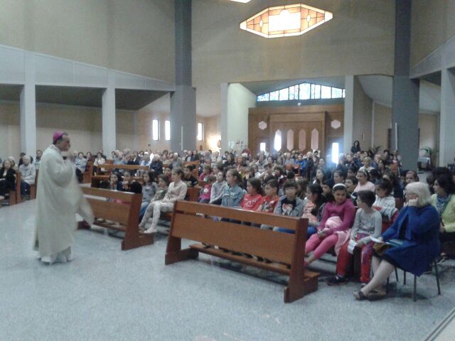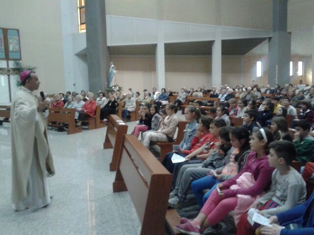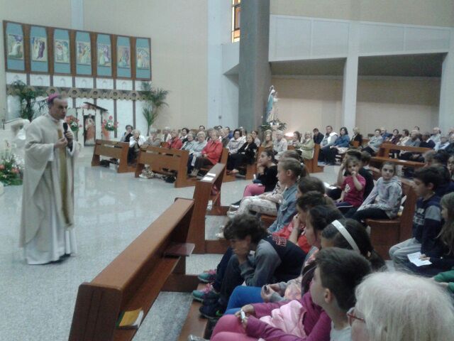 Anche il vescovo Domenico, rimasto alla sede in presbiterio al termine della Messa del Sacro Cuore, si è unito ai fanciulli nei gesti che animavano il canto con cui hanno voluto concludere il momento di festa che segnava per loro la chiusura dell’anno pastorale: “Annunceremo che tu sei verità, lo grideremo dai tetti delle nostre città, / senza paura anche tu lo puoi cantare…”. Per i bambini dei gruppi del catechismo e dell’Acr di Regina Pacis la festa era iniziata, con giochi e merenda, sin dal primo pomeriggio, concludendosi con la partecipazione alla celebrazione solenne in chiesa, insieme ai genitori e ai parrocchiani, in particolare le zelatrici dell’Apostolato della Preghiera che il giorno prima, a chiusura del triduo in onore del Sacro Cuore, avevano rinnovato il proprio impegno di consacrazione.
