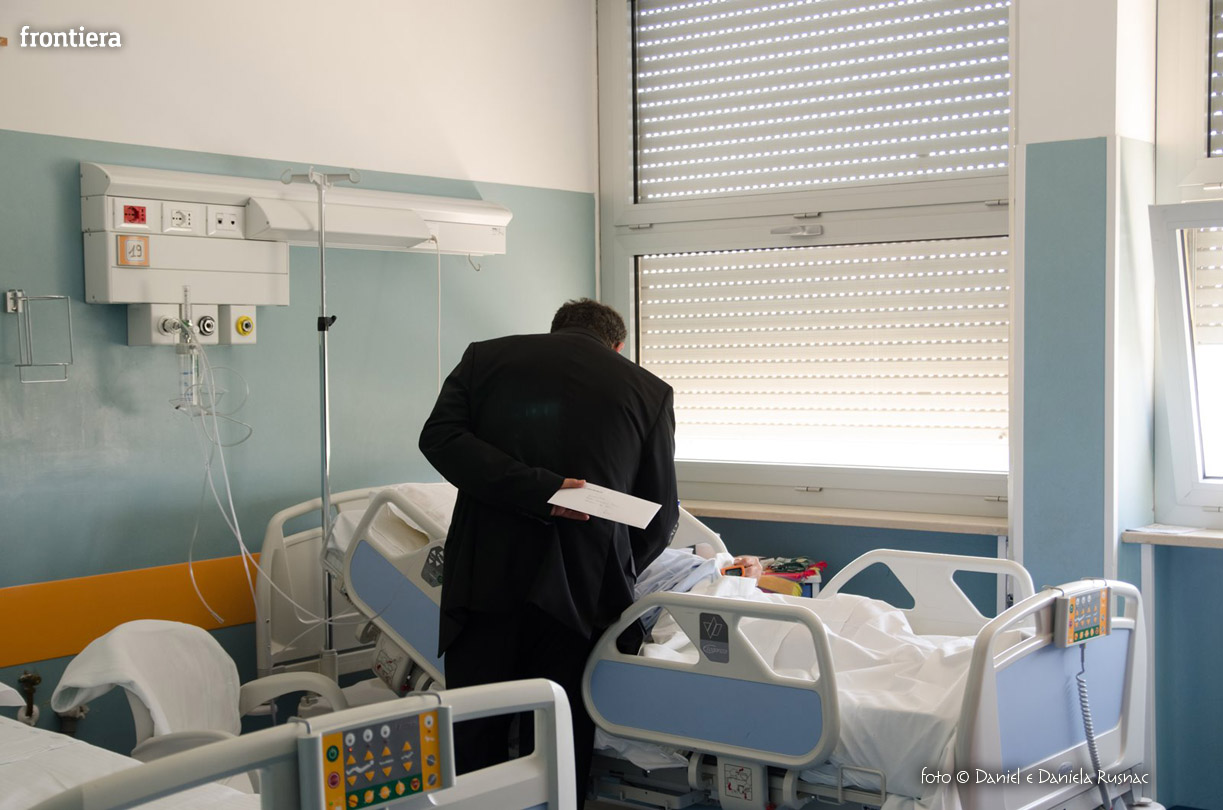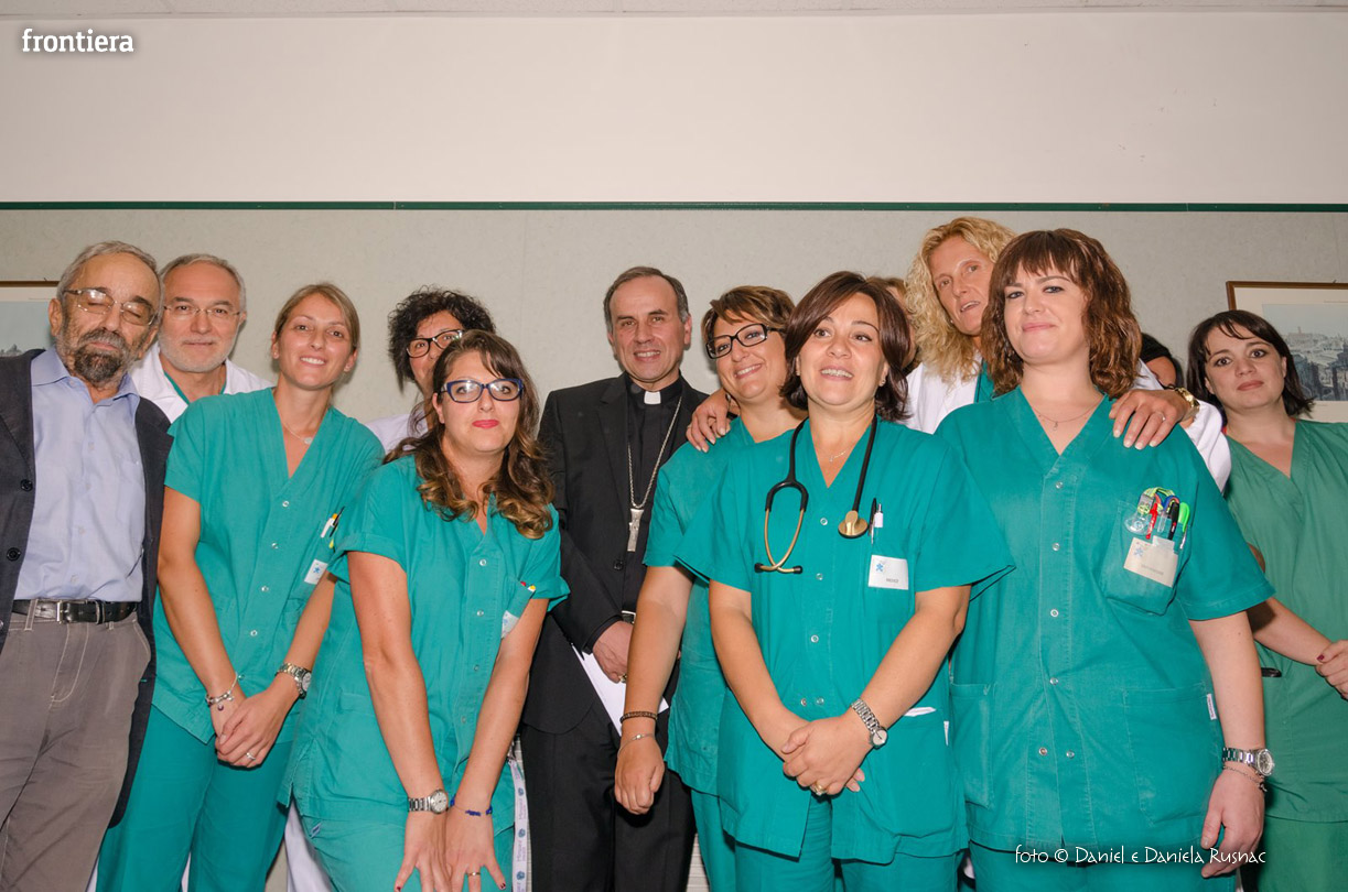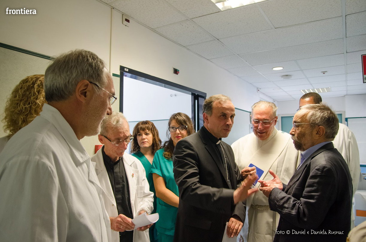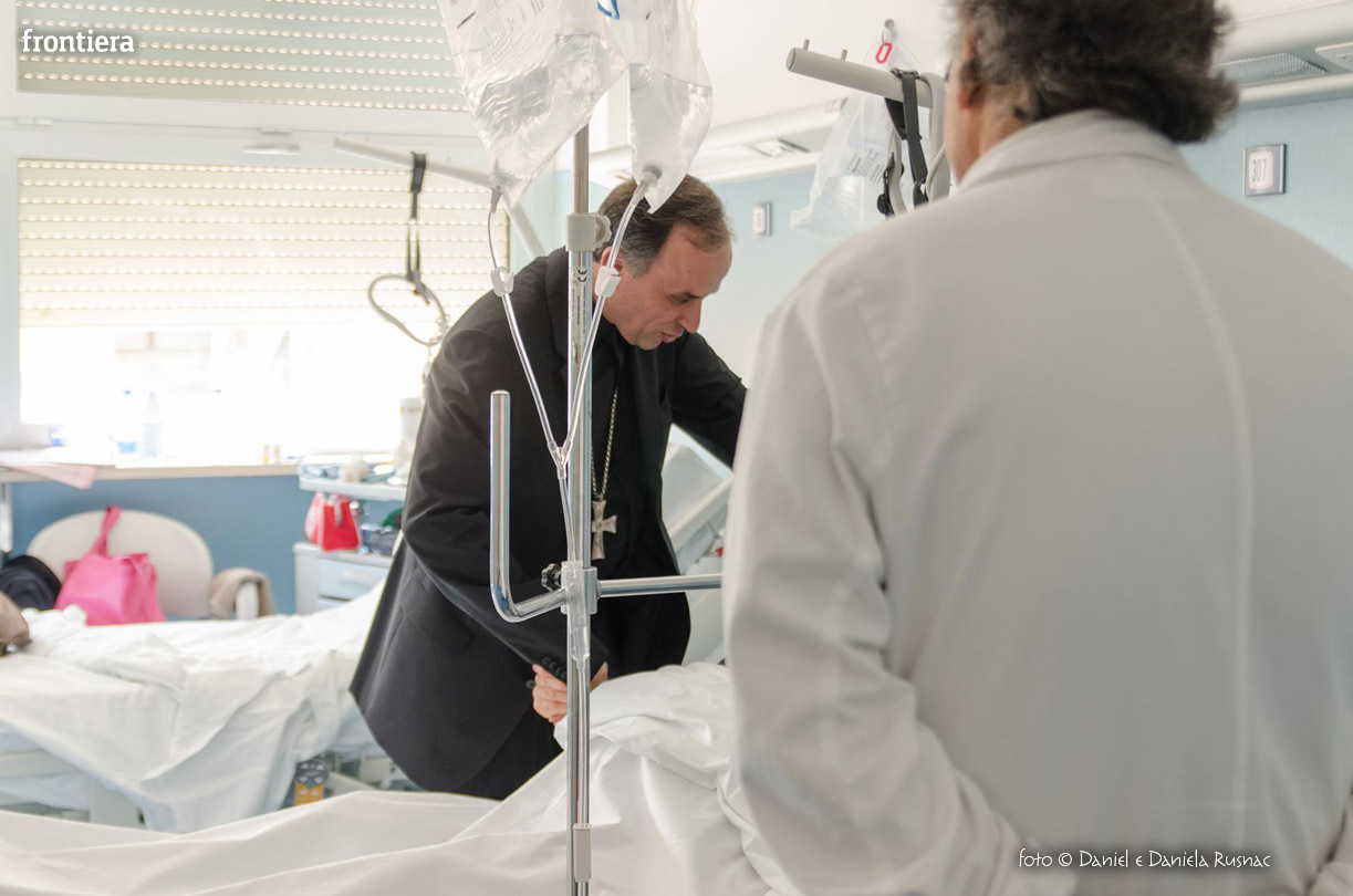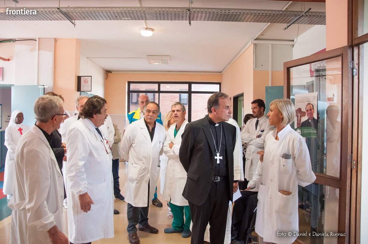 Un momento di preghiera che ha preceduto la visita pastorale ai malati ricoverati al San Camillo de Lellis. Un passaggio nei vari reparti «di indicibile tenerezza» – per usare le parole del diacono Nazzareno Iacopini, responsabile di quella che il vescovo ha chiamato la “Pastorale della Cura” – che ha visto il presule entrare a contatto con le realtà di Emodinamica-Utic, Dialisi, Oncologia, Pediatria, Week Surgery, Ortopedia, Centro trasfusionale e Radioterapia.