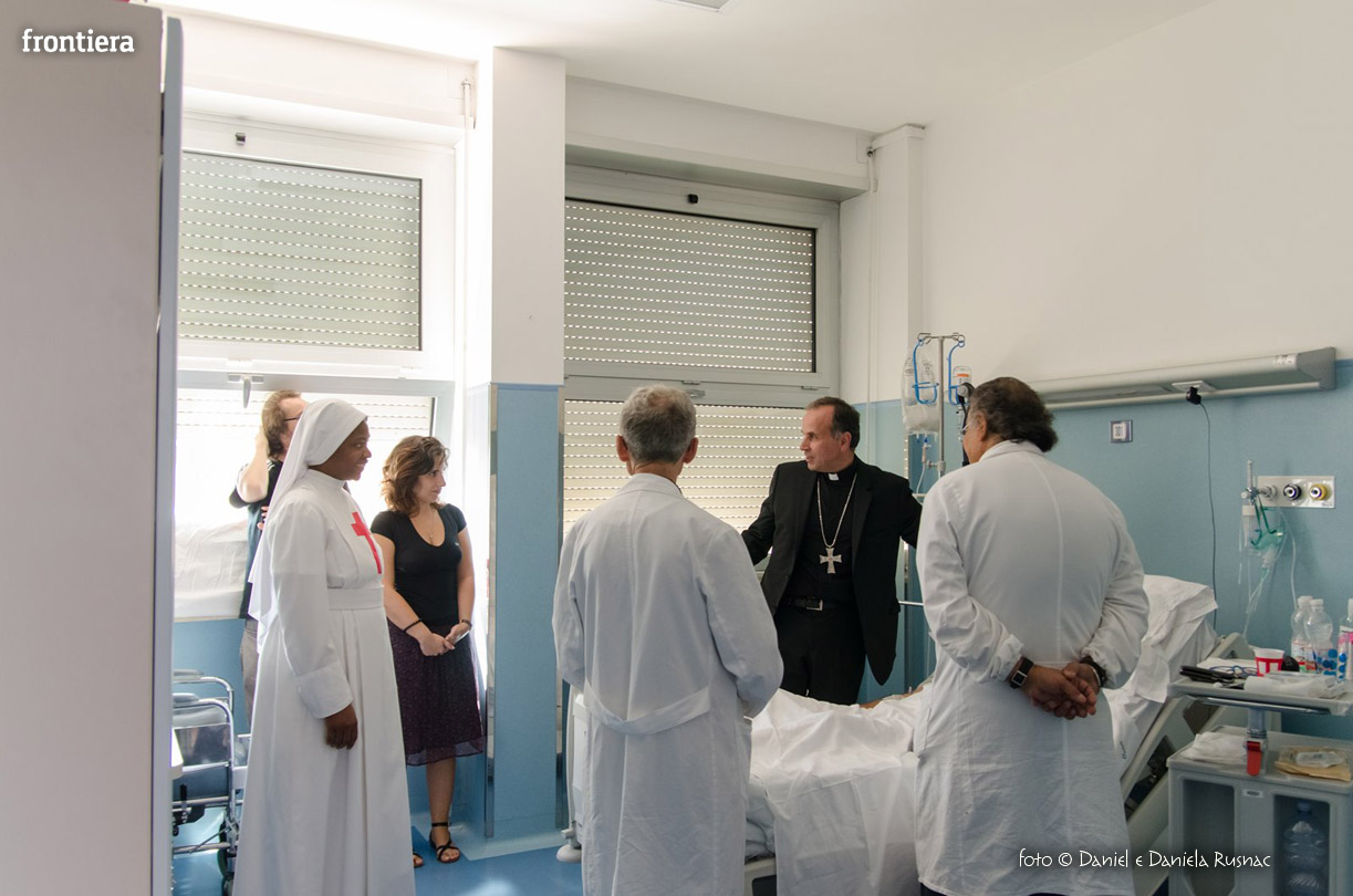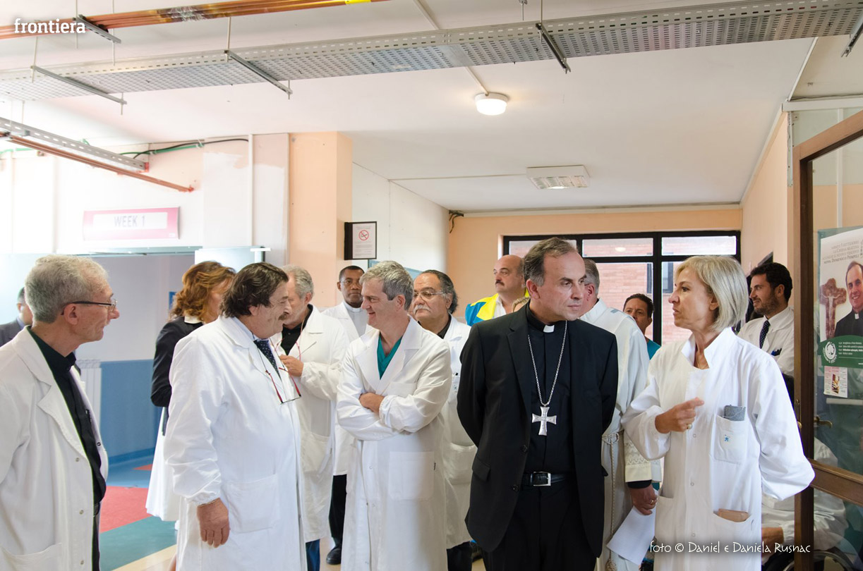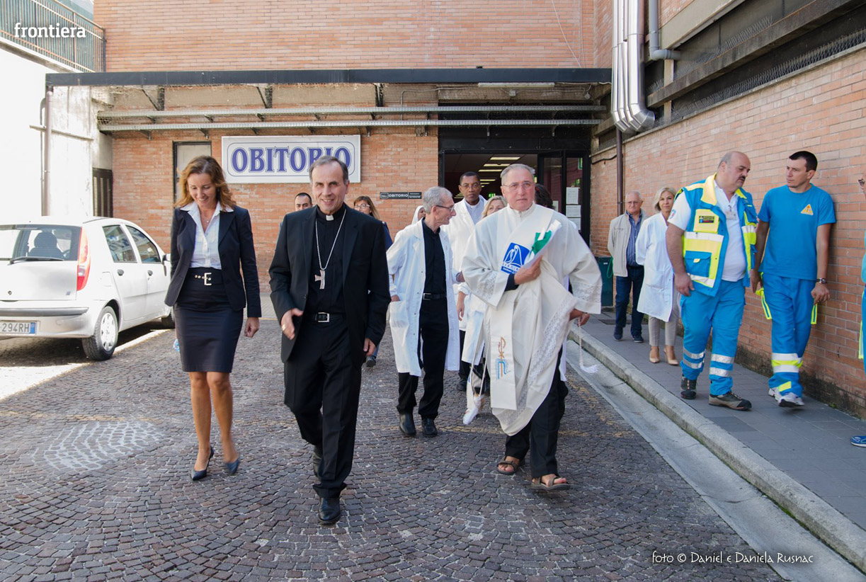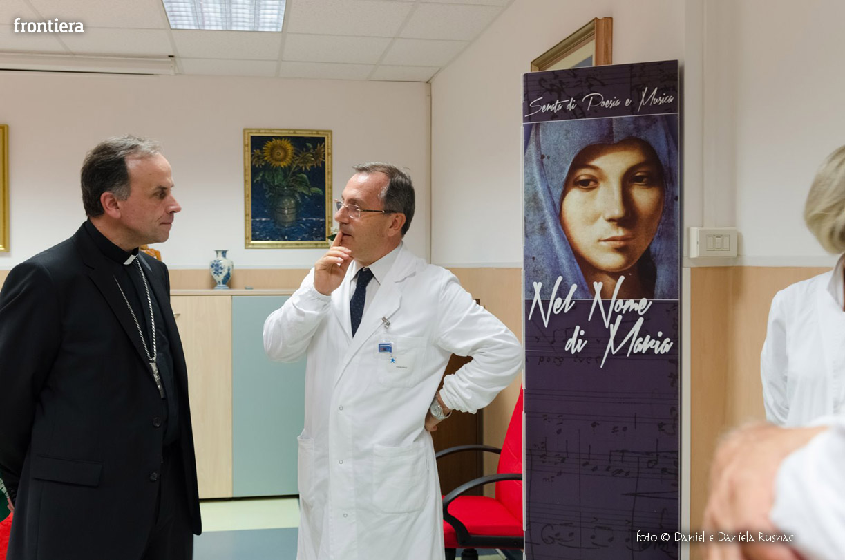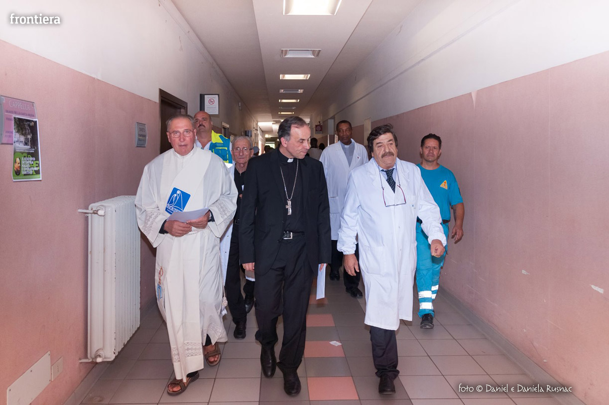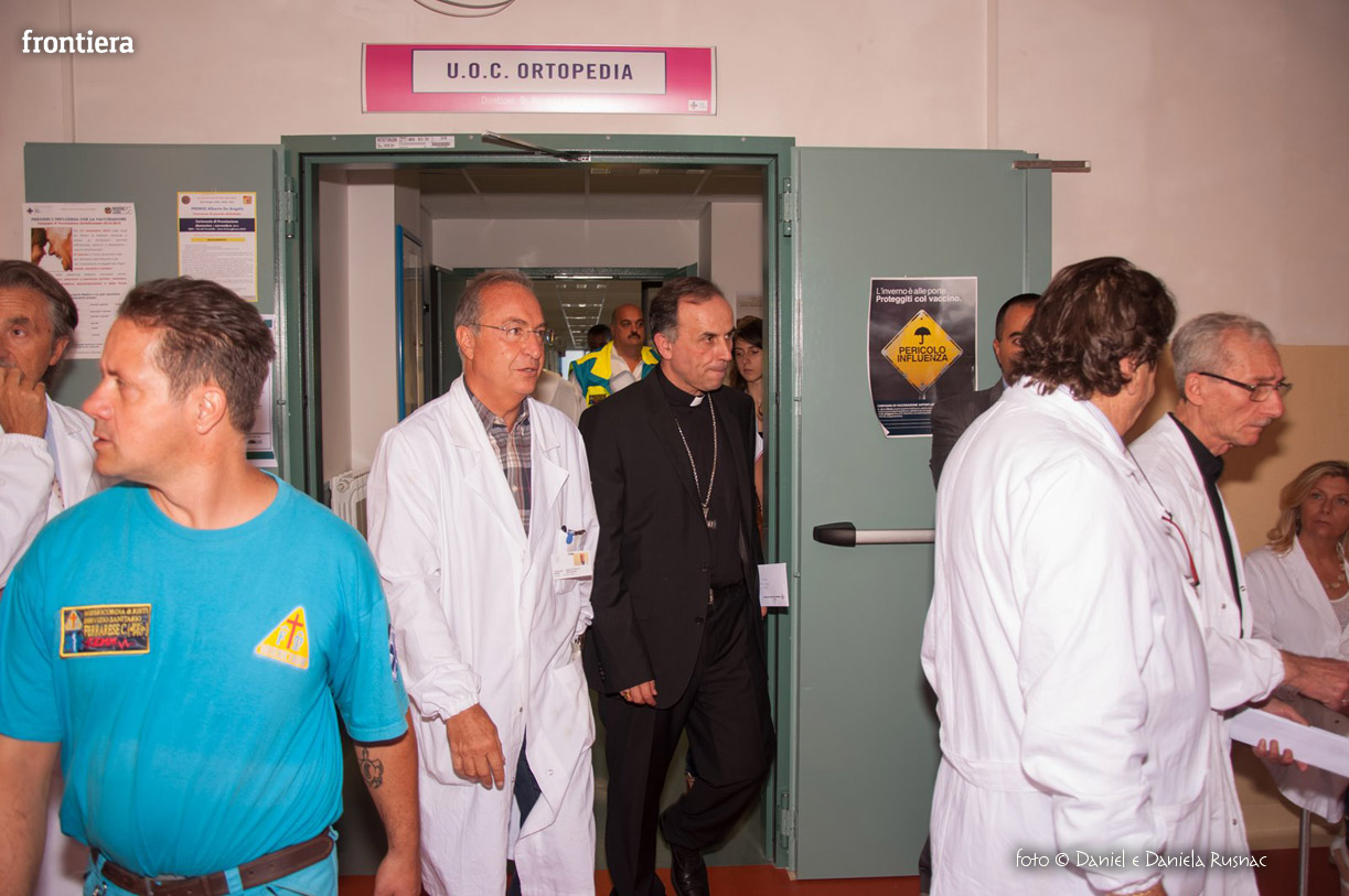 Un momento di preghiera che ha preceduto la visita pastorale ai malati ricoverati al San Camillo de Lellis. Un passaggio nei vari reparti «di indicibile tenerezza» – per usare le parole del diacono Nazzareno Iacopini, responsabile di quella che il vescovo ha chiamato la “Pastorale della Cura” – che ha visto il presule entrare a contatto con le realtà di Emodinamica-Utic, Dialisi, Oncologia, Pediatria, Week Surgery, Ortopedia, Centro trasfusionale e Radioterapia.