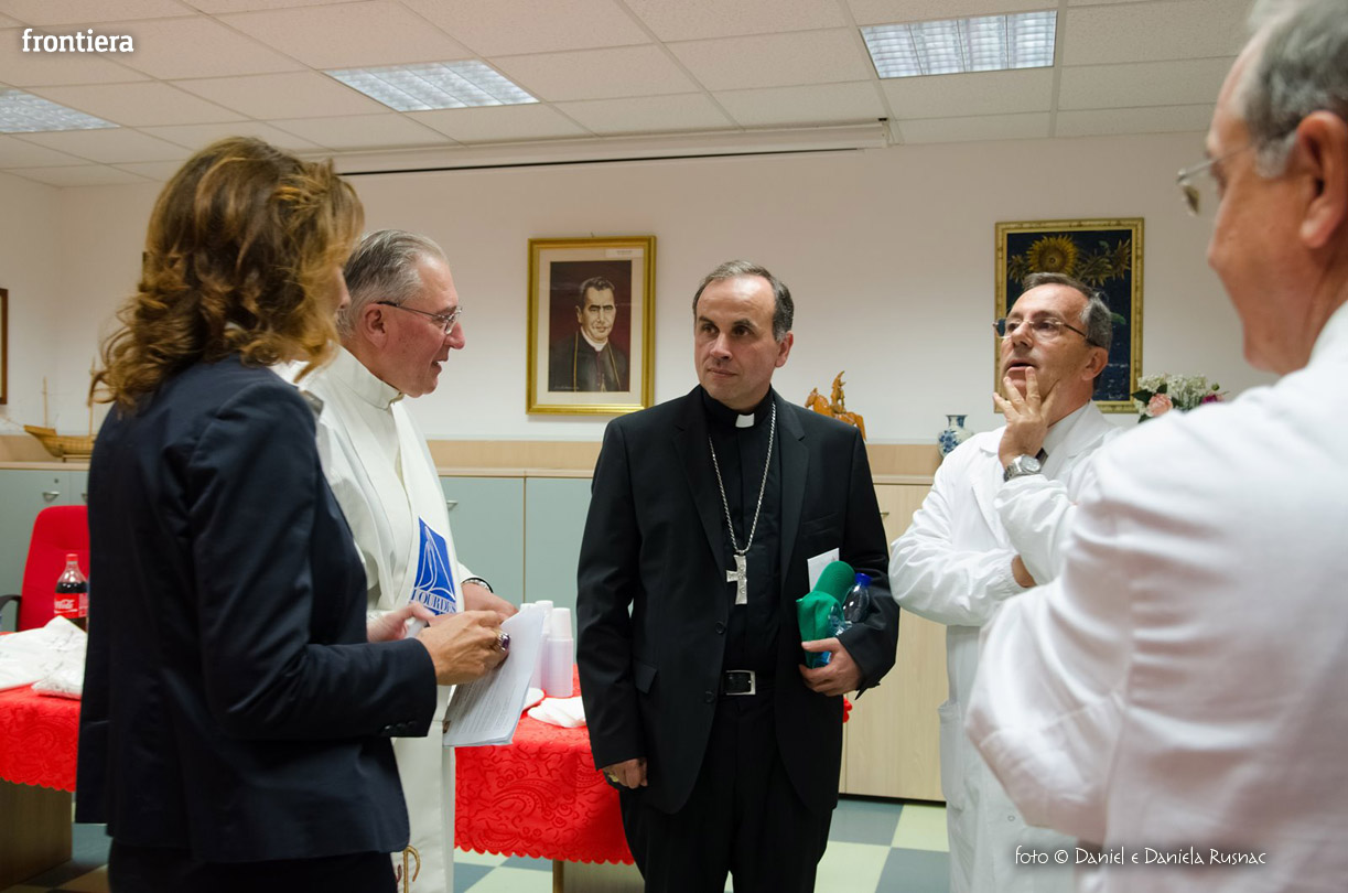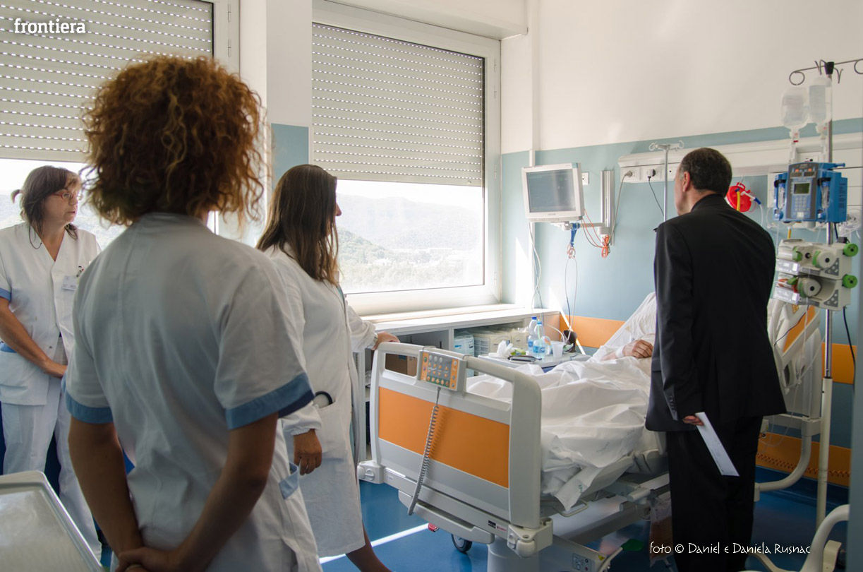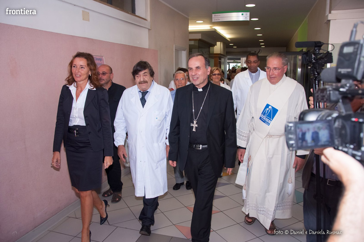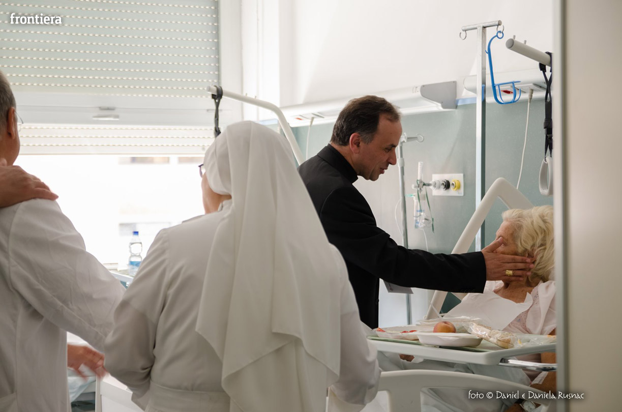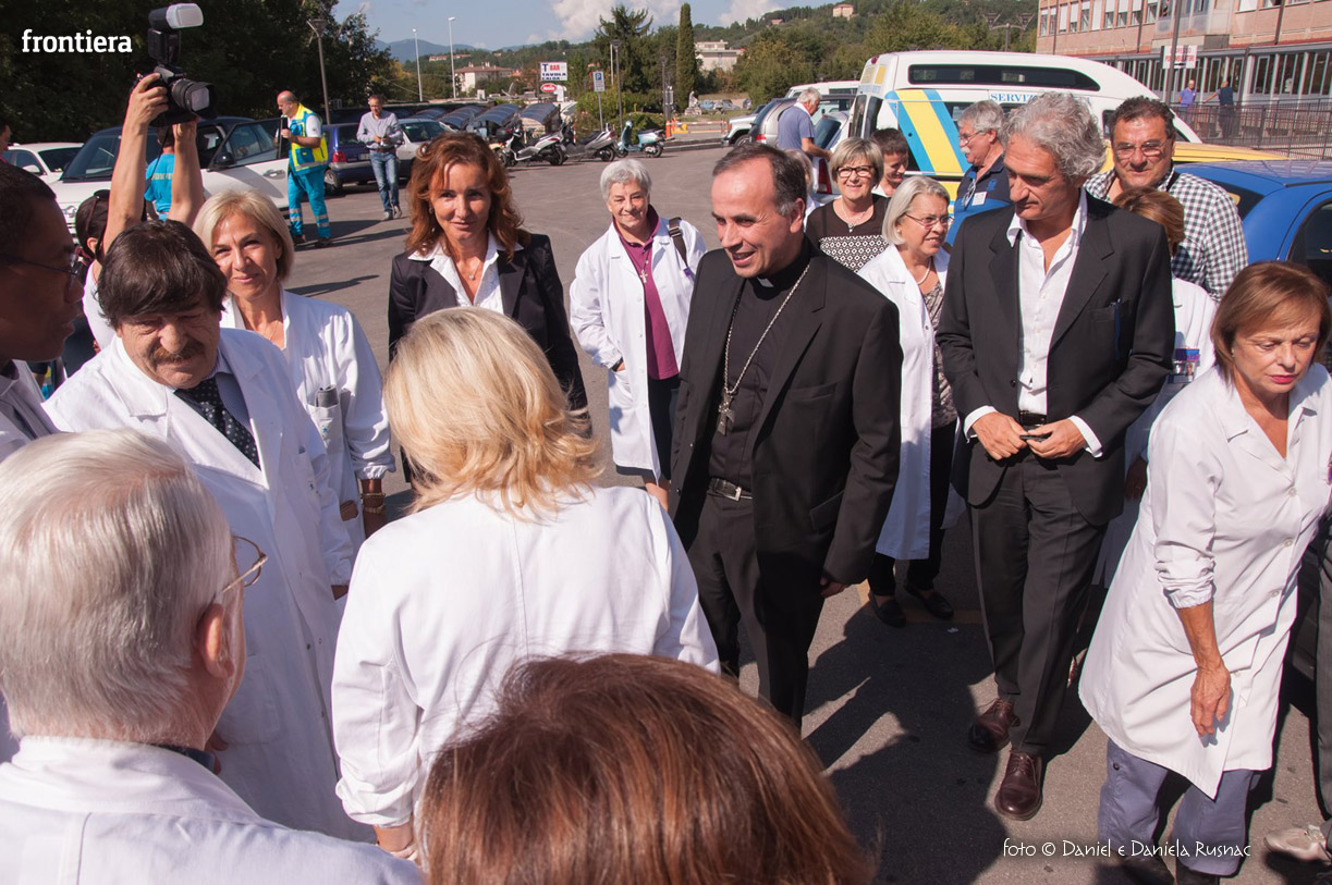 Un momento di preghiera che ha preceduto la visita pastorale ai malati ricoverati al San Camillo de Lellis. Un passaggio nei vari reparti «di indicibile tenerezza» – per usare le parole del diacono Nazzareno Iacopini, responsabile di quella che il vescovo ha chiamato la “Pastorale della Cura” – che ha visto il presule entrare a contatto con le realtà di Emodinamica-Utic, Dialisi, Oncologia, Pediatria, Week Surgery, Ortopedia, Centro trasfusionale e Radioterapia.