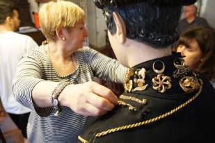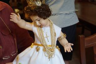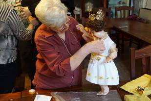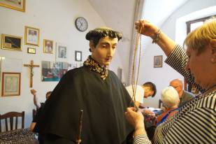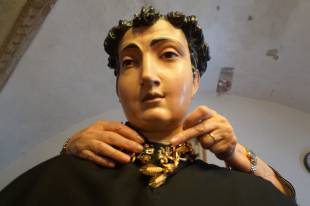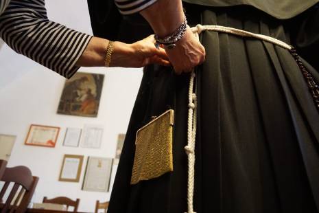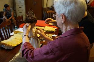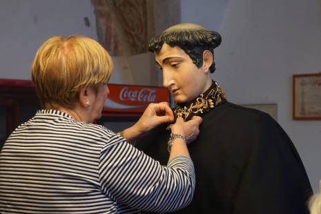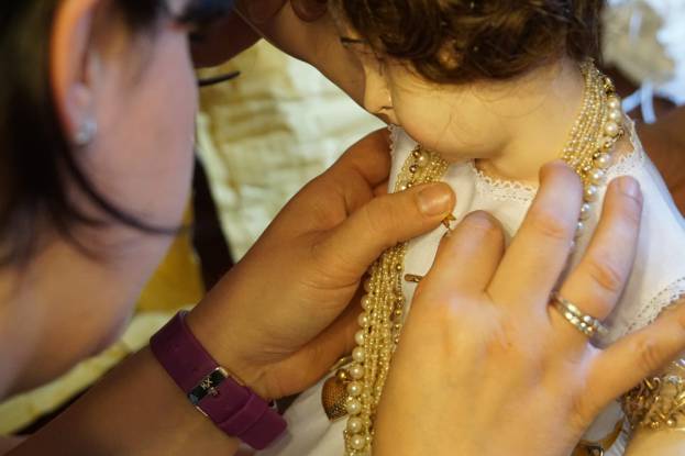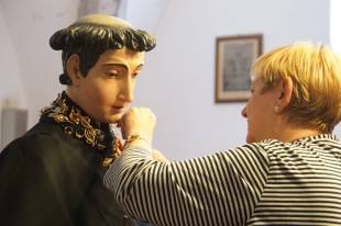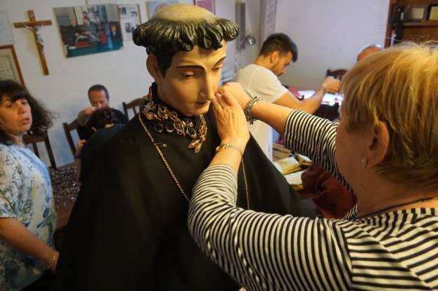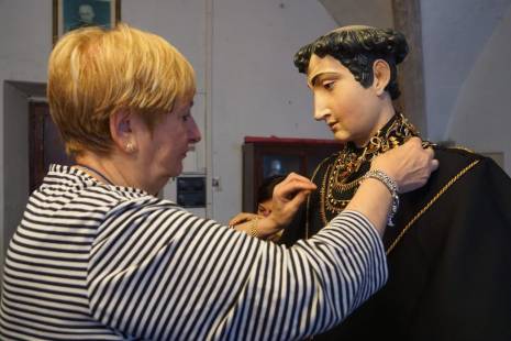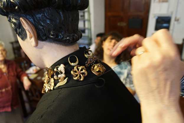 «Per appuntare l’oro usiamo spille ma rinforziamo anche con fili da cucito, per estrema sicurezza. La procedura è sempre la stessa da tantissimi anni: prima mettiamo l’abito alla statua, poi il colletto, a seguire le collanine più antiche intorno al collo, poi man mano quelle più lunghe che vanno a decorare il busto incluse quelle formate da anelli, ai lati ci sono invece i cuori ex voto e i coralli, e ovviamente è immancabile la famosa borsetta d’oro, posizionata sempre nello stesso punto».