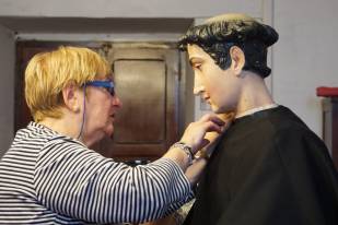 E come da antichissima tradizione, le signore Anna Maria e Maria Pia, coadiuvate da tre ragazze di supporto, si sono messe subito al lavoro per la “vestizione” della statua che sarà esposta al pubblico oggi pomeriggio.