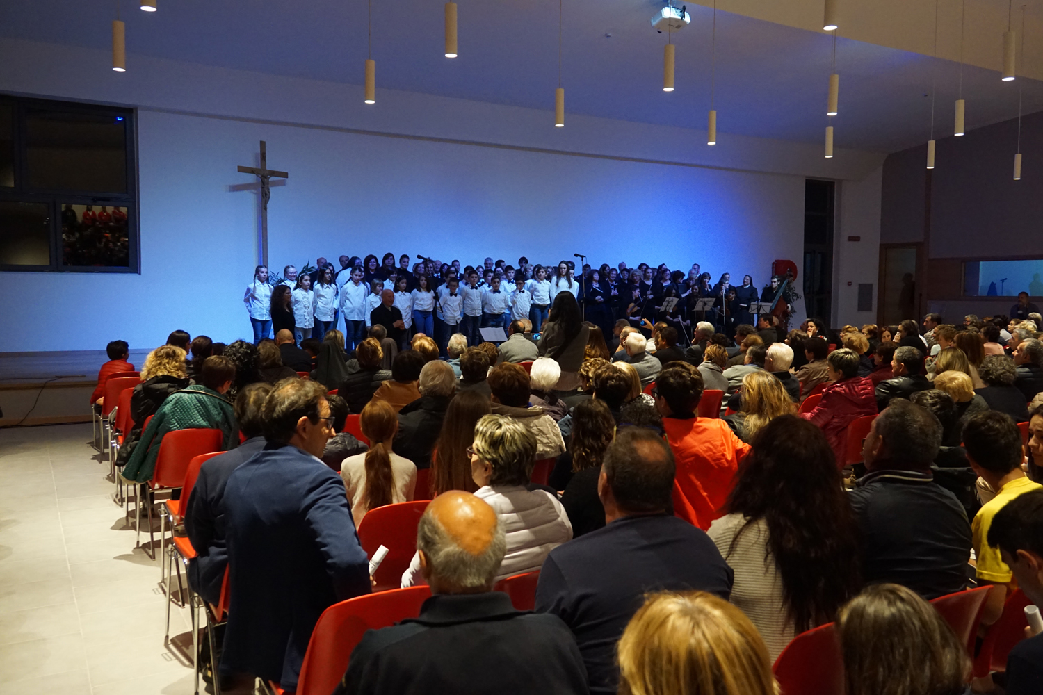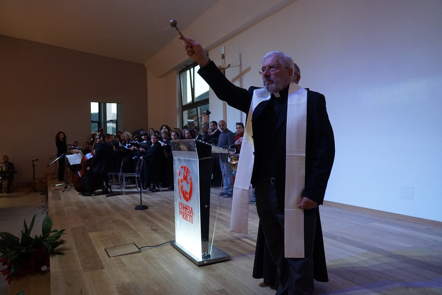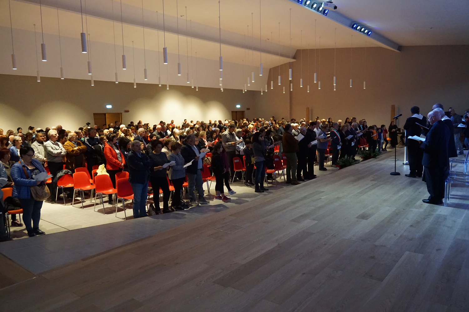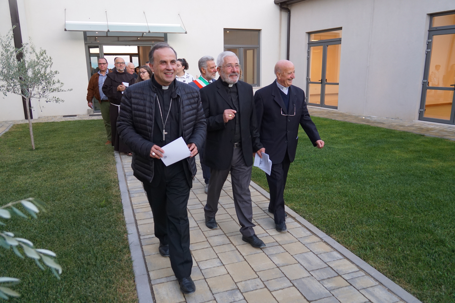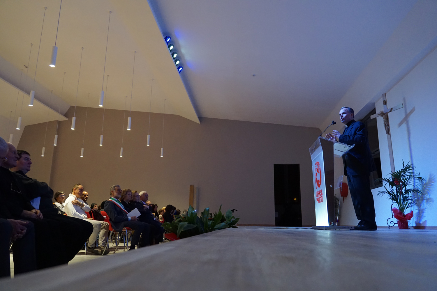 L’ingresso dei convenuti è avvenuto attraverso il bel giardino interno, dal quale prendono luce le aule per il catechismo e le altre attività, disposte su due ali. Un corridoio centrale conduce nel grande salone già sperimentato con i due incontri pastorali diocesani dello scorso settembre e dello scorso anno. Ad accogliere il corteo il canto del coro diocesano, rafforzato da una piccola compagine strumentale di archi e fiati, affidata a giovani e talentuosi musicisti.